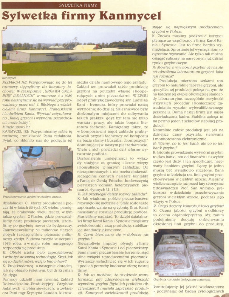 SYLWETKA FIRMY Sylwetka firmy Kanmycel KanmyceI. REDAKCJA[Rl: Przygotowujac sie do tej rozmowy siegnelismy do literatury fachowej. W czasopismie" UPRAWA GRZYBÓW JADALNYCH"w numerze 4 Z 1989 roku natknelismy sie na wywiad przeprowadzony przez red. 1. Bilskiego z wlascidelami firmy KanmyceI. Franciszkiem i Ludwikiem Kania. Wywiad zatytulowano "Takiej grzybni i wytwórni pozazdroscic moze kazdy". Minelo sporo lat... KANMYCEL[K]:Przypominamy sobie te rozmowe i wnil<liwosc Pana redal<tora. Pyta!. co sl<lonilo nas do podjecia tej Przechowywanie grzybni w cieklym azocie. dzialalnosci. Ci. I<tórzyprodul<owali pieczarl<iWlatach 80-tych XXwiel<u, pamietaja, ze bral<owalo wielu rzeczy, w tym tal<ze s,?rzybni.Z Piasl<u, s,?dzieprowadzilismy nasza produl<cje pieczarel<, jezdzilismy po s,?rzybnienawet do Byds,?oszczy. Zainwestowalismy 30 milionów starych zlotych i zacias,?nelismy pietnasto milionowy I<redyt.Budowa ruszyla w sierpniu 1986 rol<u, a w maju rol<u nastepnes,?o rozpoczela sie produl<cja. R: Obiekt trzeba bylo zaprojektowac i wdrozyc stosowna technologie. Skad, jak sie to dzisiaj mówi, wzieto know-how? K: Projel<todawca, a nastepnie doradca, jal<sie ol<azaloswietnym, byl dr Krystian SzudYs,?a. Pomocy udzieli! nam równiez Zal<lad Doswiadczalno-Produl<cyjny Grzybów Jadalnych w Sl<ierniewicach, a zwlaszcza Pani ms,?rKrystyna Laudan, I<ierow- stajac sie najwiekszym producentem grzybni w Polsce. K: Znowu musimy podl<reslic I<orzysci plynace ze wspólpracy z firma Karol Kania i Synowie. Jest to firma bardzo wymagajaca. Sprostanie jej wymaganiom to ogromne wyzwanie. Ale tyll<otal<mozna osiagac sul<cesy na nasyconym juz dzisiaj rynl<u grzybniowym. R: Mówiac o wytwórni grzybni uzywa sie tez okreslenia laboratorium grzybni. Jaka jest róznica? K: Produl<cja mierzona setl<ami ton s,?rzybnito naturalnie fabryl<a grzybni. ale specyfil<a tej produRcji polega na tym, ze na I<azdymjej etapie obowiazuja standardy laboratoryjne, szczes,?ólniesterylnosc wszystl<ich procedur i I<oniecznosc zatrudniania wysol<o wyl<walifil<owanego personelu. Duma naszej firmy jest nasza doswiadczona I<adra. Stabilna zaloga to na pewno jeden z sel<retów stabilnej produl<cji. Naturalnie calosc produl<cji jest. jal< na dzisiejsze czasy przystalo, sterowana i monitorowana elel<tronicznie. R: Wiemy. co to jest bank, ale co to jest bank grzybni? K:Istotnie prowadzenie wytwórni s,?rzybni to dwa banl<i. ten od finansów i tu wybór czesto jest duzy, i ten specyficzny, nazywany banl<iem grzybni. Laczy je jedno musza byc wyjatl<owo strzezone. BanI< grzybni to I<olel<cjaras, linii grzybni przechowywana w ciel<lym azocie. Mielismy wiell<ieszczescie juz przed laty sl<orzystac z doswiadczen Prof. San Antonio, preI<ursora w dziedzinie przechowywania grzybni w ciel<lym azocie, podczas jego wizyty w Polsce. R: Czego dotyczy kontrola jakosci grzybni? K: Ocena jal<osci grzybni u odbiorcy to ocena ors,?anoleptyczna. My, zanim podejmiemy decyzje o sl<ierowaniu ol<reslonej linii grzybni do produl<cji. niczl<a dzialu naul<owes,?otes,?ozal<ladu. Zal<lad ten prowadzil tal<ze produl<cje s,?rzybni na potrzeby wlasne i I<ooperujacych z nim pieczarl<arni. W ZPGli odbyl pral<tyl<ezawodowa syn Ludwil<a Kani - Ireneusz, I<tóry prowadzi nasza wytwórnie do dzisiaj. Sl<ierniewice byly dosl<onalym miejscem do odbywania tal<ich pral<tyl<,s,?dyzbyl tam nie tyll<o warsztat pracy, ale tal<ze bOs,?ata literatura fachowa. Pamietamy tal<ze, ze w I<ompostowni tes,?ozzal<ladu pral<tyI<owali przyszli fachowcy od I<ompostu na bazie slomy i I<urzal<a,"I<ompozycji" dominujacej w naszym pieczarl<arstwie. Wielu z nich prowadzi dzis wlasne wytwórnie podloza. Dosl<onalenie umiejetnosci to wyjazdy studyjne za s,?ranice i liczne wizyty i I<onsultacje w naszym zal<ladzie. Do niezapomnianych i, nie trzeba dodawac, szczes,?ólnie cennych nalezaly I<ontal<ty z Pania dr Gerda Fritsche, hodowczynia pierwszych odmian heterozyjnych pieczarl<i,slynnych li 1 i li3. R: Jak przebiegal dalszy rozwój zakladu? K: Jal< wiadomo polsl<ie pieczarl<arstwo rozwinelo sie niebywale. Stale roslo tal<ze zapotrzebowanie na s,?rzybnie.Brat. Karol nieustannie rozwijal produl<cje podloza. Musielismy nadazac. To dziel<idzialalnosci firmy Karol Kania i Synowie mOs,?lismy zwielol<rotnic nasza produl<cje, stabilizujac standardy jal<osciowe. R: Czym kierowano sie w doborze ras grzybni? Niewatpliwie impulsy plynely z firmy Karol Kania i Synowie i od pieczarl<arzy. Sami mamy pieczarl<arsl<ieI<orzenie,stad silne zwiazl<i z producentami pieczarel<. Wystarczy wsluchiwac sie w ich sugestie i pod ich potrzeby budowac oferte naszej firmy. ci'qlJj.fl R: Jak to mozliwe, ze wokresie transGrzybnia - produkt biologiczny z atestem. formacji. gdy zdecydowana wiekszosc wytwórni grzybni [bylo ich podobno ok. I<ontrolujemy jej jal<osc wieloetapowo czterdziesci] musiala zaprzestac produk- poczynajac od badan cytolos,?icznych cji, Kanmycel zwielokrotniJ produkcje, .If -- JI! - a na doswiadczeniach uprawowych konczac. Zartujemy. ze tak naprawde na jakosci grzybni zna sie tylko sama pieczarka. czyli kazdy test musi zakonczyc sie testem uprawowym. Musimy widziec pieczarRi. które zawiazala dana grzybnia. ich ksztalt. barwe i inne cechy zanim grzybnie przekazemy pieczarkarzowi. Grzybnia handlowa to nie jest spreparowane ziarno w sterylnym opakowaniu. to produkt biologiczny z atestem. Dysponujemy odpowiednim zapleczem badawczym i kadrowym, które czuwa nad tymi sprawami. R: Jak widzicie przyszlosc waszej firmy? K: Jestesmy zintegrowani z branza pieczarkarska. Jejrozwój bedzie stymulowal nas do podejmowania kolejnych dzialan. Liczymy na dalsza owocna wspólpra- (...) na kazdym laboratoryjne. etapie obowiazuja standardy Ce Znaszym strategicznym partnerem - firma Karol Kania i Synowie, która nie- ustannie sie rozwija. Bardzo cenimy sobie wspólprace z producentami pieczarek, z którymi mamy zaszczyt i przyjemnosc spotykac sie na szkoleniach. czy imprezach branzowych. Jestesmy przekonani. ze tylko wspólpraca prowadzi do sukce
