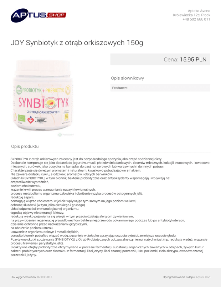 Apteka Avena Królewiecka 12c, Płock +48 502 666 011 JOY Synbiotyk z otrąb orkiszowych 150g Cena: 15,95 PLN Opis słownikowy Producent Opis produktu SYNBIOTYK z otrąb orkiszowych zalecany jest do bezpośredniego spożycia jako część codziennej diety. Doskonale komponuje się jako dodatek do jogurtów, musli, płatków śniadaniowych, deserów mlecznych, koktajli owocowych, i owocowo mlecznych, surówek, jako posypka na kanapkę, do past np. serowych lub warzywnych i do innych potraw. Charakteryzuje się świeżym aromatem i naturalnym, kwaskowo pobudzającym smakiem. Nie zawiera dodatku cukru, słodzików, aromatów i obcych barwników. Składniki SYNBIOTYKU, w tym błonnik, bakterie probiotyczne oraz antyoksydanty wspomagają i wpływają na: częstotliwość wypróżnień, poziom cholesterolu, krążenie krwi i proces wzmacniania naczyń krwionośnych, procesy metabolizmu organizmu człowieka i obniżenie ryzyka procesów patogennych jelit, redukcję zaparć, pomagają wiązać cholesterol w jelicie wpływając tym samym na jego poziom we krwi, ochronę śluzówki (w tym jelita cienkiego i grubego) układ odporności immunologicznej organizmu, łagodzą objawy nietolerancji laktozy, redukują ryzyko pojawiania się alergii, w tym przeciwdziałają alergiom żywieniowym, na przywrócenie i regenerację prawidłowej flory bakteryjnej przewodu pokarmowego podczas lub po antybiotykoterapii, działanie ochronne przed nadkażeniami grzybiczymi, na obniżenie poziomu stresu, usuwanie z organizmu toksyn i metali ciężkich, ponadto błonnik potrafiąc wiązać wodę, pęcznieje w żołądku sprzyjając uczuciu sytości, zmniejsza uczucie głodu. Pozytywne skutki spożywania SYNBIOTYKU z Otrąb Probiotycznych odczuwalne są niemal natychmiast (np. redukcja wzdęć, wsparcie procesu trawienia i perystaltyki jelit). Bioaktywne otręby probiotyczne otrzymywane w procesie fermentacji substancji organicznych zawartych w otrębach, żywych kultur bakterii probiotycznych oraz ekstraktu z fermentacji liści jeżyny, liści czarnej porzeczki, liści poziomki, ziela skrzypu, owoców czarnej porzeczki i jeżyny. Plik wygenerowano: 02-03-2017 Oprogramowanie sklepu: AptusShop Apteka Avena Królewiecka 12c, Płock +48 502 666 011 Zawiera (min 4×107 jtk/g) żywych kultur bakterii probiotycznych, witaminy, minerały, kwasy organiczne, antyutleniacze i aktywne związki prozdrowotne będące produktami ich metabolizmu. Produkt bez konserwantów. 12 miesięczny okres przydatności do spożycia gwarantują znajdujące się w otrębach probiotycznych żywe kultury bakterii kwasu mlekowego i antyoksydanty. Przeprowadzone na produkcie przez Zachodniopomorski Uniwersytet Technologiczny w Szczecinie, Wydział Nauk o Żywności i Rybactwa badania przyśpieszonego procesu starzenia tłuszczy na przykładzie tranu wykazały wysokie właściwości antyoksydacyjne naszych otrąb probiotycznych. Znaczy to, między innymi, że znajdujące się w produkcie antyoksydanty i prozdrowotne bakterie mają także pozytywny wpływ na przedłużenie świeżości potraw w składzie których znajdą się Otręby Probiotyczne serii JOY DAY. Cechą bakterii probiotycznych jest ich zdolność do kolonizacji przestrzeni całego układu trawiennego od jamy ustnej po jelito grube. Otręby probiotyczne są dla żywych kultur bakterii probiotycznych doskonałym nośnikiem ułatwiającym im przedostanie się do wnętrza organizmu w stanie żywym. Błonnik zawarty w otrębach jest doskonałym źródłem substancji stymulujących rozwój przyjaznej flory bakteryjnej jelita grubego, sprzyja jej rozwój i ochronę organizmu przed patogenami. Skład: otręby zbożowe orkiszowe, melasa z trzciny cukrowej, ekstrakt roślin liści jeżyny, liści czarnej porzeczki, liści poziomki, ziela skrzypu, owoców czarnej porzeczki i jeżyny oraz naturalny kompleks żywych kultur bakterii probiotycznych Bakterie probiotyczne wspomagają trawienie pokarmu, redukcję wzdęć, perystaltykę jelit, częstotliwość wypróżnień, eliminację toksyn, są naturalnym składnikiem ochrony flory jelitowej człowieka i wpływają korzystnie na układ odpornościowy. Ponadto błonnik zwiększa poczucie sytości i wspiera kontrolowanie wagi organizmu. Polecamy także osobom odchudzającym się, a także jako urozmaicenie diety dla wegan i wegetarian. SYNBIOTYK z otrąb orkiszowych może być także spożywany przez diabetyków. Zalecane spożycie: 15g (do 4 łyżeczek) 1 raz dziennie. Uwaga: Utrzymanie prawidłowego stanu zdrowia wymaga zrównoważonego odżywiania i prowadzenia zdrowego trybu życia. Warunki przechowywania: Plik wygenerowano: 02-03-2017 Powered by TCPDF (www.tcpdf.org) Oprogramowanie sklepu: AptusShop