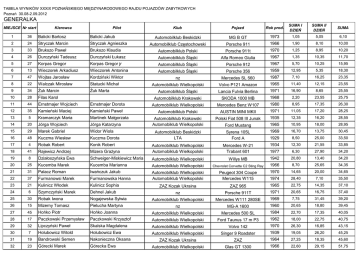 TABELA WYNIKÓW XXXIX POZNAŃSKIEGO MIĘDZYNARODOWEGO RAJDU POJAZDÓW ZABYTKOWYCH Poznań 30.08-2.09.2012 GENERALKA MIEJSCE Nr start Kierowca Pilot Klub Pojazd Rok prod. SUMA I DZIEŃ SUMA II DZIEŃ SUMA Automobilklub Beskidzki MG B GT 1973 1,05 5,05 6,10 Automobilklub Częstochowski Porsche 911 1966 1,90 8,10 10,00 1 36 Balicki Bartosz Balicki Jakub 2 24 Stryczak Marcin Stryczak Agnieszka 3 33 Brukszo Paweł Brukszo Klaudia Automobilklub Polski Porsche 911t 1970 1,25 8,95 10,20 4 26 Durczyński Tadeusz Durczyński Łukasz Automobilklub Śląski Alfa Romeo Giulia 1967 1,35 10,35 11,70 5 27 Korpas Gregor Korpas Gregor jr Automobilklub Śląski Porsche 912 1967 5,70 10,25 15,95 6 13 Wieczorek Arkadiusz Wieczorek Antonina Automobilklub Śląski Porsche 356 1959 12,95 5,35 18,30 7 47 Wojtas Jarosław Kordziński Wiktor nz Mercedes SL 560 1987 7,10 16,25 23,35 8 22 Walczak Mirosław Statucki Michał Automobilklub Wielkopolski Volvo P121 Amazon 1965 11,40 12,15 23,55 9 34 Żuk Marcin Żuk Marta Automobilklub Śląski Lancia Fulvia Berlina 1971 16,90 8,65 25,55 10 28 Filas Karol Automobilklub Krakowski SKODA 1000 MB 1968 2,20 23,55 25,75 11 44 Ernstmajer Wojciech Ernstmajer Dorota Automobilklub Wielkopolski Mercedes Benz W107 1980 8,95 17,35 26,30 12 35 Kamieński Maciej Kamieński Paweł Automobilklub Polski AUSTIN MINI MKII 1971 11,05 17,20 28,25 13 5 Kramarczyk Maria Martinek Małgorzata Polski Fiat 508 III Junak 1935 12,35 16,20 28,55 14 20 Jórga Wojciech Jórga Katarzyna Automobilklub Krakowski Automobiklub Wielkopolski Ford Mustang 1965 10,95 18,00 28,95 15 29 Marek Gabriel Widor Wiola 16,70 13,75 30,45 48 Kuczma Wiesław Kuczma Dorota Syrena 105L Ford A 1969 16 Automobilklub Beskidzki LTA 1929 8,50 25,00 33,50 17 4 Robak Robert Konik Robert 12,30 21,55 33,85 41 Rajewicz Andrzej Mizera Grażyna Mercedes W-21 Trabant 601 1934 18 Automobilklub Wielkopolski Automobiklub Wielkopolski 1977 6,30 27,90 34,20 19 8 Działoszyńska Ewa Schweiger-Miskiewicz Maria Automobilklub Wielkopolski Willys MB 1942 20,80 13,40 34,20 20 25 Kucemba Marek Kucemba Marianna Automobilklub Wielkopolski Chevrolet Corvette C2 Sting Ray 1966 8,70 25,65 34,35 21 31 Palacz Roman Iwańczuk Jakub 14,65 20,00 34,65 37 Furmanowsi Marek Furmanowska Hanna Peugeot 304 Coupe Mercedes W115 1970 22 Automobilklub Wielkopolski Automobiklub Wielkopolski 1974 28,40 7,10 35,50 23 21 Kulinicz Włodek Kulinicz Sophia ZAZ Kozak Ukraina ZAZ 965 1965 22,75 14,35 37,10 24 6 Szymczyński Marek Dehnel Jakub nz Porsche 911T 1971 20,65 16,75 37,40 25 30 Robak Iwona Nogajewska Sylwia Automobilklub Wielkopolski Mercedes W111 280SE 1969 7,75 31,45 39,20 26 15 Mizerny Tomasz Pielucha Martyna nz MG-A 1600 1960 20,65 18,80 39,45 27 45 Hońko Piotr Hońko Joanna Automobilklub Wielkopolski Mercedes 500 SL 1984 22,70 17,35 40,05 28 17 Paczkowski Przemysław Paczkowski Krzysztof Automobilklub Wielkopolski Ford Taunus 17 m P3 1962 18,00 22,75 40,75 29 32 Lipczyński Paweł Skalska Magdalena Automobilklub Wielkopolski Volvo 142 1970 26,30 16,85 43,15 30 7 Holubowicz Witold Holubowicz Ewa Automobilklub Wielkopolski Singer 9 Roadster 1939 19,05 26,20 45,25 31 19 Bandrowski Semen Nakonieczna Oksana ZAZ Kozak Ukraina ZAZ 1964 27,25 18,35 45,60 32 23 Górecki Marek Górecka Ewa Automobilklub Wielkopolski Glas GT 1300 1966 22,60 29,15 51,75 33 9 Słuszniak Władysław Żołnierkiewicz Bożena Automobilklub Krakowski Triumph 2000 Roadster 1949 13,80 42,60 56,40 34 14 Wesołowski Dariusz Wesołowska Krystyna Automobilklub Wielkopolski Volvo P 544 1960 22,90 33,70 56,60 35 16 Bąkowski Paweł Buczkowski Marcin nz Mercedes W111 1962 15,80 41,30 57,10 36 40 Surma Przemysław Baksalara Paulina nz Mercedes W115 1975 24,20 34,75 58,95 37 11 Magnusson Leif Magnusson Bodil nz Mercedes 170 S 1950 45,25 16,35 61,60 38 3 Guezen Bert Guezen Ton A-Ford+Fehaa Ford A 1929 54,85 31,40 86,25 39 38 Soboń Grzegorz Automobilklub Lubelski FIAT 124 SPIDER 1975 26,50 67,20 93,70 40 18 Talikowski Janusz Talikowska Bożena nz Volvo 122S 1962 50,40 65,70 116,10 41 12 Jonsson Sven Liljekvist Per Mercedes Benz Kluben Sverige Mercedes Benz 190 SL 1957 66,90 54,95 121,85 42 1 Pierzchawka Marcin Automobilklub Wielkopolski Lanz Bulldog D7506 1941 94,40 43,85 138,25 43 46 Sadecki Piotr Sadecka Anna nz Opel Monza 1986 21,65 126,60 148,25 44 39 Roszyk Robert Roszyk Julita Automobilklub Śląski FIAT 128 S 1975 24,45 126,60 151,05 45 43 Sadecki Krzysztof Sadecka urszula Opel Ascona B 1979 43,25 136,60 179,85 46 10 Larsson Thorsten Larsson Sonja nz Szwecja Mercedes-Benz 170 S Cabriolet B 1950 64,35 136,60 200,95 47 2 Falkenbach Harro Falkenbach Heidi DAVC Dixi DA1 1927 1112,40 49,35 1161,75 MIEJSCE 1 2 3 4 5 6 7 8 9 10 11 12 13 14 15 16 17 18 19 20 21 22 23 24 25 26 27 28 29 30 31 32 33 34 35 36 37 38 39 40 41 42 43 44 45 46 47