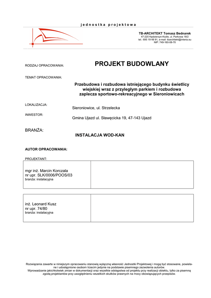 jednostka projektowa TB-ARCHITEKT Tomasz Bednarek 47-220 Kędzierzyn-Koźle, ul. Parkowa 18/2 tel.: 695 19 48 91, e-mail: [email protected] NIP: 749-160-08-70 PROJEKT BUDOWLANY RODZAJ OPRACOWANIA: TEMAT OPRACOWANIA: Przebudowa i rozbudowa istniejącego budynku świetlicy wiejskiej wraz z przyległym parkiem i rozbudowa zaplecza sportowo-rekreacyjnego w Sieroniowicach LOKALIZACJA: INWESTOR: Sieroniowice, ul. Strzelecka Gmina Ujazd ul. Sławęcicka 19, 47-143 Ujazd BRANśA: INSTALACJA WOD-KAN AUTOR OPRACOWANIA: PROJEKTANT: mgr inŜ. Marcin Korczala nr upr. SLK/0006/POOS/03 branŜa: instalacyjna inŜ. Leonard Kusz nr upr. 74/80 branŜa: instalacyjna Rozwiązania zawarte w niniejszym opracowaniu stanowią wyłączną własność Jednostki Projektowej i mogą być stosowane, powielane i udostępnione osobom trzecim jedynie na podstawie pisemnego zezwolenia autorów. Wprowadzanie jakichkolwiek zmian w dokumentacji oraz wszelkie odstępstwa od projektu przy realizacji obiektu, tylko za pisemną zgodą projektantów przy uwzględnieniu wszelkich skutków prawnych na mocy obowiązujących przepisów. TB-ARCHITEKT Tomasz Bednarek 47-220 Kędzierzyn-Koźle, ul. Parkowa 18/2 tel.: 695 19 48 91, e-mail: [email protected] NIP: 749-160-08-70 Spis treści 1. PODSTAWA OPRACOWANIA. .............................................................................................. 4 2 . PRZEDMIOT I ZAKRES OPRACOWANIA......................................................................... 4 3. BILANS WODY I ŚCIEKÓW. .................................................................................................. 5 3.1. ZAPOTRZEBOWANIE WODY NA CELE SOCJALNE. ...................................................................... 5 4. OBLICZENIA. ............................................................................................................................ 5 4.1. DOBÓR WODOMIERZA .............................................................................................................. 5 5. PROJEKTOWANE ROZWIĄZANIA – INSTALACJE WEWNĘTRZNE. ........................ 5 5.1. INSTALACJA KANALIZACJI SANITARNEJ. .................................................................................. 5 5.2. INSTALACJA WODY ZIMNEJ. ..................................................................................................... 6 5.3. INSTALACJA CIEPŁEJ WODY UśYTKOWEJ. ................................................................................ 6 6. MATERIAŁY I ARMATURA – INSTALACJE WEWNĘTRZNE. .................................... 7 6.1. MATERIAŁ. .............................................................................................................................. 7 6.2. UKŁADANIE PRZEWODÓW........................................................................................................ 7 6.3. KOMPENSACJA PRZEWODÓW. .................................................................................................. 8 6.4. IZOLACJA PRZEWODÓW. .......................................................................................................... 8 6.5. PRZEJŚCIE PRZEZ PRZEGRODY PPOś. ........................................................................................ 8 6.6. PRZEJŚCIE PRZEZ FUNDAMENT I ŚCIANY. ................................................................................. 8 6.7. ZABEZPIECZENIA ANTYKOROZYJNE......................................................................................... 8 7. UWAGI KOŃCOWE.................................................................................................................. 9 8. ZESTAWIENIE MATERIAŁÓW. ......................................................................................... 10 8.1 INSTALACJA KANALIZACYJNA. ............................................................................................... 10 8.2 INSTALACJA WODOCIĄGOWA.................................................................................................. 10 8.3 CERAMIKA WRAZ Z ARMATURĄ CZERPALNĄ. ......................................................................... 11 Projekt budowlany instalacji wodno-kanalizacyjnej do budynku świetlicy wiejskiej W Sieroniowicach przy ul. Strzeleckiej na dz.377/6 2 TB-ARCHITEKT Tomasz Bednarek 47-220 Kędzierzyn-Koźle, ul. Parkowa 18/2 tel.: 695 19 48 91, e-mail: [email protected] NIP: 749-160-08-70 Spis załączników: 1. 2. 3. Oświadczenie projektanta. Kserokopia uprawnień projektanta. Zaświadczenie o przynaleŜności do Izby InŜynierów. Spis rysunków: Lp. Temat rysunku skala WK-01 Rzut parteru - instalacja wody 1:50 WK-02 Rzut parteru - instalacja kanalizacyjna 1:50 WK-03 Rzut dachu - instalacja kanalizacyjna 1:100 WK-04 Schemat - instalacja wody --- WK-05 Schemat - instalacja kanalizacji -- Projekt budowlany instalacji wodno-kanalizacyjnej do budynku świetlicy wiejskiej W Sieroniowicach przy ul. Strzeleckiej na dz.377/6 3 TB-ARCHITEKT Tomasz Bednarek 47-220 Kędzierzyn-Koźle, ul. Parkowa 18/2 tel.: 695 19 48 91, e-mail: [email protected] NIP: 749-160-08-70 1. Podstawa opracowania. Podstawa i materiały słuŜące do opracowania: − umowa z Inwestorem, − uzgodnienia z Inwestorem oraz zalecenia przedstawicieli Inwestora, − podkłady architektoniczno-budowlane, − uzgodnienia z Projektantami - Autorami opracowań projektowych (realizowanych równolegle) − obowiązujące normy i wytyczne projektowania w zakresie sieci i instalacji wod-kan, 2 . Przedmiot i zakres opracowania. Przedmiotem opracowania jest projekt budowlany : • wewnętrznych instalacji wody zimniej • wewnętrznych instalacji wody ciepłej • instalacji kanalizacji sanitarnej na potrzeby przebudowy i rozbudowy budynku świetlicy wiejskiej w Sieroniowicach przy ul. Strzeleckiej. Zakres opracowania obejmuje następujące instalacje wewnętrzne: - instalację kanalizacji sanitarnej - instalację wewnętrzną wody pitnej do celów socjalnych - instalację wody ciepłej uŜytkowej (pr