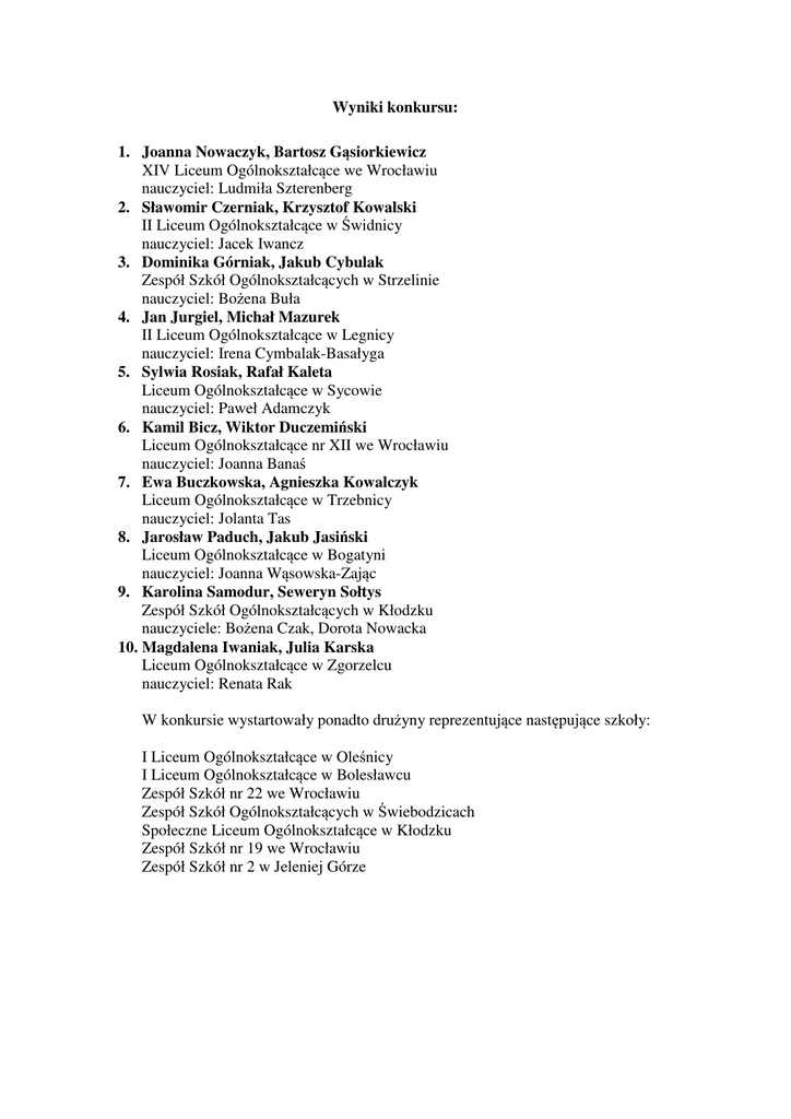 Wyniki konkursu: 1. Joanna Nowaczyk, Bartosz Gąsiorkiewicz XIV Liceum Ogólnokształcące we Wrocławiu nauczyciel: Ludmiła Szterenberg 2. Sławomir Czerniak, Krzysztof Kowalski II Liceum Ogólnokształcące w Świdnicy nauczyciel: Jacek Iwancz 3. Dominika Górniak, Jakub Cybulak Zespół Szkół Ogólnokształcących w Strzelinie nauczyciel: Bożena Buła 4. Jan Jurgiel, Michał Mazurek II Liceum Ogólnokształcące w Legnicy nauczyciel: Irena Cymbalak-Basałyga 5. Sylwia Rosiak, Rafał Kaleta Liceum Ogólnokształcące w Sycowie nauczyciel: Paweł Adamczyk 6. Kamil Bicz, Wiktor Duczemiński Liceum Ogólnokształcące nr XII we Wrocławiu nauczyciel: Joanna Banaś 7. Ewa Buczkowska, Agnieszka Kowalczyk Liceum Ogólnokształcące w Trzebnicy nauczyciel: Jolanta Tas 8. Jarosław Paduch, Jakub Jasiński Liceum Ogólnokształcące w Bogatyni nauczyciel: Joanna Wąsowska-Zając 9. Karolina Samodur, Seweryn Sołtys Zespół Szkół Ogólnokształcących w Kłodzku nauczyciele: Bożena Czak, Dorota Nowacka 10. Magdalena Iwaniak, Julia Karska Liceum Ogólnokształcące w Zgorzelcu nauczyciel: Renata Rak W konkursie wystartowały ponadto drużyny reprezentujące następujące szkoły: I Liceum Ogólnokształcące w Oleśnicy I Liceum Ogólnokształcące w Bolesławcu Zespół Szkół nr 22 we Wrocławiu Zespół Szkół Ogólnokształcących w Świebodzicach Społeczne Liceum Ogólnokształcące w Kłodzku Zespół Szkół nr 19 we Wrocławiu Zespół Szkół nr 2 w Jeleniej Górze