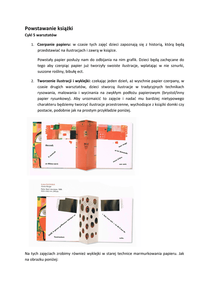 Powstawanie książki Cykl 5 warsztatów 1. Czerpanie papieru: w czasie tych zajęć dzieci zapoznają się z historią, którą będą przedstawiać na ilustracjach i zawrą w książce. Powstały papier posłuży nam do odbijania na nim grafik. Dzieci będą zachęcane do tego aby czerpiąc papier już tworzyły swoiste ilustracje, wplatając w nie sznurki, suszone rośliny, bibułę ect. 2. Tworzenie ilustracji i wyklejki: czekając jeden dzień, aż wyschnie papier czerpany, w czasie drugich warsztatów, dzieci stworzą ilustracje w tradycyjnych technikach rysowania, malowania i wycinania na zwykłym podłożu papierowym (brystol/inny papier rysunkowy). Aby urozmaicić to zajęcie i nadać mu bardziej nietypowego charakteru będziemy tworzyć ilustracje przestrzenne, wychodzące z książki domki czy postacie, podobnie jak na prostym przykładzie poniżej. Na tych zajęciach zrobimy również wyklejki w starej technice marmurkowania papieru. Jak na obrazku poniżej: dzieci będą tworzyły grafiki w technice druku wklęsłego lub wypukłego i odbijały je na papierze czerpanym przy pomocy prasy drukarskiej. Będą używały do tego profesjonalnych farb offsetowych i papieru do grafiki warsztatowej. Tematyka prac będzie się odnosiła do treści opowiadania. 3. Tworzenie grafik: 4. Typografia: projektowanie obwoluty/okładki książki oraz strony tytułowej. Na tych zajęciach porozmawiam z dziećmi o liternictwie, budowie litery. Pokażę ciekawe przykłady układów typograficznych, które pomogą dzieciom, tak zaprojektować tytuł, aby oddawał charakter treści książki. W czasie tych warsztatów dzieci umieszczą w książce fragmenty tekstów opowiadania. Niektóre fragmenty tekstu będziemy umieszczać na doklejanych do stron harmonijkach z papieru, lub innych „nadprogramowych” elementach, aby dodać element zaskoczenia przy oglądaniu książki. 5. Łączenie wszystkich elementów książki w całość: dokonamy podstawowego zabiegu introligatorskiego, czyli zszycia książek z okładkami z tektury. Połączymy wtedy w całość, wszystkie elementy, które zrobiły dzieci w cyklu warsztatów: ilustracje na papierze czerpanym, ilustracje przestrzenne oraz grafiki, strony tytułowe i strony z tekstem. Każde dziecko będzie miało swoją teczkę, założoną na początku zajęć, aby prace się nie pomieszały. Dzieci ponadto będą przyklejały zakładki z tasiemki i kapitałki na grzbiecie książki. Obłożą książkę i okleją ją obwolutą, wkleją wyklejkę. Na końcu dodadzą do książki sekretne miejsca, np. koperty do której będą mogły chować swoje tajemnice, zrobią dodatkowe strony niespodzianki, np. w postaci otwierającego się okienka, jak na ilustracji poniżej, tak aby oglądający mógł za każdym razem odkrywać w książce coś nowego.