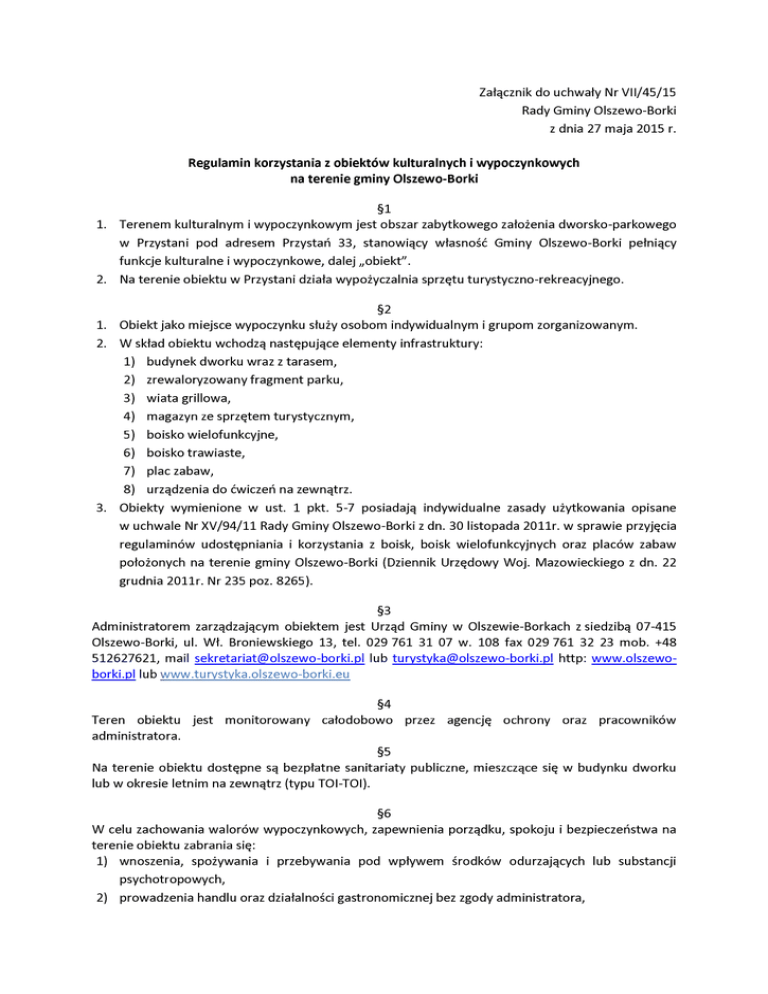 Załącznik do uchwały Nr VII/45/15 Rady Gminy Olszewo-Borki z dnia 27 maja 2015 r. Regulamin korzystania z obiektów kulturalnych i wypoczynkowych na terenie gminy Olszewo-Borki 1. §1 Terenem kulturalnym i wypoczynkowym jest obszar zabytkowego założenia dworsko-parkowego w Przystani pod adresem Przystań 33, stanowiący własność Gminy Olszewo-Borki pełniący funkcje kulturalne i wypoczynkowe, dalej „obiekt". 2. Na terenie obiektu w Przystani działa wypożyczalnia sprzętu turystyczno-rekreacyjnego. 1. §2 Obiekt jako miejsce wypoczynku służy osobom indywidualnym i grupom zorganizowanym. 2. W skład obiektu wchodzą następujące elementy infrastruktury: 1) budynek dworku wraz z tarasem, 2) zrewaloryzowany fragment parku, 3) wiata grillowa, 3. 4) magazyn ze sprzętem turystycznym, 5) boisko wielofunkcyjne, 6) boisko trawiaste, 7) plac zabaw, 8) urządzenia do ćwiczeń na zewnątrz. Obiekty wymienione w ust. 1 pkt. 5-7 posiadają indywidualne zasady użytkowania opisane w uchwale Nr XV/94/11 Rady Gminy Olszewo-Borki z dn. 30 listopada 2011r. w sprawie przyjęcia regulaminów udostępniania i korzystania z boisk, boisk wielofunkcyjnych oraz placów zabaw położonych na terenie gminy Olszewo-Borki (Dziennik Urzędowy Woj. Mazowieckiego z dn. 22 grudnia 2011r. Nr 235 poz. 8265). §3 Administratorem zarządzającym obiektem jest Urząd Gminy w Olszewie-Borkach z siedzibą 07-415 Olszewo-Borki, ul. Wł. Broniewskiego 13, tel. 029 761 31 07 w. 108 fax 029 761 32 23 mob. +48 512627621, mail [email protected] lub [email protected] http: www.olszewoborki.pl lub www.turystyka.olszewo-borki.eu Teren obiektu jest administratora. §4 monitorowany całodobowo przez agencję ochrony oraz pracowników §5 Na terenie obiektu dostępne są bezpłatne sanitariaty publiczne, mieszczące się w budynku dworku lub w okresie letnim na zewnątrz (typu TOI-TOI). §6 W celu zachowania walorów wypoczynkowych, zapewnienia porządku, spokoju i bezpieczeństwa na terenie obiektu zabrania się: 1) wnoszenia, spożywania i przebywania pod wpływem środków odurzających lub substancji psychotropowych, 2) prowadzenia handlu oraz działalności gastronomicznej bez zgody administratora, 3) niszczenia trawników, roślinności niskiej i wysokiej oraz urządzeń, 4) łamania gałęzi oraz zrywania kwiatów, 5) zaśmiecania i zanieczyszczania terenu, 6) przenoszenia ławek z miejsc dla nich przeznaczonych, 7) palenia ognisk bez zgody administratora, 8) poruszania się wszelkimi środkami mechanicznymi z wyjątkiem rowerów i wózków inwalidzkich, 9) parkowania pojazdów poza miejscami do tego wyznaczonymi, 10) puszczania psów bez smyczy, 11) wnoszenia broni lub innych przedmiotów niebezpiecznych, materiałów wybuchowych, wyrobów pirotechnicznych, materiałów pożarowo niebezpiecznych, 12) przebywania na terenie po godzinie 22:00, 13) przebywania dzieci do 10 r.ż. bez opieki rodziców lub opiekunów, 14) wchodzenia lub przechodzenia przez płoty i ogrodzenia, 15) tarasowania dróg dojazdowych i ewakuacyjnych. §7 W celu zachowania walorów wypoczynkowych, zapewnienia porządku, spokoju i bezpieczeństwa na terenie obiektu nakazuje się: 1) przestrzegania zasad BHP oraz norm społeczno-obyczajowych, 2) przestrzegania niniejszego regulaminu oraz innych wytycznych wprowadzonych przez administratora, 3) właścicielom psów stosowanie kagańca dla zwierząt oraz sprzątanie odchodów pozostawionych przez ich zwierzęta, 4) w razie wystąpienia zagrożeń pożarowych, aktów dewastacji obiektów jak i niepożądanych zachowań stanowiących zagrożenie dla osób przebywających na terenie obiektu, należy niezwłocznie poinformować administratora, funkcjonariuszy Policji oraz Straży Pożarnej i stosować się do ich poleceń. 1. Osoby, które nie będą przestrzegały §8 regulaminu będą podlegały odpowiedzialności przewidzianej przepisami Kodeksu Wykroczeń, Kodeksu Karnego oraz Kodeksu Cywilnego. 2. Za przedmioty wartościowe pozostawione na terenie obiektu, administrator nie ponosi 3. Za szkody materialne powstałe wskutek nieprawidłowego korzystania z obiektów i urządzeń odpowiedzialności. odpowiadają korzystający, a w przypadku osób niepełnoletnich ich opiekunowie prawni. 4. Za powstałe szkody na obiekcie przewidziana jest odpłatność w wysokości ich pełnej wartości rynkowej lub odtworzeniowej. 5. Administrator zastrzega sobie prawo do odwołania zaplanowanych wcześniej zajęć na obiekcie. 6. Za wypadki spowodowane nieprzestrzeganiem niniejszego regulaminu odpowiedzialność ponosi 7. W sprawach nieuregulowanych w niniejszym regulaminie ostateczną decyzję podejmuje użytkownik a w przypadku osób niepełnoletnich odpowiada rodzic/opiekun prawny. administrator. 1. §9 Korzystanie z obiektu opisanego w §1 ust. 1 jest bezpłatne. 2. Dopuszcza się udostępnienie obiektu podmiotom gospodarczym lub osobom fizycznym na organizację przedsięwzięcia zamkniętego, za które pobierana jest opłata za 1 dzień, przy czym wejście i opuszczenie obiektu powinno nastąpić na podstawie odrębnego uzgodnienia z administratorem. 3. W przypadku udostępnienia obiektu podmiotom gospodarczym lub osobom fizycznym na czas krótszy niż opisany w ust. 2 pobierana jest zryczałtowana opłata za dostęp do energii elektrycznej, przygotowanie drewna lub węgla na grill lub ognisko i wywóz śmieci od grup zorganizowanych. 4. Administrator w drodze zarządzenia ustali wartość opłat, o których mowa w ust. 2 i 3. 5. Administrator może zwolnić z opłaty, o której mowa w ust. 2 i 3 organizację pozarządową organizującą przedsięwzięcie o charakterze sportowym, kulturalnym, turystycznym, rekreacyjnym lub edukacyjnym skierowane w szczególności do mieszkańców gminy OlszewoBorki. 6. Na terenie obiektu dopuszcza się rozpalenie ognia tylko w miejscach do tego przeznaczonych murowany grill i miejsce na ognisko. 7. Korzystanie z grilla i miejsca na ognisko może odbywać się pod nadzorem osoby p