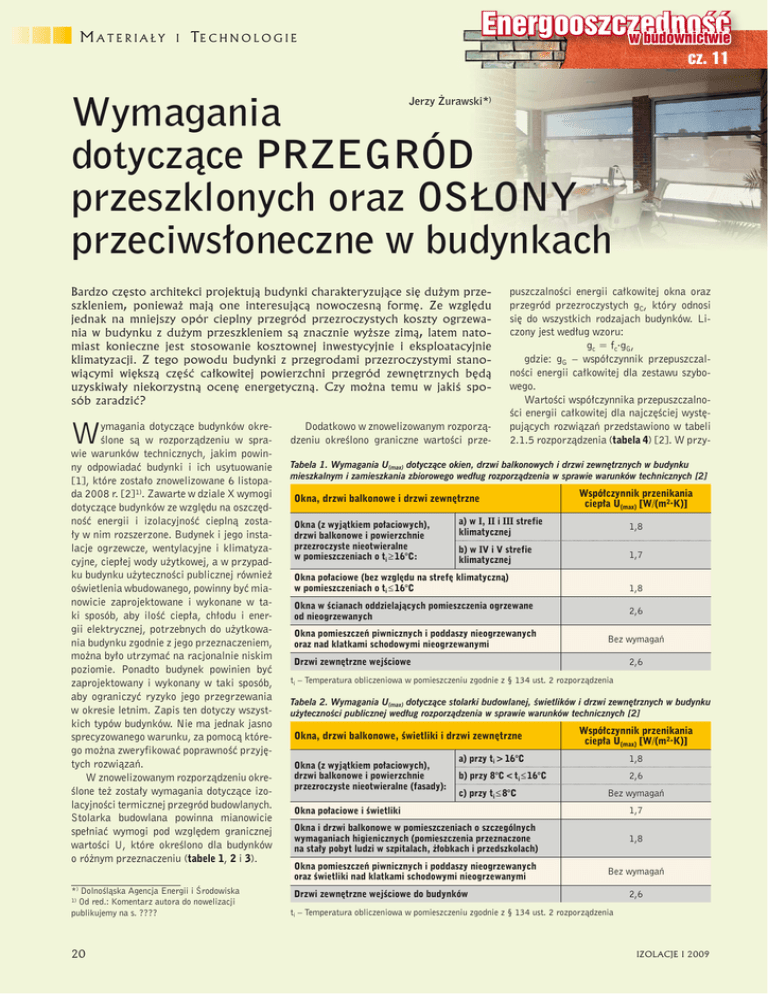 MATERIAŁY I Energooszczędność w budownictwie TE C H N O L O G I E cz. 11 Wymagania dotyczące PRZEGRÓD przeszklonych oraz OSŁONY przeciwsłoneczne w budynkach Jerzy Żurawski*) Bardzo często architekci projektują budynki charakteryzujące się dużym przeszkleniem, ponieważ mają one interesującą nowoczesną formę. Ze względu jednak na mniejszy opór cieplny przegród przezroczystych koszty ogrzewania w budynku z dużym przeszkleniem są znacznie wyższe zimą, latem natomiast konieczne jest stosowanie kosztownej inwestycyjnie i eksploatacyjnie klimatyzacji. Z tego powodu budynki z przegrodami przezroczystymi stanowiącymi większą część całkowitej powierzchni przegród zewnętrznych będą uzyskiwały niekorzystną ocenę energetyczną. Czy można temu w jakiś sposób zaradzić? W ymagania dotyczące budynków określone są w rozporządzeniu w sprawie warunków technicznych, jakim powinny odpowiadać budynki i ich usytuowanie [1], które zostało znowelizowane 6 listopada 2008 r. [2]1). Zawarte w dziale X wymogi dotyczące budynków ze względu na oszczędność energii i izolacyjność cieplną zostały w nim rozszerzone. Budynek i jego instalacje ogrzewcze, wentylacyjne i klimatyzacyjne, ciepłej wody użytkowej, a w przypadku budynku użyteczności publicznej również oświetlenia wbudowanego, powinny być mianowicie zaprojektowane i wykonane w taki sposób, aby ilość ciepła, chłodu i energii elektrycznej, potrzebnych do użytkowania budynku zgodnie z jego przeznaczeniem, można było utrzymać na racjonalnie niskim poziomie. Ponadto budynek powinien być zaprojektowany i wykonany w taki sposób, aby ograniczyć ryzyko jego przegrzewania w okresie letnim. Zapis ten dotyczy wszystkich typów budynków. Nie ma jednak jasno sprecyzowanego warunku, za pomocą którego można zweryfikować poprawność przyjętych rozwiązań. W znowelizowanym rozporządzeniu określone też zostały wymagania dotyczące izolacyjności termicznej przegród budowlanych. Stolarka budowlana powinna mianowicie spełniać wymogi pod względem granicznej wartości U, które określono dla budynków o różnym przeznaczeniu (tabele 1, 2 i 3). *) Dolnośląska Agencja Energii i Środowiska Od red.: Komentarz autora do nowelizacji publikujemy na s. ???? 1) 20 Dodatkowo w znowelizowanym rozporządzeniu określono graniczne wartości prze- puszczalności energii całkowitej okna oraz przegród przezroczystych gC, który odnosi się do wszystkich rodzajach budynków. Liczony jest według wzoru: gc = fc·gG, gdzie: gG – współczynnik przepuszczalności energii całkowitej dla zestawu szybowego. Wartości współczynnika przepuszczalności energii całkowitej dla najczęściej występujących rozwiązań przedstawiono w tabeli 2.1.5 rozporządzenia (tabela 4) [2]. W przy- Tabela 1. Wymagania U(max) dotyczące okien, drzwi balkonowych i drzwi zewnętrznych w budynku mieszkalnym i zamieszkania zbiorowego według rozporządzenia w sprawie warunków technicznych [2] Okna, drzwi balkonowe i drzwi zewnętrzne Okna (z wyjątkiem połaciowych), drzwi balkonowe i powierzchnie przezroczyste nieotwieralne w pomieszczeniach o ti ≥ 16°C: Współczynnik przenikania ciepła U(max) [W/(m2·K)] a) w I, II i III strefie klimatycznej 1,8 b) w IV i V strefie klimatycznej 1,7 Okna połaciowe (bez względu na strefę klimatyczną) w pomieszczeniach o ti ≤ 16°C 1,8 Okna w ścianach oddzielających pomieszczenia ogrzewane od nieogrzewanych 2,6 Okna pomieszczeń piwnicznych i poddaszy nieogrzewanych oraz nad klatkami schodowymi nieogrzewanymi Bez wymagań 2,6 Drzwi zewnętrzne wejściowe ti – Temperatura obliczeniowa w pomieszczeniu zgodnie z § 134 ust. 2 rozporządzenia Tabela 2. Wymagania U(max) dotyczące stolarki budowlanej, świetlików i drzwi zewnętrznych w budynku użyteczności publicznej według rozporządzenia w sprawie warunków technicznych [2] Okna, drzwi balkonowe, świetliki i drzwi zewnętrzne Okna (z wyjątkiem połaciowych), drzwi balkonowe i powierzchnie przezroczyste nieotwieralne (fasady): Współczynnik przenikania ciepła U(max) [W/(m2·K)] 1,8 a) przy ti > 16°C 2,6 b) przy 8°C < ti ≤ 16°C c) przy ti ≤ 8°C Bez wymagań Okna połaciowe i świetliki 1,7 Okna i drzwi balkonowe w pomieszczeniach o szczególnych wymaganiach higienicznych (pomieszczenia przeznaczone na stały pobyt ludzi w szpitalach, żłobkach i przedszkolach) 1,8 Okna pomieszczeń piwnicznych i poddaszy nieogrzewanych oraz świetliki nad klatkami schodowymi nieogrzewanymi Bez wymagań Drzwi zewnętrzne wejściowe do budynków 2,6 ti – Temperatura obliczeniowa w pomieszczeniu zgodnie z § 134 ust. 2 rozporządzenia IZOLACJE I 2009 MATERIAŁY Tabela 3. Wymagania U(max) dotyczące okien, świetlików, drzwi i wrót w budynku produkcyjnym, magazynowym i gospodarczym według rozporządzenia w sprawie warunków technicznych [2] Współczynnik przenikania ciepła U(max) [W/(m2·K)] Okna, świetliki, drzwi i wrota Okna (z wyjątkiem połaciowych), drzwi balkonowe i powierzchnie przezroczyste nieotwieralne w pomieszczeniach o ti ≥ 16°C: a) w I, II i III strefie klimatycznej 1,9 b) w IV i V strefie klimatycznej 1,7 Okna połaciowe (bez względu na strefę klimatyczną) w pomieszczeniach o ti >16°C 1,8 Okna w ścianach oddzielających pomieszczenia ogrzewane od nieogrzewanych 2,6 Drzwi i wrota w przegrodach zewnętrznych 2,6 I TE C H N O L O G I E Partnerzy cyklu „Energooszczędność w budownictwie”: ti – Temperatura obliczeniowa w pomieszczeniu zgodnie z § 134 ust. 2 rozporządzenia Tabela 4. Wartości współczynnika przepuszczalności energii całkowitej dla rodzaju oszklenia Współczynnik gC przepuszczalności energii całkowitej Rodzaj oszklenia Pojedynczo szklone 0,85 Podwójnie szklone 0,75 Podwójnie szklone z powłoką selektywną 0,67 Potrójnie szklone 0,7 Potrójnie szklone z powłoką selektywną 0,5 Okna podwójne 0,75 Tabela 5. Wartości współczynnika korekcyjnego redukcji promieniowania ze