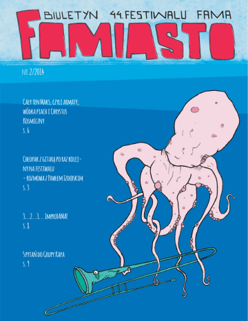 nr 2/2014 Cały ten Maks, czyli armaty, wódka piach i Chrystus Kosmiczny s. 6 Chłopak z gitarą po raz kolejny na festiwalu - rozmowa z Pawłem Izdebskim s. 3 3...2...1... ImproFAMA! s. 8 5 pytań do Grupy Kapa s. 9 ~1~ Bogactwo osobowości Chłopak z gitarą po raz kolejny na festiwalu s. 3 Za nami pierwsze dni festiwalu, a razem z nimi pierwsze prezentacje konkursowe oraz wydarzenia specjalne. Świnoujście zaroiło się od barwnych, wyrazistych postaci – muzyków, fotografów, kabareciarzy, poetów, dziennikarzy, performerów, artystów sztuk wizualnych, aktorów. Ich zagęszczenie na każdym metrze kwadratowym miasta wzrasta z godziny na godzinę, a twórczy FAMA roześmiana s. 4 ferment unosi się w powietrzu z bałtycką bryzą, wprawiając w oszołomienie nawet wszechobecne mewy. W drugim numerze „Famiasta” przygotowaliśmy dla Was subiektywny przegląd festiwalowych osobowości, z których twórczością warto się bliżej za- „Czy twój ojciec do Czarnobyla na spacer z tobą chodził?” – Paw Królowej w teatralnej adaptacji Cały ten Maks, czyli armaty, wódka piach i Chrystus Kosmiczny s. 7 poznać. Przedstawiamy Wam sylwetkę Maksa Szoca, legendarnego famowicza, patrona Nagrody za nieszablonową i kreatywną postawę artystyczną, którego wspominają dla nas krewni i przyjaciele. Sprawdzamy, co słychać u Pawła Izdebskiego – chłopaka z gitarą, który w ubiegłym roku podbił serca publiczności brawurowym coverem utworu Seksualna niebezpieczna. Podpytujemy Kamilę Sujkę i Pawła Czarneckiego o plany związane z tegoroczną 3...2...1... ImproFAMA! s. 8 FAMĄ, a o pracy nad spektaklem Paw królowej opowiada jego reżyserka, Ewelina Łyszczek. Coś dla siebie znajdą też wielbiciele kabaretu i gier wideo. Nie zwalniamy tempa! Famowa machina ruszyła na dobre, a przed nami jeszcze ogrom wyjątkowych wydarzeń, których szczegółową rozpiskę za- 5 pytań do Grupy Kapa – Kamili Sujki i Pawła Czarneckiego s. 9 mieszczamy na ostatniej stronie numeru. Nie przegapcie ich i pozwólcie, by wciągnął Was artystyczny wir. Naczelna Sztuka performance’u w Świnoujściu s. 11 Sfinansowano ze środków Urzędu Miasta w Świnoujściu Medium interaktywne naprawdę. Jak jeszcze można byłoby grać na Festiwalu FAMA? s. 12 Mój pierwszy raz na FAMIE Odcinek 2. Wieczór i poranek – dzień pierwszy s. 13 Fotorelacja z wernisażu wystawy „Habitat” s. 15 Naczelna: Redakcja: Korekta: Ilustracje: Projekt okładki i ilustracje: Opracowanie graficzne i skład: Wydawca: Kontakt: Monika Stopczyk Karolina Czyżak Daniel Durlak Karolina Grzybowska Monika Kapela Natalia Kowalczyk Joanna Pachla Paweł Walentynowicz Weronika Szkwarek Mateusz Kluczny Mateusz Kluczny Mateusz Beźnic 44. Festiwal FAMA [email protected] www.fama.org.pl | facebook/fama.festiwal ~2~ Chłopak z gitarą po raz kolejny na festiwalu Ma 23 lata. Jego pierwszy publiczny występ to wykonanie pastorałki na jednym ze świątecznych konkursów. Dlaczego śpiewa? Dlatego, że w życiu nie ma zbyt wielu okazji do tego, aby się wykrzyczeć, powiedzieć „kocham” na głos lub po prostu, sprawia mu to ogromną radość. O FAMIE, śpiewaniu i swoich podbojach muzycznych opowiada Paweł Izdebski. Karolina Czyżak: Skąd dowiedziałeś się o FAMIE? Co skutecznie zabijać autokreację, która ogranicza i pozostawia zmotywowało Cię trzy lata temu do tego, żeby zgłosić człowieka we własnych ramach i kompleksach. Podczas przy- się na kampus? gotowań dwóch koncertów finałowych pod okiem Połońskiego polubiłem to, czego wcześniej lubić nie chciałem. Nie spo- Paweł Izdebski: Trzy lata temu mój znajomy – Kuba Sty- sób również zapomnieć o tym, że nauczyłem się owocnej czyński, który trochę mi pomógł odnaleźć się na Warszaw- współpracy z innymi oraz budowania relacji ja-publiczność. To skiej Scenie Muzycznej, wspomniał o Festiwalu FAMA. Po- było dla mnie bardzo cenne doświadczenie. myślałem, że warto się zgłosić i pokazać. Eliminacje odbyły się w Mechaniku przy Politechnice. Był tam zespół Same Suki oraz inni wykonawcy. Dziś pamiętam, że miałem 15 minut na występ. Zagrałem trzy numery, w tym dwa swoje. Wiedziałem, że jest jury i jestem oceniany, ale nie wiedziałem do końca, o co walczę. Mój występ się spodobał i pojechałem na kampus. Natomiast zgłoszenie do ubiegłorocznej FAMY było niemal formalnością. Wysłałem formularz jako pierwszy kilka minut po północy. Udało mi się dostać po raz drugi. Kto raz przeżył FAMĘ, zawsze chce na nią wracać. Podobnie jest ze mną. Jesteś stałym bywalcem FAMY. Czego nauczyłeś się na tym festiwalu? Mógłbym na ten temat napisać esej. Przede wszystkim nauczyłem się podejścia nie tyle muzycznego, co bardziej muzyczno-teatralnego. Oczywiście, można wyjść, zaśpiewać i zejść ze sceny. Pamiętam jak dziś Annę Serafińską, mówiącą, że w śpiewaniu nie chodzi o śpiewanie. Udział w warsztatach pozwolił mi przeżywać, stawać się prawdziwym artystą, a nie tylko muzykiem. Na festiwalu tańczyłem, byłem aktorem, chodziłem po mieście z animatorami, robiłem różne rzeczy, których nie robiłem nigdy wcześniej – i to było piękne. Bardzo ważną osobą na FAMIE jest dla mnie także Jerzy Jan Połoński. To on nauczył mnie, jak przekraczać swoje granice i jak ~3~ fot. Bartosz Zieliński Co według Ciebie jest największą wartością FAMY? niesamowite. A jeśli mówimy o innych festiwalach, to zdecy- Największą wartością FAMY jest przestrzeń. Nie chodzi dowanie zależy mi na tych alternatywnych, często stricte „ga- tylko o miejsce. Istotny jest kontakt z ludźmi, udział w pro- tunkowych”. Mam za sobą występ w Mrągowie na Festiwalu jektach, wystawach, spotkania na Oflagu. Dla mnie uczest- Country oraz w Katowicach na Rawa Blues. Lubię dziwne nictwo w poprzednich edycjach FAMY jest bezcenne. Zdaje miejsca, a najbardziej te, do których niekoniecznie pasuję. sobi