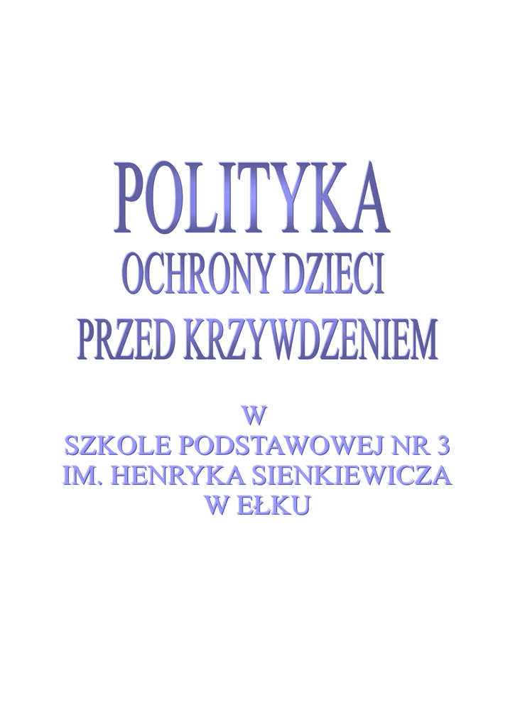 PREAMBUŁA Naczelną zasadą wszystkich działań podejmowanych przez pracowników szkoły jest działanie dla dobra dziecka. Pracownicy szkoły traktują dzieci z szacunkiem, uwzględniając wszystkie ich prawa i potrzeby. Niedopuszczalne jest stosowanie przez pracownika wobec dziecka przemocy w jakiejkolwiek formie. Pracownicy zobowiązani są do realizacji wyżej wymienionych celów zgodnie ze swoimi kompetencjami i obowiązującym prawem oraz przepisami wewnętrznymi danej instytucji. AKTY PRAWNE 1. Rozporządzenie Rady Ministrów z dnia 13 września 2011 roku w sprawie procedury „Niebieskiej Karty” oraz wzorów formularzy „Niebieska Karta”. 2. Ustawa o przeciwdziałaniu przemocy w rodzinie z dnia 29 lipca 2005 roku, artykuł 12; 3. Ustawa z dnia 26 stycznia 1982 roku - Karta Nauczyciela, pkt 1 art.6. 4. Rozporządzenie Ministra Edukacji Narodowej z dnia 2 sierpnia 2013 r. zmieniające rozporządzenie w sprawie warunków organizowania kształcenia, wychowania i opieki dla społecznie dzieci w i młodzieży przedszkolach, niepełnosprawnych szkołach i oddziałach oraz niedostosowanych ogólnodostępnych lub integracyjnych. 5. Ustawa o systemie oświaty. 6. Ustawa z dnia 26 października 1982 roku o postępowaniu w sprawach nieletnich. 7. Kodeksu postępowania karnego – art. 304, Kodeksu karnego – art.162. 8. Konwencja o Prawach Dziecka przyjęta przez Zgromadzenie Ogólne Narodów Zjednoczonych z dnia 20 listopada 1989 r. [Dz. U. z 1991 r. Nr 120, poz. 526]. 9. Uchwała Rady Ministrów nr 130/2014 z dnia 8 lipca 2014 roku – rządowy program na lata 2014-2016 „Bezpieczna i przyjazna szkoła”. 1 CELE I OPIS PROGRAMU Celem programu jest zapobieganie i przeciwdziałanie przemocy wobec dzieci poprzez wprowadzenie Standardów Ochrony Dzieci przed krzywdzeniem. Fundacja dajemy Dzieciom Siłę, oprócz promowania wdrażania standardów, zapewnia również ofertę edukacyjno-szkoleniową w celu podniesienia kompetencji personelu, rodziców i opiekunów w zakresie ochrony dzieci przed krzywdzeniem. Realizacja programu uwzględnia również dostarczenie dzieciom wiedzy na temat unikania zagrożeń oraz możliwości uzyskania pomocy i wsparcia w trudnych sytuacjach życiowych. Realizacja programu Chronimy Dzieci przez placówkę oznacza, m.in. że: placówka posiada ustalone i spisane procedury interwencji w przypadku podejrzenia krzywdzenia dziecka, placówka chroni dane osobowe i wizerunek dziecka, placówka dba o bezpieczny dostęp dzieci do Internetu, placówka posiada ustalone i spisane relacje na linii dziecko-pracownik personelu, pracownicy placówki są sprawdzani pod kątem niekaralności za przestępstwa z użyciem przemocy na szkodę małoletniego, pracownicy są przeszkoleni z zakresu rozpoznawania symptomów krzywdzenia dzieci i wiedzą jak na nie reagować, placówka oferuje dzieciom i rodzicom edukację na temat ochrony dzieci przed krzywdzeniem. Szkoła Podstawowa nr 3 im. Henryka Sienkiewicza w Ełku realizuje program Polityki Ochrony Dzieci razem z partnerami, takimi jak: Gminny Ośrodek Pomocy Społecznej, Miejski Ośrodek Pomocy Społecznej, Policja, Straż Miejska, kuratorzy zawodowi i społeczni, Miejska Komisja Rozwiązywania Problemów Alkoholowych, Urząd Miasta Ełk, Urząd Gminy Ełk, PCPP-P. Współpraca polega nie tylko na pozyskiwaniu materiałów edukacyjnych, współorganizowaniu konkursów i przedstawień profilaktycznych oraz współpracę w celu niesienia kompleksowej ochrony dzieci w rodzinach objętych procedurą „Niebieskiej Karty”. WYJAŚNIENIE TERMINÓW 1. Pracownikiem placówki jest osoba zatrudniona na podstawie umowy o pracę, umowy o dzieło, umowy zlecenia. 2. Dzieckiem jest każda osoba do ukończenia 18 roku życia. 2 3. Opiekunem dziecka jest osoba uprawniona do reprezentacji i stanowieniu o dziecku w szczególności jego przedstawiciel ustawowy (rodzic/opiekun prawny ). 4. Zgoda opiekuna dziecka oznacza zgodę co najmniej jednego z opiekunów dziecka. Gdy brak porozumienia między opiekunami dziecka, należy poinformować ich o konieczności rozstrzygnięcia sprawy przez sąd. 5. Osoba odpowiedzialna za Internet to wyznaczony przez dyrektora pracownik, sprawujący nadzór nad korzystaniem z Internetu przez dzieci na terenie szkoły oraz nad bezpieczeństwem dzieci w Internecie. 6. Osoba odpowiedzialna za politykę ochrony dzieci to wyznaczony przez dyrektora pracownik sprawujący nadzór nad realizacją Polityki ochrony dzieci w szkole: pedagog szkolny. 7. Zespół interwencyjny to zespół powołany przez dyrektora szkoły w przypadku podejrzenia krzywdzenia dziecka składający się z pedagoga, wicedyrektora oraz wychowawcy klasy dziecka, którego dotyczy problem. 8. Daną osobową dziecka jest każda informacja umożliwiająca identyfikację dziecka. 9. Skrót POD – oznacza nazwę dokumentu „Polityka Ochrony Dzieci”. 10. Przez krzywdzenie dziecka należy rozumieć popełnienie czynu zabronionego na szkodę dziecka przez jakąkolwiek osobę. Krzywdzeniem jest: Przemoc fizyczna- wszelkiego rodzaju celowe działanie wobec dziecka, które powoduje uszkodzenie ciała, zadawanie bólu. Przemoc emocjonalna - to powtarzające się poniżanie, upokarzanie, ośmieszanie, zastraszanie dziecka, wciąganie go w konflikt osób dorosłych, manipulowanie nim, nie zapewnianie mu odpowiedniego wsparcia, uwagi i miłości, stawianie wymagań i oczekiwań, którym nie jest ono w stanie sprostać. Przemoc seksualna - to angażowanie dziecka w aktywność seksualną przez osobę dorosłą. Wykorzystywanie seksualne odnosi się do zachowań z kontaktem fizycznym (np. dotykanie dziecka, współżycie z dzieckiem) oraz zachowania bez kontaktu fizycznego (np. pokazywanie dziecku materiałów pornograficznych, podglądanie). Zaniedbywanie - to niezapewnianie odpowiednich warunków do rozwoju dziecka w sferze zdrowotnej, edukacyjnej i emocjonalnej odpowiedniego odżywiania, schronienia i bezpieczeństwa, w ramach środków dostępnych rodzicom 