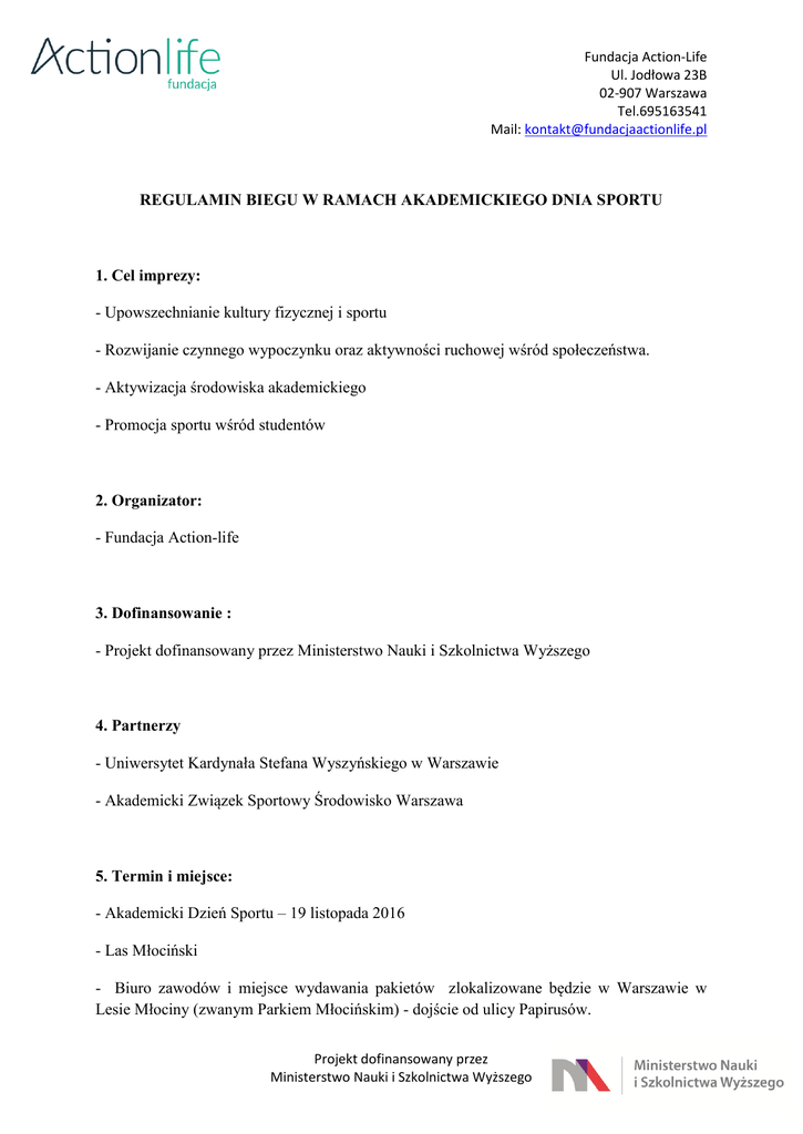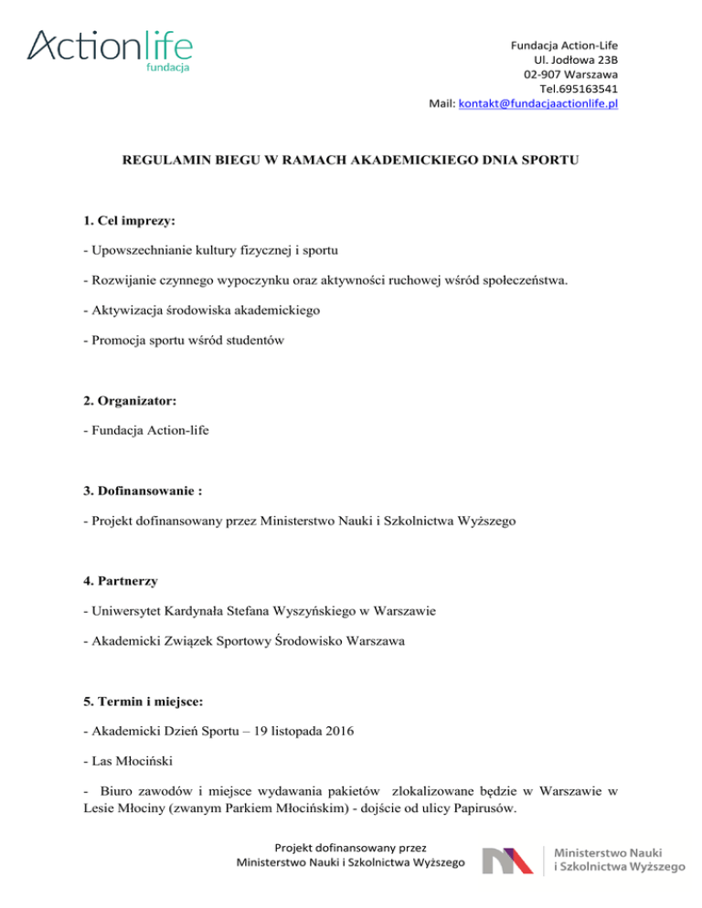 Fundacja Action-Life Ul. Jodłowa 23B 02-907 Warszawa Tel.695163541 Mail: [email protected] REGULAMIN BIEGU W RAMACH AKADEMICKIEGO DNIA SPORTU 1. Cel imprezy: - Upowszechnianie kultury fizycznej i sportu - Rozwijanie czynnego wypoczynku oraz aktywności ruchowej wśród społeczeństwa. - Aktywizacja środowiska akademickiego - Promocja sportu wśród studentów 2. Organizator: - Fundacja Action-life 3. Dofinansowanie : - Projekt dofinansowany przez Ministerstwo Nauki i Szkolnictwa Wyższego 4. Partnerzy - Uniwersytet Kardynała Stefana Wyszyńskiego w Warszawie - Akademicki Związek Sportowy Środowisko Warszawa 5. Termin i miejsce: - Akademicki Dzień Sportu – 19 listopada 2016 - Las Młociński - Biuro zawodów i miejsce wydawania pakietów zlokalizowane będzie w Warszawie w Lesie Młociny (zwanym Parkiem Młocińskim) - dojście od ulicy Papirusów. Projekt dofinansowany przez Ministerstwo Nauki i Szkolnictwa Wyższego Fundacja Action-Life Ul. Jodłowa 23B 02-907 Warszawa Tel.695163541 Mail: [email protected] 6. Harmonogra: - 9:00 – 11.30 wydawanie pakietów startowych - 11.30 - koniec przyjmowania zgłoszeń - 11.45 – wspólna rozgrzewka - 12:00 – Start biegu - 12:45 – Ostatni zawodnik przekracza linię mety - 13:15 – Dekoracja 7. Zasady uczestnictwa: - w zawodach może wziąć udział każdy pełnoletni zawodnik, który: zgłosi się do biegu przy pomocy formularza zgłoszeniowego, wniesie opłatę startową oraz podpisze oświadczenie o biegu na własną odpowiedzialność (podstawa prawna: Rozporządzenie Ministra Edukacji Narodowej z dnia 12.09.2001r. Dz. U. Nr 101 poz. 1095); - zawodnicy w wieku 16-18 lat (którzy w dniu biegu nie osiągnęli jeszcze pełnoletniości) zobowiązani są do posiadania pozwolenia na udział od rodziców lub prawnych opiekunów, z ich podpisem i nr PESEL. Warunkiem dopuszczenia ich do startu jest obecność rodzica lub opiekuna wraz z dowodem osobistym w momencie weryfikacji zawodnika w biurze zawodów; - uczestnicy wyrażają zgodę na przetwarzanie danych osobowych dla potrzeb wewnętrznych organizatora; - uczestnicy wyrażają zgodę na wykorzystanie przez organizatora ich wizerunku w celu promocji wydarzeń organizowanych przez Fundację i dokumentowania zawodów, a także na wykorzystanie ich wizerunku w celu przez podmioty współorganizujące i partnerów oraz sponsorów zawodów. 8. Zgłoszenia: Projekt dofinansowany przez Ministerstwo Nauki i Szkolnictwa Wyższego Fundacja Action-Life Ul. Jodłowa 23B 02-907 Warszawa Tel.695163541 Mail: [email protected] - Zgłoszenia do biegu przyjmowane są przez Internet na stronie www.akademickidziensportu.pl do dnia 17 listopada 2016r. lub do dnia w którym zapisy zostaną zakończone. - zgłoszenie internetowe jest ważne po dokonaniu opłaty startowej (najpóźniej 2 dni przed zawodami, np.: opłaty można dokonać najpóźniej do godziny 23:59 w środę); - po tym terminie zgłoszenia będą przyjmowane w sekretariacie zawodów w dniu biegu w godzinach 09:00 - 11:30. Biuro zawodów zostaje zamknięte w dniu biegu o godzinie 11:30; - wszyscy zawodnicy muszą zostać zweryfikowani w Biurze Zawodów. Podczas weryfikacji zawodnicy muszą posiadać dokument potwierdzający tożsamość; - W przypadku wolnych numerów startowych będzie możliwość wykupienia pakietu statowego w dniu biegu. - Terminy przyjmowania zgłoszeń i wpłat mogą ulec zmianie decyzją organizatora. - Za zgłoszenie uważa się dostarczenie przez zawodnika prawidłowo wypełnionego formularza zgłoszeniowego (karty zgłoszeniowej) oraz wpłacenie opłaty startowej. - Opłata startowa nie podlega zwrotowi w żadnych okolicznościach za wyjątkiem jej dokonania po zamknięciu zapisów do biegu. - Studenci wszystkich uczelni startują w biegu bezpłatnie (przy rejestracji internetowej) - Opłata za pojedyncze zawody dla biegaczy, nie studentów, będzie wynosiła 25 zł. - Opłata za start dokonana w biurze zawodów będzie wynosiła 40zł. - Opłaty startowej dokonujemy na dane: Fundacja Action-Life Ul. Jodłowa 23B 02-907 Warszawa Numer konta: PL 06 1090 1043 0000 0001 2599 8408 W treści wpisując: wpłata na cele statutowe – Akademicki Dzień Sportu Projekt dofinansowany przez Ministerstwo Nauki i Szkolnictwa Wyższego Fundacja Action-Life Ul. Jodłowa 23B 02-907 Warszawa Tel.695163541 Mail: [email protected] 9. Klasyfikacje: Podczas biegu prowadzone będą następujące klasyfikacje: 1. Open kobiet i mężczyzn; 2. Studentów do lat 28, kobiet i mężczyzn 3. Studentów zrzeszonych w AZS w ramach Akademickich Mistrzostw Warszawy i Mazowsza, kobiet i mężczyzn 4. Senior 29 – 39 lat, kobiet i mężczyzn 5. Master <40 lat, kobiet i mężczyzn 6. Klasyfikacja drużynowa 7. Klasyfikacja uczelni Drużyną zgłoszoną do klasyfikacji uczelnianej może być grupa 5 zawodników (w tym co najmniej 1 kobieta) - oczywiście zespół może zgłosić więcej zawodników niż 5, może nawet posiadać 20 zawodników – reprezentująca tą samą uczelnię. Zespół musi posiadać własną taką samą (jednolitą dla każdego zawodnika) nazwę drużyny (taką samą dla wszystkich zawodników). Na liście startowej przy imieniu i nazwisku zawodniku, który chce reprezentować daną drużynę musi być podana taka sama nazwa uczelni dla każdego biegacza np. UW. Drużyną zgłoszoną do klasyfikacji drużynowej może być grupa 5 zawodników (w tym co najmniej 1 kobieta) - oczywiście zespół może zgłosić więcej zawodników niż 5, może nawet posiadać 20 zawodników - reprezentująca klub sportowy, klub biegacza, stowarzyszenie, firma lub grupa biegowa. Zespół musi posiadać własną taką samą (jednolitą dla każdego zawodnika) nazwę drużyny (taką samą dla wszystkich zawodników). Na liście startowej przy imieniu i nazwisku zawodniku, który chce reprezentować daną drużynę musi być podana taka sama nazwa drużyny dla każdego biegacza np. KS Warszawianka. 10. Nagrody: - Nagrody rzeczowe, za miejsca I-III w 