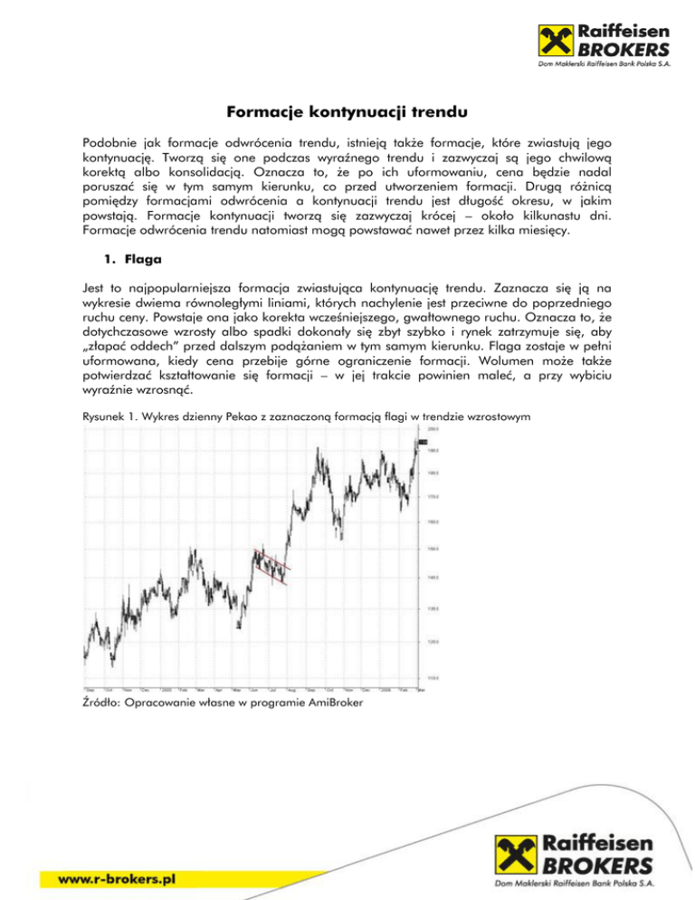 Formacje kontynuacji trendu Podobnie jak formacje odwrócenia trendu, istnieją także formacje, które zwiastują jego kontynuację. Tworzą się one podczas wyraźnego trendu i zazwyczaj są jego chwilową korektą albo konsolidacją. Oznacza to, że po ich uformowaniu, cena będzie nadal poruszać się w tym samym kierunku, co przed utworzeniem formacji. Drugą różnicą pomiędzy formacjami odwrócenia a kontynuacji trendu jest długość okresu, w jakim powstają. Formacje kontynuacji tworzą się zazwyczaj krócej – około kilkunastu dni. Formacje odwrócenia trendu natomiast mogą powstawać nawet przez kilka miesięcy. 1. Flaga Jest to najpopularniejsza formacja zwiastująca kontynuację trendu. Zaznacza się ją na wykresie dwiema równoległymi liniami, których nachylenie jest przeciwne do poprzedniego ruchu ceny. Powstaje ona jako korekta wcześniejszego, gwałtownego ruchu. Oznacza to, że dotychczasowe wzrosty albo spadki dokonały się zbyt szybko i rynek zatrzymuje się, aby „złapać oddech” przed dalszym podążaniem w tym samym kierunku. Flaga zostaje w pełni uformowana, kiedy cena przebije górne ograniczenie formacji. Wolumen może także potwierdzać kształtowanie się formacji – w jej trakcie powinien maleć, a przy wybiciu wyraźnie wzrosnąć. Rysunek 1. Wykres dzienny Pekao z zaznaczoną formacją flagi w trendzie wzrostowym Źródło: Opracowanie własne w programie AmiBroker Rysunek 2. Wykres dzienny NZD/USD z zaznaczoną formacją flagi w trendzie spadkowym Źródło: Opracowanie własne w programie AmiBroker 2. Chorągiewka Chorągiewka, tak jak i flaga, reprezentuje krótką przerwę podczas dynamicznego ruchu cen. Różni się od flagi tym, że ograniczenia formacji są nachylone ku sobie. Czyni to chorągiewkę podobną do formacji trójkąta symetrycznego. Jak więc odróżnić je od siebie? Tak jak wspomniano wcześniej, chorągiewka powstaje po gwałtownym ruchu, tworzy się krócej, a także jest mniejsza od trójkąta. Ponadto cena może wybić się z formacji trójkąta w przeciwną stronę, niż dotychczasowy trend – trójkąt jest wiec formacją kontynuacji albo odwrócenia trendu. Chorągiewka zwiastuje natomiast tylko trwanie dotychczasowej tendencji. Rys: Zelmer, wykres dzienny, chorągiewka w trendzie wzrostowym Rys: Lotos, wykres dzienny, chorągiewka w trendzie spadkowym 3. Prostokąt Ostatnią z tej grupy jest formacja prostokąta. Wygląda ona bardzo podobnie do flagi – także tworzą ją dwie równoległe linie. W odróżnieniu od flagi nie są one nachylone w przeciwnym kierunku do dotychczasowego trendu, tylko położone na wykresie horyzontalnie. Mimo prostoty kształtu tej formacji, trzeba ją bacznie obserwować, ponieważ jeśli będzie formowała się dłużej niż kilka tygodni, może to oznaczać szerszą konsolidację, co zwiększa prawdopodobieństwo zmiany dotychczasowego trendu. Podobnie jak w przypadku flagi i chorągiewki, wolumen podczas kształtowania się prostokąta powinien stopniowo maleć, aby po wybiciu ceny z konsolidacji gwałtownie wzrosnąć. Rys: NZD/JPY, wykres dzienny, prostokąt w trendzie wzrostowym Rys: NZD/USD, wykres dzienny, prostokąt w trendzie spadkowym Taktyka gry We wszystkich opisanych przypadkach, chcąc zająć długą pozycję podczas trendu wzrostowego, ustawia się zlecenie w niewielkiej odległości powyżej linii oporu (górna linia we wszystkich formacjach). Zlecenie obronne (stop-loss) powinno znajdować się tuż poniżej linii wsparcia (dolna linia) – na wypadek, gdyby doszło do fałszywego wybicia i formacja została zanegowana. Na odwrót dzieje się, gdy Inwestor chce zająć pozycję krótką – zlecenie składa trochę poniżej linii wsparcia, natomiast stop-loss umieszczony jest tuż powyżej linii oporu. Zasięg formacji Także w ten sam sposób, dla wszystkich formacji kontynuacji trendu, oblicza się zasięg. Najłatwiej zrobić to na wykresie. W teorii zakres ruchu następujący po formacji powinien być taki sam, jak ten poprzedzający formację. Zasięg wcześniejszego ruchu mierzony jest od ostatniego dołka aż do najwyższego punktu formacji (niebieska strzałka). Aby poznać możliwy pułap cenowy, odkłada się tą samą strzałkę (dla odróżnienia zaznaczona na zielono) od poziomu, na którym cena wybiła się z formacji. Analogicznie postępuje się podczas spadku ceny – poprzedni ruch mierzony jest od ostatniego szczytu do najniższego punktu w formacji, a zasięg ujawnia się, gdy odmierzy się ten ruch od poziomu, w którym cena przebiła formację w dół.