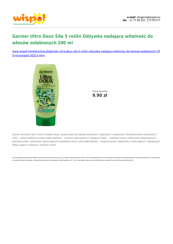 e-mail: [email protected] tel. : 17 77 00 557, 177707177 Garnier Ultra Doux Siła 5 roślin Odżywka nadająca witalność do włosów osłabionych 200 ml www.wispol.tiointeractive.pl/garnier-ultra-doux-sila-5-roslin-odzywka-nadajaca-witalnosc-do-wlosow-oslabionych-20 0-ml-produkt-20313.html Cena brutto: 9.90 zł Garnier Ultra Doux Siła 5 roślin to źródło energii i przyjemności dla włosów normalnych, osłabionych i zmęczonych. Komplementarne właściwości 5 roślin: - zielona herbata to znane źródło witalności, - cytryna o właściwościach nadających blask, - eukaliptus znany z właściwości odświeżających, pokrzywa znana z właściwości ograniczających wydzielanie serum, jako źródło lekkości, - werbena słynna z właściwości zmiękczających i łagodzących. Piękny zapach o ziołowych, świeżych nutach. *Ceny obowiązują wyłącznie przy składaniu zamówień przez sklep internetowy. Ceny w sklepach mogą nieznacznie różnić się od cen prezentowanych na stronach sklepu internetowego. Przedstawiona oferta w sklepie internetowym nie stanowi oferty w rozumieniu Kodeksu Cywilnego, i jest jedynie zaproszeniem do rozpoczęcia rokowań (zgodnie z art. 71 k.c.). Zastrzegamy sobie prawo do niezrealizowania zamówień z ważnych przyczyn ekonomicznych.
