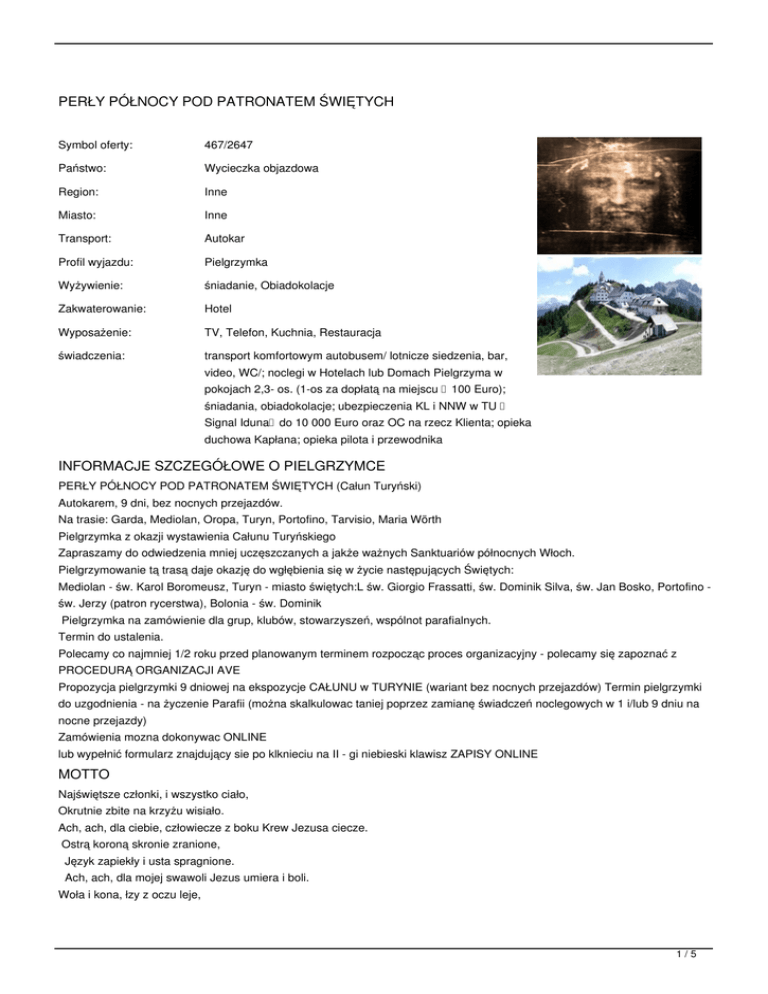Propozycja pielgrzymki 9 dniowej na ekspozycje CAŁUNU w TURYNIE (wariant bez nocnych przejazdów) Termin pielgrzymki