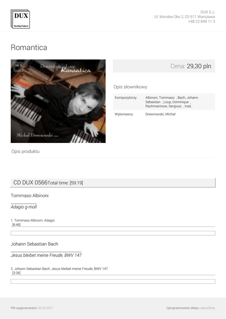 DUX S.J. Ul. Morskie Oko 2, 02-511 Warszawa +48 22 849 11 3 Romantica Cena: 29,30 pln Opis słownikowy Kompozytorzy Albinoni, Tommaso ∎, Bach, Johann Sebastian ∎, Loup, Dominique ∎, Rachmaninow, Sergiusz ∎, trad., ∎ Wykonawcy Drewnowski, Michał ∎ Opis produktu CD DUX 0566Total time: [59:19] Tommaso Albinoni Adagio g-moll 1. Tommaso Albinoni: Adagio [8:49] Johann Sebastian Bach Jesus bleibet meine Freude, BWV 147 2. Johann Sebastian Bach: Jesus bleibet meine Freude, BWV 147 [3:36] Plik wygenerowano: 02-03-2017 Oprogramowanie sklepu: AptusShop DUX S.J. Ul. Morskie Oko 2, 02-511 Warszawa +48 22 849 11 3 Sergiusz Rachmaninow Wokaliza op. 34 nr 14 (Vocalise Op.34 No.14) 3. Sergey Rachmaninov: Vocalise Op.34 No.14 [7:02] trad. Traditional French Songs (arr. Dominique Loup) 4. I. Il est né le divin Enfant [1:14] 5. II. La marche des Rois [1:45] 6. III. Entre le boeuf et l’âne gris [1:09] 7. IV. Mon beau sapin [0:52] 8. V. Les compagnons de la Marjolaine [0:56] 9. VI. Fait dodo, Cola mon petit frere [2:06] Dominique Loup Homage To Chopin 10. Dominique Loup: Homage To Chopin [5:25] Dominique Loup The Prayer Plik wygenerowano: 02-03-2017 Oprogramowanie sklepu: AptusShop DUX S.J. Ul. Morskie Oko 2, 02-511 Warszawa +48 22 849 11 3 11. Dominique Loup: The Prayer [2:56] Dominique Loup My first waltz 12. Dominique Loup: My first waltz [2:40] Dominique Loup Romantic Studies 13. No. 6 [3:01] 14. No. 11 [2:14] 15. No. 21 [2:00] 16. No. 20 [3:05] Dominique Loup Modern times 17. Modern times [5:08] Dominique Loup Ragtime 18. Ragtime Plik wygenerowano: 02-03-2017 Oprogramowanie sklepu: AptusShop DUX S.J. Ul. Morskie Oko 2, 02-511 Warszawa +48 22 849 11 3 [2:40] Dominique Loup Boogie 19. Boogie [2:40] Wykonawcy: Michał Drewnowski /fortepian/ Plik wygenerowano: 02-03-2017 Powered by TCPDF (www.tcpdf.org) Oprogramowanie sklepu: AptusShop