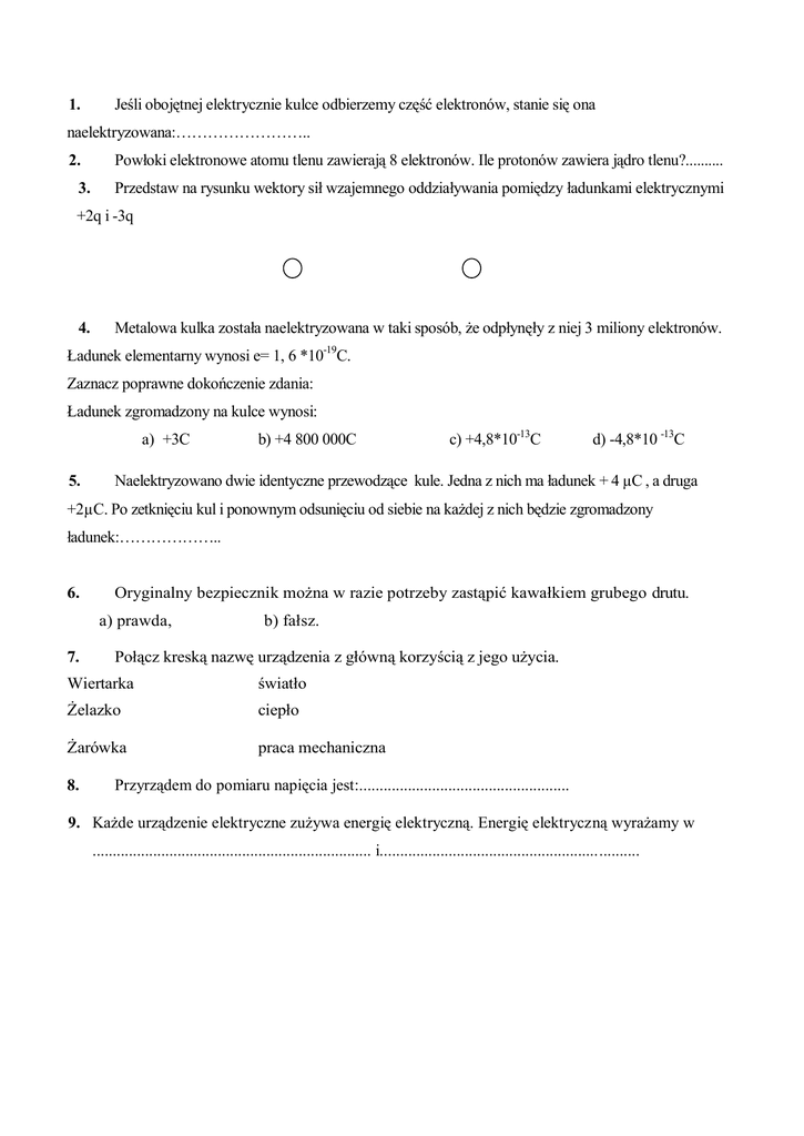 1. Jeśli obojętnej elektrycznie kulce odbierzemy część elektronów, stanie się ona naelektryzowana:…………………….. 2. 3. Powłoki elektronowe atomu tlenu zawierają 8 elektronów. Ile protonów zawiera jądro tlenu?.......... Przedstaw na rysunku wektory sił wzajemnego oddziaływania pomiędzy ładunkami elektrycznymi +2q i -3q 4. Metalowa kulka została naelektryzowana w taki sposób, że odpłynęły z niej 3 miliony elektronów. Ładunek elementarny wynosi e= 1, 6 *10-19C. Zaznacz poprawne dokończenie zdania: Ładunek zgromadzony na kulce wynosi: a) +3C 5. b) +4 800 000C c) +4,8*10-13C d) -4,8*10 -13C Naelektryzowano dwie identyczne przewodzące kule. Jedna z nich ma ładunek + 4 µC , a druga +2µC. Po zetknięciu kul i ponownym odsunięciu od siebie na każdej z nich będzie zgromadzony ładunek:……………….. 6. Oryginalny bezpiecznik można w razie potrzeby zastąpić kawałkiem grubego drutu. a) prawda, 7. b) fałsz. Połącz kreską nazwę urządzenia z główną korzyścią z jego użycia. Wiertarka światło Żelazko ciepło Żarówka praca mechaniczna 8. Przyrządem do pomiaru napięcia jest:.................................................... 9. Każde urządzenie elektryczne zużywa energię elektryczną. Energię elektryczną wyrażamy w ..................................................................... i................................................................ 10. O urządzeniach, w których prąd elektryczny wykonuje w krótkim czasie dużą pracę mówimy, że mają dużą ..................... 11. Naszkicuj schemat obwodu elektrycznego, w skład, którego wchodzą: źródło napięcia, żarówka, wyłącznik i woltomierz mierzący napięcie na żarówce. Zaznacz umowny kierunek prądu w obwodzie. 12. Jeśli napięcie przyłożone między końce przewodnika zwiększymy 3 razy, to natężenie prądu płynącego w tym przewodniku.........................................................razy. 13. Oblicz opór elektryczny odbiornika włączonego do obwodu, dla którego sporządzono ten wykres. 14. Jakie natężenie prądu wskazuje amperomierz A1, jeśli amperomierz A3 wskazuje 1A, a amperomierz A2 wskazuje 0,2 A? 15. Jeśli w pewnej substancji istnieją swobodne elektrony, a po wytworzeniu w tej substancji pola elektrycznego powodujemy ich uporządkowany ruch, to taka substancja nazywa się:........................................................... 16. W pewnym przewodniku przepłynął ładunek 2000 Ah. Ile to kulombów? 17. Oblicz czas przepływu prądu elektrycznego o natężeniu 250 mA , jeżeli w tym czasie przez przewodnik przemieścił się ładunek 12 C. 18. Instalacja elektryczna o napięciu 220 V zasila mieszkanie, w którym jest włączona lampa, lodówka i kuchenka mikrofalowa. Przez te urządzenia płynie prąd elektryczny o natężeniach 1,5 A; 0,01 A i 5 A. Czy bezpiecznik 10-amperowy "wytrzyma" włączenie jeszcze żelazka o mocy 1000 W? Uzasadnij odpowiedź 19. W piorunie przepłynął ładunek 6 C . Jaka wówczas wydzieliła się energia(praca), jeżeli napięcie między chmurą a ziemia wynosiło 108V? 20. Oblicz natężenia prądu wskazywane przez amperomierze A1 i A2 1. Jeśli obojętnej elektrycznie kulce dostarczymy elektrony, stanie się ona naelektryzowana:…………………. 2. Powłoki elektronowe atomu węgla zawierają elektronów. Jądro zawiera 12 nukleonów. Ile neutronów zawiera jądro węgla?................... 3. Przedstaw na rysunku wektory sił wzajemnego oddziaływania pomiędzy ładunkami elektrycznymi +2q i +q 4. Metalowa kulka została naelektryzowana w taki sposób, że napłynęły do niej 2 miliony elektronów. Ładunek elementarny wynosi e= 1, 6 *10-19C. Zaznacz poprawne dokończenie zdania: Ładunek zgromadzony na kulce wynosi: a) -2C 5. c) +3,2*10-13C b) -2 000 000C d) -3,2*10 -13C Naelektryzowano dwie identyczne przewodzące kule. Jedna z nich ma ładunek + 3 µC , a druga +5 µC. Po zetknięciu kul i ponownym odsunięciu od siebie na każdej z nich będzie zgromadzony ładunek:……………….. 6. Wspinanie się na słupy elektryczne nie grozi żadnym niebezpieczeństwem. a) prawda, 7. b) fałsz. Połącz kreską wielkość fizyczną z jej jednostką: Natężenie prądu wolt Napięcie om Energia elektryczna amper Opór elektryczny dżul 8. Przyrządem do pomiaru natężenia prądu elektrycznego jest.............................................. 9. Każde urządzenie elektryczne pracuje z pewną mocą. Moc urządzenia wyrażamy w........................................... 10. Tata zakupił 2 żarówki. Na jednej znajduje się napis: 230 V, 40 W, a na drugiej: 230 V, 60 W. Która żarówka będzie świecić jaśniej?............................................................... 11. Naszkicuj schemat obwodu elektrycznego, w skład którego wchodzą: źródło napięcia, wyłącznik, opornik i amperomierz. Zaznacz umowny kierunek prądu w obwodzie. 12. Jeśli napięcie przyłożone między końce przewodnika zmniejszymy 4 razy, to natężenie prądu w tym przewodniku....................................................................razy. 13. Oblicz opór elektryczny odbiornika włączonego do obwodu, dla którego sporządzono ten wykres. 14. Jakie napięcie U2 wskazuje woltomierz włączony między końce drugiego odbiornika, jeśli wskazanie pierwszego wynosi U1=10V? U=24 V 15. Substancja, w której nie ma elektronów swobodnych i w której po przyłożeniu napięcia nie płynie prąd elektryczny. Ta substancja nazywa się...................................................................... 16. W pewnym mieszkaniu zużyto 3kWh energii elektrycznej. Ile to dżuli? 17. Oblicz natężenie prądu w przewodniku, jeżeli w ciągu jednej minuty, przez jego przekrój poprzeczny przepłynął ładunek 300 C. 18. Oblicz pracę prądu elektrycznego o natężeniu 0,2 A płynącego przez żarówkę podłączoną do baterii o napięciu 3V, jeżeli prąd ten płynął w czasie 10 sekund. 19. Żelazk