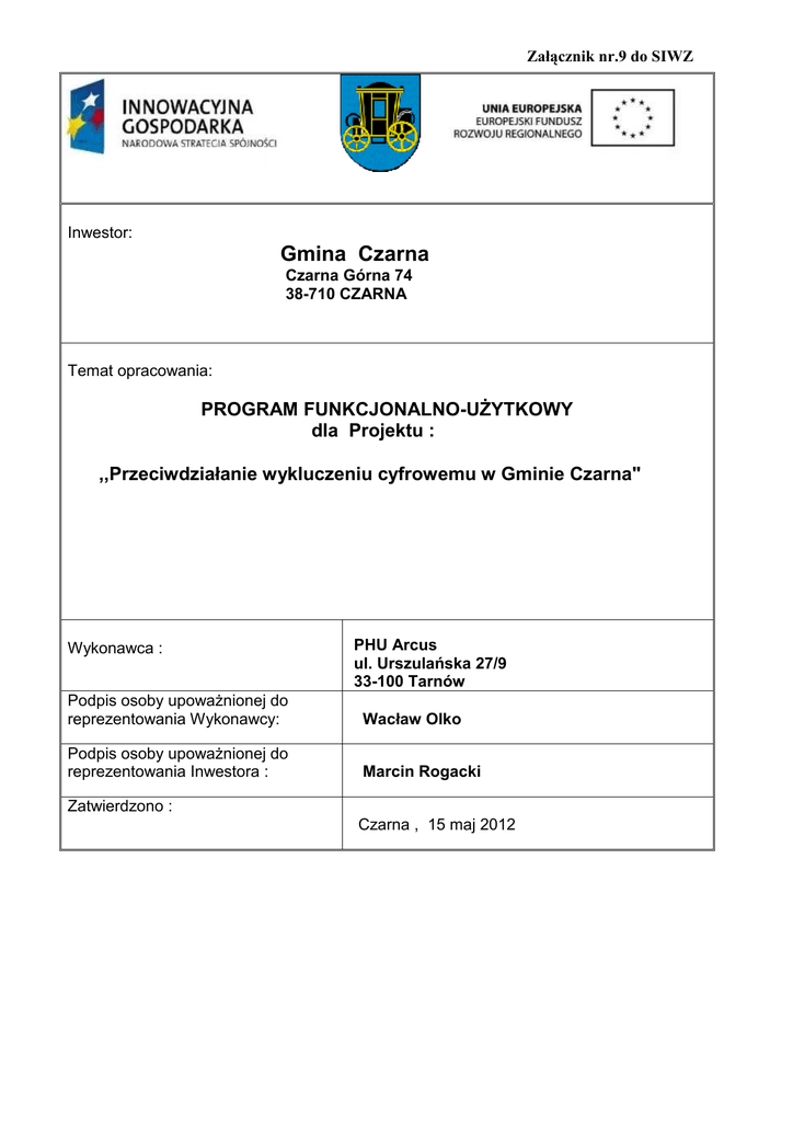 Załącznik nr.9 do SIWZ Inwestor: Gmina Czarna Czarna Górna 74 38-710 CZARNA Temat opracowania: PROGRAM FUNKCJONALNO-UŻYTKOWY dla Projektu : ,,Przeciwdziałanie wykluczeniu cyfrowemu w Gminie Czarna" Wykonawca : PHU Arcus ul. Urszulańska 27/9 33-100 Tarnów Podpis osoby upoważnionej do reprezentowania Wykonawcy: Wacław Olko Podpis osoby upoważnionej do reprezentowania Inwestora : Marcin Rogacki Zatwierdzono : Czarna , 15 maj 2012 Załącznik nr.9 do SIWZ Opis przedmiotu zamówienia wg Wspólnego Słownika Zamówień (CPV): 1) 442 12263-0 (maszty radiowe) 2) 324 20000-3 (urządzenia sieciowe) 3) 324 21000-0 (okablowanie sieciowe) 4) 324 22000-7 (elementy składowe sieci) 5) 453 10000-3 (roboty instalacyjne elektryczne) 6) 453 11000-0 (roboty w zakresie okablowania oraz instalacji elektrycznych) 7) 454 53000-7 (roboty remontowe i renowacyjne) 8) 302 30000-0 (urządzenia komputerowe) 9) 805 00000-9 (usługi szkoleniowe) 10) 805 33100-0 (usługi szkolenia komputerowego) 11) 503 00000-8 (usługi w zakresie napraw i konserwacji i podobne usługi dotyczące komputerów osobistych, sprzętu biurowego, sprzętu telekomunikacyjnego) Zawartość: Część opisowa programu Ogólne wymagania zamawiającego Aktualne uwarunkowania przedmiotu zamówienia Ogólne właściwości funkcjonalno-użytkowe Szczegółowe właściwości i wymagania funkcjonalno-użytkowe W zakresie budowy masztu antenowego oraz konstrukcji wsporczych pod anteny (elementy pasywne) 2. W zakresie adaptacji pomieszczenia na serwerownię główną wraz instalacją niezbędnych urządzeń i infrastruktury pasywnej w lokalizacji UG w Czarnej oraz w zakresie adaptacji pomieszczenia na serwerownię lokalną wraz z instalacją niezbędnych urządzeń i infrastruktury pasywnej w miejscowości Polana 3. W zakresie budowy niezbędnej infrastruktury sieci LAN, oraz dostawy niezbędnych urządzeń w budynkach jednostek podległych objętych projektem 4. W zakresie dostawy, instalacji, serwisu i modernizacji sprzętu komputerowego i oprogramowania 5. W zakresie organizacji szkoleń z podstaw obsługi komputera, pakietu biurowego, oraz obsługi Internetu VI. Ogólne warunki wykonania i odbioru robót VII. Część informacyjna programu I. II. III. IV. V. 1. Załącznik nr.9 do SIWZ I. CZĘŚĆ OPISOWA PROGRAMU Przedmiotem zamówienia jest realizacja projektu pt. ,,Przeciwdziałanie wykluczeniu cyfrowemu w Gminie Czarna" w modelu zaprojektuj, wybuduj, eksploatuj. Głównym celem projektu jest przeciwdziałanie zjawisku wykluczenia cyfrowego, jakie występuje, lub może występować, wśród mieszkańców Gminy Czarna . Przeprowadzony audyt infrastruktury posiadanej przez Gminę infrastruktury internetowej oraz zasięgu usług działających na tym terenie operatorów telekomunikacyjnych oraz ISP wykazał, że niezbędna jest częściowa budowa własnej infrastruktury pasywnej oraz udostępnienie obiektów Gminy na potrzeby budowy i instalacji infrastruktury aktywnej przez operatora zewnętrznego. Inwestor biorąc pod uwagę trudne warunki prowadzenia projektu ( obszar górzysty ) oraz rozmieszczenie beneficjentów końcowych i jednostek organizacyjnych przyjął obszary gdzie będzie realizowany projekt wg. kryterium efektywności celu projektu i wydatkowanych środków finansowych. Obszar ten jest na tyle duży, jak również występuje na nim znaczna grupa wykluczonych stąd alokacja beneficjentów końcowych w czasie trwania programu jest w pełni zagwarantowana. Z przeprowadzonej analizy przedwdrożeniowej wynika, że działający na terenie Gminy operatorzy wykorzystują głównie technologie bezprzewodowe jako podstawowe medium dostarczenia usług dostępu do Internetu. Technologia radiowa jest dla obszarów słabo zurbanizowanych najbardziej optymalna od strony kosztowej i jednocześnie zapewnia wymaganą wydajność, szybkość budowy oraz łatwe i tanie przyłączenie klientów do sieci dostępowej. Jednak infrastruktura którą posiadają nie jest wystarczająca, aby zapewnić możliwość skorzystania z usług Beneficjentom projektu, dlatego aby zapewnić osiągniecie celów, oraz wskaźników efektywnościowych, konieczne staje się stworzenie możliwości dla potencjalnych Operatorów na szybką rozbudowę ich infrastruktury i w konsekwencji zapewnienie usług szerokopasmowego Internetu dla obszarów objętych projektem. W związku z powyższym przedmiotem zamówienia są następujące zadania: 1. Opracowanie niezbędnej dokumentacji projektowej w zakresie budowy masztu 2. Przygotowanie infrastruktury pasywnej, która umożliwi instalację urządzeń radiowych Operatorowi który będzie świadczył usługi szerokopasmowego dostępu do Internetu (Operator zostanie wyłoniony w osobnym postepowaniu przetargowym) w następującym zakresie: a) Zakup i instalację masztu wraz z instalacjami teletechnicznymi w lokalizacji budynku przepompowni w miejscowości Czarna w celu umożliwienia instalacji urządzeń dostępowych zapewniających dystrybucję Internetu. b) Adaptację pomieszczenia na serwerownię główną wraz instalacją niezbędnych urządzeń infrastruktury pasywnej w lokalizacji UG w Czarnej Górnej oraz okablowania sieci LAN c) Adaptację pomieszczenia na serwerownię lokalną wraz instalacją niezbędnych urządzeń infrastruktury pasywnej w lokalizacji świetlicy w Polanie oraz instalacja okablowania sieci LAN 3. Wykonanie niezbędnej infrastruktury sieci LAN w budynkach jednostek podległych objętych projektem oraz dostawa niezbędnych urządzeń 4. Zakup i instalację zestawów komputerowych dla beneficjentów końcowych i jednostek podległych beneficjentowi. 5. Przeprowadzenie szkoleń z podstaw obsługi komputera oraz korzystania z zasobów Internetu dla beneficjentów końcowych 6. Świadczenie usług gwarancyjnych i serwisowych dla wykonanych prac i dostarczonych urządzeń, w tym przeprowadzenie jednorazowej modernizacji sprzętu komputerowego w jednostkach podległych i gospodarstwach domowych. Niniejszy Prog