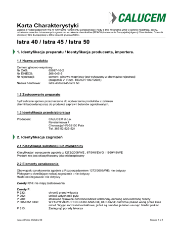 Karta Charakterystyki Zgodna z Rozporzadzeniem WE nr 1907/2006 Parlamentu Europejskiego i Rady z dnia 18 grudnia 2006 w sprawie rejestracji, oceny, udzielania zezwolen i stosowanych ograniczen w zakresie chemikaliów (REACH) i utworzenie Europejskiej Agencji Chemikaliów, Dziennik Urzedowy Unii Europejskiej L 396 z dnia 30 grudnia 2006 r. Istra 40 / Istra 45 / Istra 50 1. Identyfikacja preparatu / Identyfikacja producenta, importera. 1.1 Nazwa produktu Cement glinowo-wapniowy Nr CAS: 65997-16-2 Nr EINECS: 266-045-5 Nr rejestracji: cement glinowo-wapniowy jest wyłączony z obowiązku rejestracji (załącznik V Rozp. REACH 1907/2006) Nazwa handlowa: Istra 40/Istra45/Istra 50 1.2 Zastosowanie preparatu hydrauliczne spoiwo przeznaczone do wytwarzania produktów z zakresu chemii budowlanej oraz do produkcji zapraw i betonów ogniotrwałych. 1.3 Identyfikacja przedsiębiorstwa Producent: CALUCEM d.o.o. Revelanteova 4 Chorwacja/HR-52100 Pula Tel. 385 52 529-521 2. Identyfikacja zagrożeń 2.1 Klasyfikacja substancji lub mieszaniny Klasyfikacja i oznaczenie zgodnie z 1272/2008/WE , 67/548/EWG i 1999/45/WE Produkt nie jest sklasyfikowany jako niebezpieczny 2.2 Elementy oznakowania Obowiązek oznakowania zgodnie z Rozporządzeniem 1272/2008/WE: nie dotyczy Piktogramy określające rodzaj zagrożenia : nie dotyczy Hasło ostrzegawcze: nie dotyczy Zwroty R/H: nie mają zastosowania Zwroty P: P 232: P 262: P 280: P 305+351+338: P 313: Istra 40/Istra 45/Istra 50 chronić przed wilgocią unikać wdychania pyłu stosować rękawice ochronne/odzież ochronną /ochronę oczu/ochronę twarzy W PRZYPADKU PRZEDOSTANIA SIĘ DO OCZU; ostrożnie płukać wodą przez klika minut. Wyjąć soczewki kontaktowe, jeżeli są i można je łatwo usunąć. Nadal płukać. Zasięgnąć porady lekarza Strona 1 z 8 Karta Charakterystyki: Istra 40 / Istra 45 / Istra 50 Zwroty S: S 22: S 37/39: S 26: S 8: Data wydania: 23.03.2012 nie wdychać pyłu nosić odpowiednie rękawice ochronne/nosić okulary lub ochronę twarzy zanieczyszczone oczy przemyć natychmiast dużą ilością wody i zasięgnąć porady lekarza przechowywać w suchym miejscu 2.3 Cement glinowo-wapniowy nie spełnia kryteriów dla PBT lub vPvB zgodnie z załącznikiem XIII Rozporządzenia REACH 1907/2006 Po zmieszaniu z wodą u osób wrażliwych może wywoływać podrażnienia oczu, skóry i błony śluzowej. Istnieje niebezpieczeństwo mechanicznych obrażeń rogówki oka. Pył powoduje podrażnienie układu oddechowego. 3. Skład i informacja o składnikach. Nazwa chemiczna klinkier glinowowapniowy zawartość % > 99,5 Nr CAS 65997-16-2 Nr EEC 266-045-5 Nr REACH Wyłączony na podst. załącznika V (REACH 1907) Symbol brak Zwroty R/H nie mają zastosowania Cement glinowo-wapniowy nie zawiera krzemionki krystalicznej ( jak kwarc, trydymit czy krystobalit) w mierzalnych ilościach. Zawartość rozpuszczalnego chromu VI poniżej 2 ppm (0,0002 Ma.%) wg TRGS 613 i DIN-EN 196-10 4. Środki pierwszej pomocy 4.1 pierwsza pomoc - - w przypadku zatrucia drogą oddechową wyprowadzić lub wynieść poszkodowanego na świeże powietrze. Skonsultować się z lekarzem jeżeli konieczne. w przypadku zanieczyszczenia oczu wyjąć soczewki kontaktowe, jeżeli są i można je usunąć. Natychmiast przepłukać oczy dużą ilością wody przez co najmniej 15 min., również pod powiekami. Wezwać lekarza. przylegający do skóry pył usunąć na sucho szczotką (przed umyciem). Następnie zmyć wodą z mydłem. Jeżeli konieczne zasięgnąć porady lekarza. w razie połknięcia wypłukać usta wodą , nie wywoływać wymiotów. Skonsultować się z lekarzem. 4.2 najważniejsze ostre i opóźnione objawy oraz skutki narażenia Wdychanie pyłu może powodować astmę, ucisk w klatce piersiowej, zapalenie gardła i kaszel. Roztwór wodny może powodować podrażnienie oczu, skóry i błon śluzowych. Długotrwałe, powtarzające się wdychanie pyłu może zwiększać ryzyko chorób płuc. 4.3. wskazania dotyczące natychmiastowej pomocy lekarskiej i postępowania z poszkodowanym Leczenie objawowe Istra 40/Istra 45/Istra 50 Strona 2 z 8 Karta Charakterystyki: Istra 40 / Istra 45 / Istra 50 Data wydania: 23.03.2012 5. Postępowanie w przypadku pożaru. 5.1 środki gaśnicze Cement glinowo-wapienny jest niepalny i nie podtrzymuje spalania innych substancji. Ewentualnie , powstający pył usunąć strumieniem wody. 5.2 szczególne zagrożenia związane z substancją lub mieszaniną Podczas pożaru mogą powstawać pyły, unikać ich wdychania 5.3 informacje dla straży pożarnej - specjalne wyposażenie ochronne Nie są wymagane żadne szczególne środki, gdyż cement glinowo-wapniowy nie stanowi zagrożenia pożarowego - dodatkowe wskazówki Pozostałości po pożarze i zużytą wodę gaśniczą usuwać zgodnie z lokalnymi przepisami. W przypadku kontaktu cementu z wodą poczekać aż stężeje, usunąć mechanicznie. 6. Postępowanie w przypadku niezamierzonego uwolnienia do środowiska. 6.1 Indywidualne środki ostrożności, wyposażenie ochronne i procedury w sytuacjach awaryjnych Unikać tworzenia i rozprzestrzeniania się pyłu. 6.2 Środki ostrożności w zakresie ochrony środowiska Unikać niekontrolowanego wprowadzania do systemu odwadniającego i kanalizacji, szczególnie po niekontrolowanym dodaniu wody. Unikać zanieczyszczenia cementem wód gruntowych. 6.3 Metody i materiały zapobiegające rozprzestrzenianiu się skażenia i służące do usuwania skażenia Zbierać mechanicznie ( zgarnąć szuflą lub pozamiatać). Rozsypanego produktu nie wsypywać z powrotem do oryginalnego opakowania w celu ponownego użycia. W przypadku kontaktu cementu z wodą poczekać aż stężeje , usunąć mechanicznie. 6.4 Odniesienie do innych sekcji Przestrzegać wskazań sekcji 8 do 13. Istra 40/Istra 45/Istra 50 Strona 3 z 8 Karta Charakterystyki: Istra 40 / Istra 45 / Istra 50 Data wydania: 23.03.2012 7. Postępowanie z substancjami i mieszaninami i ich magazynowanie 7.1.1 Środki