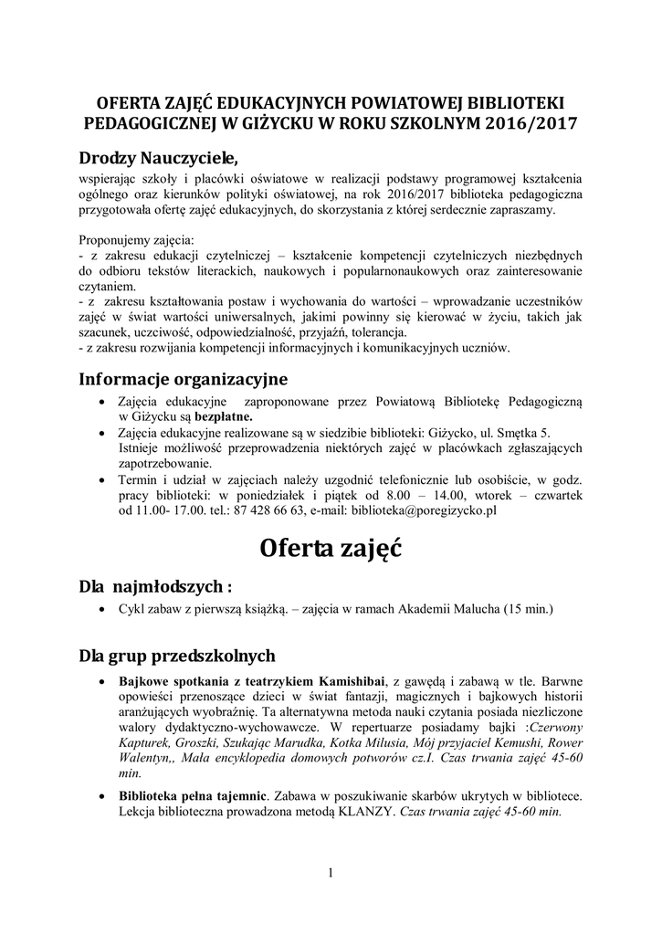 OFERTA ZAJĘĆ EDUKACYJNYCH POWIATOWEJ BIBLIOTEKI PEDAGOGICZNEJ W GIŻYCKU W ROKU SZKOLNYM 2016/2017 Drodzy Nauczyciele, wspierając szkoły i placówki oświatowe w realizacji podstawy programowej kształcenia ogólnego oraz kierunków polityki oświatowej, na rok 2016/2017 biblioteka pedagogiczna przygotowała ofertę zajęć edukacyjnych, do skorzystania z której serdecznie zapraszamy. Proponujemy zajęcia: - z zakresu edukacji czytelniczej – kształcenie kompetencji czytelniczych niezbędnych do odbioru tekstów literackich, naukowych i popularnonaukowych oraz zainteresowanie czytaniem. - z zakresu kształtowania postaw i wychowania do wartości – wprowadzanie uczestników zajęć w świat wartości uniwersalnych, jakimi powinny się kierować w życiu, takich jak szacunek, uczciwość, odpowiedzialność, przyjaźń, tolerancja. - z zakresu rozwijania kompetencji informacyjnych i komunikacyjnych uczniów. Informacje organizacyjne Zajęcia edukacyjne zaproponowane przez Powiatową Bibliotekę Pedagogiczną w Giżycku są bezpłatne. Zajęcia edukacyjne realizowane są w siedzibie biblioteki: Giżycko, ul. Smętka 5. Istnieje możliwość przeprowadzenia niektórych zajęć w placówkach zgłaszających zapotrzebowanie. Termin i udział w zajęciach należy uzgodnić telefonicznie lub osobiście, w godz. pracy biblioteki: w poniedziałek i piątek od 8.00 – 14.00, wtorek – czwartek od 11.00- 17.00. tel.: 87 428 66 63, e-mail: [email protected] Oferta zajęć Dla najmłodszych : Cykl zabaw z pierwszą książką. – zajęcia w ramach Akademii Malucha (15 min.) Dla grup przedszkolnych Bajkowe spotkania z teatrzykiem Kamishibai, z gawędą i zabawą w tle. Barwne opowieści przenoszące dzieci w świat fantazji, magicznych i bajkowych historii aranżujących wyobraźnię. Ta alternatywna metoda nauki czytania posiada niezliczone walory dydaktyczno-wychowawcze. W repertuarze posiadamy bajki :Czerwony Kapturek, Groszki, Szukając Marudka, Kotka Milusia, Mój przyjaciel Kemushi, Rower Walentyn,, Mała encyklopedia domowych potworów cz.I. Czas trwania zajęć 45-60 min. Biblioteka pełna tajemnic. Zabawa w poszukiwanie skarbów ukrytych w bibliotece. Lekcja biblioteczna prowadzona metodą KLANZY. Czas trwania zajęć 45-60 min. 1 Spotkania w bibliotecznej BAJKOWNI. Bajkoterapia. zajęcia oparte na tekstach B.Ferrero, I. Boreckiej, M.Molickiej , E.J. Koniecznej, R. J Jędrzejewskiej-Wróbel, Z. Staneckiej, M. Piguemala’a i innych.. Tematyka zajęć do uzgodnienia z wychowawcą grupy. Czas trwania zajęć 45-60 min. Dla klas 0-III Bajkowe spotkania z teatrzykiem Kamishibai, z gawędą i zabawą w tle . Barwne opowieści przenoszące dzieci w świat fantazji, magicznych i bajkowych historii aranżujących wyobraźnię. Ta alternatywna metoda nauki czytania posiada niezliczone walory dydaktyczno- wychowawcze. W repertuarze posiadamy bajki :Czerwony Kapturek, Groszki, Szukając Marudka, Kotka Milusia, Mój przyjaciel Kemushi, Rower Walentyny, Mała encyklopedia domowych potworów cz.I.i II. Czas trwania zajęć 45 min – 60 min. Lekcje biblioteczne z cyklu: „W dialogu z tekstem literackim” Dialog jest podstawowym i najważniejszym sposobem porozumiewania się ludzi. Proponowana przez nas metoda , obok kompetencji kulturowych i polonistycznych, rozwija również kompetencje społeczne. W metodzie dialogu z tekstem literackim utwór jest jego pełnoprawnym uczestnikiem. Tematyka zaproponowanych zajęć wpisuje się w kierunki polityki oświatowej i realizację podstawy programowej . Czas trwania zajęć 45-90 min. 1. W krainie smoków – B. Ferrero 2. Moje- nie moje – L. Bardijewska 3. D.O.M.E.K – A. i D. Mizielińscy 4. Asiunia - J. Papuzińska Jak powstaje książka?- lekcja biblioteczna połączona z prezentacją multimedialną. (45 min.) Biblioterapia – zajęcia oparte na tekstach B.Ferraro, I. Boreckiej, M.Molickiej , E.J. Koniecznej, R. J Jędrzejewskiej-Wróbel, Z. Staneckiej, M. Piguemala i innych.. Tematyka zajęć do uzgodnienia z wychowawcą klasy, pedagogiem, lub nauczycielem zgłaszającym problem. Czas trwania zajęć do uzgodnienia.( od 45min.) Dla klas IV – VI Bajkowe spotkania z teatrzykiem Kamishibai, z gawędą i zabawą w tle . Barwne opowieści przenoszące dzieci w świat fantazji, magicznych i bajkowych historii aranżujących wyobraźnię. Ta alternatywna metoda nauki czytania posiada niezliczone walory dydaktyczno- wychowawcze. W repertuarze posiadamy bajki: Trzeba będzie, Jabłka pana Peabody’ego, Mała encyklopedia domowych potworów cz.I.i II. Czas trwania zajęć 45– 60 min. Lekcje biblioteczne z cyklu: W dialogu z tekstem literackim. Dialog jest podstawowym i najważniejszym sposobem porozumiewania się ludzi. Proponowana przez nas metoda , obok kompetencji kulturowych i polonistycznych, rozwija również kompetencje społeczne. W metodzie dialogu z tekstem literackim utwór jest jego pełnoprawnym uczestnikiem Czas trwania zajęć 45-60 min. 2 1. Po co w życiu są marzenia? – A. Maleszko, Magiczne drzewo. Czerwone krzesło 2. J. Papuzińska - Asiunia (tematyka do uzgodnienia) 3. J. Chmielewska – Pamiętnik Blumki (tematyka do uzgodnienia) 4. Czy należy wybaczać innym? Rzecz o ludzkich cechach słowika na podstawie baśni H.Ch. Andersena Słowik (45 min) W poszukiwaniu zagubionej informacji – gra biblioteczna. Czas trwania zajęć 45 min. Co wiem o książce i bibliotece. Lekcja biblioteczna z wykorzystaniem gier i zabaw dydaktycznych ( 45 min) Biblioterapia - zajęcia oparte na tekstach B.Ferraro, I. Boreckiej, M.Molickiej , E.J. Koniecznej, R. J Jędrzejewskiej-Wróbel, Z. Staneckiej, M. Piguemala i innych.. Tematyka zajęć do uzgodnienia z wychowawcą klasy, pedagogiem, lub nauczycielem zgłaszającym problem. Czas trwania zajęć 45 – 60 min. Dla gimnazjum Lekcje biblioteczne z cyklu: W dialogu z tekstem literackim. Dialog jest podstawowym i najważniejszym sposobem porozumiewania się ludzi. Proponowana przez nas metoda 