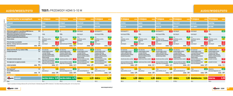 test: przewody hdmi 5-10 m *Niezależnie od udzielonej przez producenta gwarancji na produkt kupującemu przysługuje roszczenie z tytułu niezgodności towaru z umową do 2 lat od momentu odebrania produktu od sprzedawcy (art. 10 pkt 1 ustawy z dnia 27 lipca 2002 roku o szczególnych warunkach sprzedaży konsumenckiej oraz o zmianie Kodeksu cywilnego) AUDIO/WIDEO/FOTO 56 Wyniki testów w szczegółach waga 1 miejsce ocena 2 miejsce ocena AUDIO/WIDEO/FOTO 3 miejsce ocena 3 miejsce ocena 5 miejsce ocena 6 miejsce ocena 7 miejsce ocena 8 miejsce ocena 9 miejsce ocena 10 miejsce Producent Hama Profigold Voice Kraft Techlink Techlink Spydee Techlink Voice Kraft ActiveJet Bandridge Model 43085 PROV1010 No name Wires NX Wires XS SP5005 Wires CR No name AKV-00059 BVL1005 Dane techniczne Deklarowana zgodność ze specyfikacją HDMI (dane na opakowaniu/deklaracja dystrybutora) Maksymalny obsługiwany tryb obrazu HD (dane na opakowaniu/deklaracja dystrybutora) Długość przewodu deklarowana/zmierzona Rodzaj wtyków 15% 1440p 5% 3% Filtry ferrytowe na przewodzie Materiał, z którego wykonano przewodniki Dane techniczne 1% 1% suma 25% Jakość przewodu Odtwarzanie filmu Blu-ray, standard 1080p Estetyka wykonania 35% 5% Test jakości montażu wtyczek 15% Test odporności na zagięcie przewodu 15% Jakość przewodu Serwis Okres gwarancji* Strona WWW producenta Serwis Ocena pośrednia Jakość Cena 1 6,00 1,3 suma 70% 5% 5m plastikowe, proste, pozłacane brak brak danych suma 5% 6,00 1080p 4,50 4,00 10 m metalowe, proste, pozłacane 1,00 brak 2,00 miedź beztlenowa 99,9996% ocena 5,10 ocena test zaliczony przewód okrągły w osłonie z czarnego tworzywa sztucznego, plastikowe wtyki, pozłacane konektory, wrażenie taniego przewodu zaliczony (widoczne lekkie ślady testu na przewodzie) zaliczony (widoczne lekkie ślady testu na przewodzie) ocena 1 rok www.hama.pl 1,3 6,00 2,50 test zaliczony przewód okrągły w osłonie z tworzywa, metalowe wtyki, pozłacane konektory, wrażenie przewodu klasy średniej 2,00 brak danych brak danych 5,00 4,00 1,00 4,00 5,28 10 m plastikowe, proste, pozłacane są brak danych 6,00 3,50 2,00 brak danych/1.2 brak danych/1080p 5,00 4,00 6,00 2,00 ocena 3,00 test zaliczony przewód okrągły w osłonie z czarnego tworzywa, plastikowe wtyki zgrzewane, pozłacane konektory, wrażenie taniego przewodu 4,50 niezaliczony (obraz zanika) 1,00 zaliczony (widoczne ślady testu na przewodzie) 4,50 zaliczony (widoczne lekkie 4,50 zaliczony (widoczne ślady ślady testu na przewodzie) testu na przewodzie) 5,11 ocena 4,43 ocena 5m plastikowe, proste, pozłacane brak brak danych 6,00 2,50 brak danych/1080p 4,50 4,00 1,00 2,00 ocena 2,70 test zaliczony przewód okrągły w osłonie z tworzywa sztucznego, plastikowe wtyki, pozłacane konektory, wrażenie przewodu podstawowej klasy 4,00 zaliczony (widoczne ślady testu na przewodzie) 4,00 zaliczony (widoczne ślady testu na przewodzie) 4,89 ocena 6,00 3,00 4,00 4,00 4,93 3,00 dożywotnia 6,00 1 rok 3,00 2 lata 4,00 www.bandridgeportal.com www.voicekraftpolska.pl www.techlink.uk.com ocena 3,00 ocena 6,00 ocena 3,00 ocena 4,00 100% 5,00 4,72 4,33 bardzo dobra 5,00 bardzo dobra 4,72 dobra 99 zł 799 zł 39,90 zł 5m metalowe, proste, pozłacane są brak danych 4,33 169 zł 6,00 1.3 1080p 4,50 4,00 6,00 2,00 ocena 2,90 test zaliczony przewód okrągły w osłonie z nylonu, plastikowe wtyki, pozłacane konektory, wrażenie przewodu klasy wyższej 6,00 4,50 5m plastikowe, proste, pozłacane brak brak danych 2,00 brak danych/1.2 brak danych/1080p 4,50 4,00 brak danych 10 m plastikowe, proste, pozłacane, źle zamontowane 1,00 brak 2,00 brak danych ocena 5,10 ocena test zaliczony przewód okrągły w osłonie z czarnego tworzywa, plastikowe wtyki zgrzewane, pozłacane konektory, wrażenie taniego przewodu niezaliczony (obraz zanika) 6,00 2,50 2 lata 4,00 2 lata www.techlink.uk.com www.mmv.pl ocena 4,00 4,08 dobra 385 zł test zaliczony przewód okrągły w osłonie z nylonu, plastikowe wtyki, pozłacane konektory, wrażenie przewodu klasy średniej 2,00 brak danych 5,00 1,00 1,00 2,00 2,44 6,00 3,50 5m plastikowe, proste, pozłacane brak brak danych 2,00 brak danych brak danych 4,50 4,00 1,00 2,00 ocena 2,70 6,00 2,50 4,00 2 lata 4,00 1 rok 3,00 3 lata www.techlink.uk.com www.voicekraftpolska.pl www.activejet.pl ocena 4,00 ocena 4,00 ocena 3,00 4,00 4,08 dobra 49 zł test zaliczony przewód okrągły w osłonie z czarnego tworzywa, plastikowe wtyki zgrzewane, pozłacane konektory, wrażenie taniego przewodu niezaliczony (obraz zanika) 5m plastikowe, kątowe, pozłacane 1 brak brak danych 3,91 4,00 dobra 699 zł 3,88 3,91 dobra 29,90 zł 4,50 2,00 1,00 2,00 ocena 2,46 3,00 2,50 5m plastikowe, proste, pozłacane brak brak danych 4,50 4,00 1,00 2,00 ocena 5,10 1,00 3,00 4,00 przewód nie działa przewód okrągły w osłonie z tworzywa sztucznego, plastikowe wtyki, pozłacane konektory, wrażenie przewodu podstawowej klasy przewód nie działa 4,00 przewód nie działa 1,00 3,39 1,00 ocena 1,14 5,00 dożywotnia 6,00 www.bandridgeportal.com ocena 5,00 ocena 6,00 3,24 2,38 3,88 dostateczna 3,24 mierna 45 zł 6,00 1.3 1080p test zaliczony 2 przewód okrągły w osłonie z czarnego tworzywa, plastikowe kątowe wtyki zgrzewane, pozłacane konektory, wrażenie taniego przewodu niezaliczony (obraz zanika) 1,00 1,00 niezaliczony (obraz zanika) 1,00 1,00 zaliczony (widoczne ślady testu na przewodzie) zaliczony (widoczne lekkie 4,50 niezaliczony (obraz zanika) 1,00 zaliczony (widoczne lekkie 4,50 zaliczony (widoczne lekkie 4,50 zaliczony (widoczne ślady ślady testu na przewodzie) ślady testu na przewodzie) ślady testu na przewodzie) testu na przewodzie) ocena 4,50 ocena 3,61 ocena 4,43 ocena 4,36 ocena 4,33 4,33 dobra 2,00 brak danych/1.3 ocena 2,38 150 zł (wtyki nie pasowały do testowego odtwarzacza Blu-ray firmy Panasonic i blokowały dwa gniazda HDMI w telewizorze); (do redakcji trafiły dwa przewody, jeden z nich nie zaliczył testu) 2 8/2009 www.k