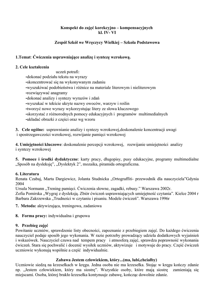 Konspekt do zajęć korekcyjno – kompensacyjnych kl. IV- VI Zespół Szkół we Wręczycy Wielkiej – Szkoła Podstawowa 1.Temat: Ćwiczenia usprawniające analizę i syntezę wzrokową. 2. Cele kształcenia uczeń potrafi: -dokonać podziału tekstu na wyrazy -skoncentrować się na wykonywanym zadaniu -wyszukiwać podobieństwa i różnice na materiale literowym i nieliterowym -rozwiązywać anagramy -dokonać analizy i syntezy wyrazów i zdań -wyszukać w tekście ukryte nazwy owoców, warzyw i roślin -tworzyć nowe wyrazy wykorzystując litery ze słowa kluczowego -skorzystać z różnorodnych pomocy edukacyjnych i programów multimedialnych -układać obrazki z części oraz wg wzoru 3. Cele ogólne: usprawnianie analizy i syntezy wzrokowej,doskonalenie koncentracji uwagi i spostrzegawczości wzrokowej, rozwijanie pamięci wzrokowej 4. Umiejętności kluczowe: doskonalenie percepcji wzrokowej, rozwijanie umiejętności analizy i syntezy wzrokowej 5. Pomoce i środki dydaktyczne: karty pracy, długopisy, pusy edukacyjne, programy multimedialne „Sposób na dysleksję”, „Dyslektyk 2”, mozaika, piramida ortograficzna. 6. Literatura Renata Czabaj, Marta Dargiewicz, Jolanta Studnicka „Ortograffiti- przewodnik dla nauczyciela”Gdynia 2004 Ursula Normann „Trening pamięci. Ćwiczenia słowne, zagadki, rebusy.” Warszawa 2002r. Zofia Pomirska „Wygraj z dysleksją. Zbiór ćwiczeń usprawniających umiejętność czytania”. Kielce 2004 r Barbara Zakrzewska „Trudności w czytaniu i pisaniu. Modele ćwiczeń”. Warszawa 1996r 7. Metoda: aktywizująca, treningowa, zadaniowa 8. Forma pracy: indywidualna i grupowa 9. Przebieg zajęć Powitanie uczniów, sprawdzenie listy obecności, zapoznanie z przebiegiem zajęć. Do każdego ćwiczenia nauczyciel podaje sposób jego wykonania. W razie potrzeby prowadzący udziela dodatkowych wyjaśnień i wskazówek. Nauczyciel czuwa nad tempem pracy i atmosferą zajęć, sprawdza poprawność wykonania ćwiczeń. Stara się pochwalić i docenić wysiłek uczniów, aktywizuje i motywuje do pracy. Część ćwiczeń uczniowie wykonują wspólnie a część indywidualnie. Zabawa Jestem człowiekiem, który...(ma, lubi,chciałby) Uczniowie siedzą na krzesełkach w kręgu. Jedna osoba nie ma krzesełka. Stojąc w kręgu kończy zdanie np. „Jestem człowiekiem, który ma siostrę”. Wszystkie osoby, które mają siostrę zamieniają się miejscami. Osoba, której brakło krzesełka kontynuuje zabawę, kończąc dowolnie zdanie. I część zajęć (zadania wykonywane zgodnie z kartą pracy) Ćwiczenie 1 „Ukryte słowa” Prowadzący rozdaje karty pracy .Uczniowie otrzymują kartki ze zdaniami, w których trzeba odnaleźć i podkreślić ukryte nazwy owoców, warzyw i roślin. 1.Złamali nawet scyzoryk, ale puszki nie otworzyli. 2.Przemek cofnął się o krok, ustępując miejsca koleżance. 3.Napisała taki smutny list, że gdy go czytał, to płakał. 4.Twierdzi, że zabija go dym z papierosów. 5.Zamyślony Jaś minął obojętnie cukiernię. 6.Przypadkowo podróż Adama zakończyła się w polu. 7.Dzieci lubią malować i rysować. 8.Nieznani sprawcy spalili akta. 9.Pomięta koperta leżała jeszcze na stole. 10.Jego brat kiwał potakująco głową. 11.Na boisku rozciągnięta była cienka lina. 12.Bez pracy nie ma kołaczy. 13.Opady nie były tak duże, jak prognozowano. 14.Byli ciekawi, kiedy nowy szyld zawiśnie nad sklepem. 15.Była to niewielka, pusta szkatułka. 16.Pozostał tylko sos na talerzu, kotlet zjadł kot. 17.Dzban Antek zbił, gdy sięgał po zeszyt. 18.Rosła tu lipa, niestety spłonęła wraz z dworem. 19.Podniósł słuchawkę, gdy zabrzmiał trzeci dzwonek. 20.Na poligonie żołnierze szli parami. Ćwiczenie 2 „Sałatka literowa” Zadaniem uczniów jest tak przestawić podane litery, by powstała z nich nazwa zwierzęcia. Ils seip jaczą lórikk amotihpop rugank kasjzzucar opeintezr yrsgyt dajówmrok rozwiązanie: lis, pies, zając, królik, hipopotam, kangur, jaszczurka, nietoperz, tygrys, mrówkojad. Ćwiczenie 3 „Krasnoludek” Uczniowie tworzą jak najwięcej nowych wyrazów wykorzystując litery ze słowa 'krasnoludek”. Odczytują wyrazy. Ćwiczenie 4 „Wyprawa na ryby” Zadaniem uczniów jest przeczytać poniższy tekst i pionową kreską prawidłowo podzielić go na wyrazy. Wyprawanaryby. Naskarpierosłydzikiemalinyzagradzającedrogędobrzegujeziora.Przedzierającsięprzeznie,zgubiłzegarekina dodatekpodarłskarpetki.Przezdrobnelistkidostrzegłgąsienicę,którapełzłapokońskiejpodkowiebłyszczacejw słońcu.Wyciągnąłwędkę,nahaczykunadaltkwiłoświeżeziarnokukurydzy.Poczuł,jakoblewagozimnypot,bo akuratwtejchwilisobieuświadomił,żezapomniałprzynęty.Wędkowanieszybkosięskończyło,śmiałsięsam zsiebie. II część zajęć - zadania wykonywane indywidualnie, losowo, z wykorzystaniem różnorodnych pomocy edukacyjnych tj: 1)programy multimedialne „Sposób na dysleksję” (analiza i synteza liter, sylab, wyrazów powstałych z kropek) „Dyslektyk 2” (składanie obrazka z części, gra typu memory) 2)pusy edukacyjne(dostrzeganie różnic i podobieństw) 3)mozaika (układanie obrazka wg wzoru) 4)piramida ortograficzna – gra parami (utrwalanie poprawnej pisowni wyrazów- układanie piramidy wg określonych zasad) 11. Podsumowanie zajęć i uporządkowanie sali. Imię i nazwisko: Karta pracy Ćw. 1 „Ukryte słowa” Znajdź i podkreśl w poniższych zdaniach ukryte nazwy owoców, warzyw i roślin. np. Były to pola minowe. 1. Złamali nawet scyzoryk, ale puszki nie otworzyli. 2. Przemek cofnął się o krok, ustępując miejsca koleżance. 3. Napisała taki smutny list, że gdy go czytał, to płakał. 4. Twierdzi, że zabija go dym z papierosów. 5.Zamyślony Jaś minął obojętnie cukiernię. 6.Przypadkowo podróż Adama zakończyła się w polu. 7.Dzieci lubią malować i rysować. 8. Nieznani sprawcy spalili akta. 9.Pomięta koperta leżała jeszcze na stole. 10.Jego brat kiw