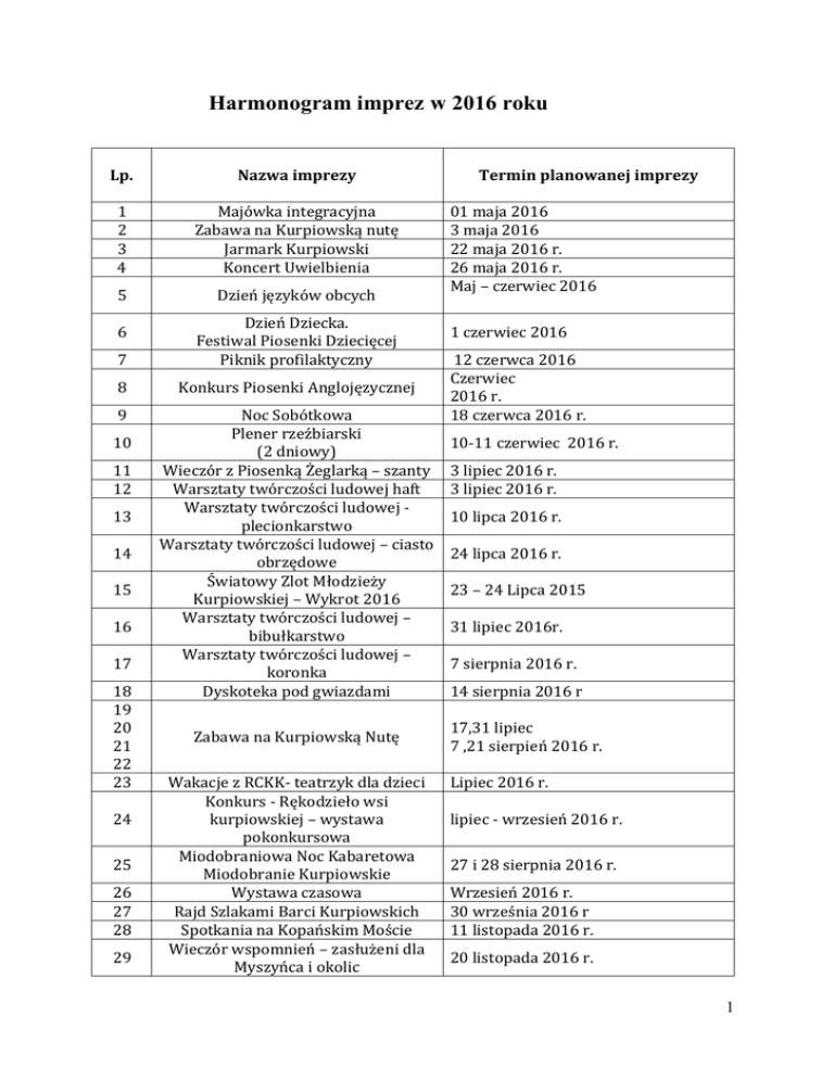 Harmonogram imprez w 2016 roku Lp. Nazwa imprezy 1 2 3 4 Majówka integracyjna Zabawa na Kurpiowską nutę Jarmark Kurpiowski Koncert Uwielbienia 5 Dzień języków obcych 7 Dzień Dziecka. Festiwal Piosenki Dziecięcej Piknik profilaktyczny 8 Konkurs Piosenki Anglojęzycznej 9 Noc Sobótkowa Plener rzeźbiarski (2 dniowy) Wieczór z Piosenką Żeglarką – szanty Warsztaty twórczości ludowej haft Warsztaty twórczości ludowej plecionkarstwo Warsztaty twórczości ludowej – ciasto obrzędowe Światowy Zlot Młodzieży Kurpiowskiej – Wykrot 2016 Warsztaty twórczości ludowej – bibułkarstwo Warsztaty twórczości ludowej – koronka Dyskoteka pod gwiazdami 6 10 11 12 13 14 15 16 17 18 19 20 21 22 23 24 25 26 27 28 29 Zabawa na Kurpiowską Nutę Wakacje z RCKK- teatrzyk dla dzieci Konkurs - Rękodzieło wsi kurpiowskiej – wystawa pokonkursowa Miodobraniowa Noc Kabaretowa Miodobranie Kurpiowskie Wystawa czasowa Rajd Szlakami Barci Kurpiowskich Spotkania na Kopańskim Moście Wieczór wspomnień – zasłużeni dla Myszyńca i okolic Termin planowanej imprezy 01 maja 2016 3 maja 2016 22 maja 2016 r. 26 maja 2016 r. Maj – czerwiec 2016 1 czerwiec 2016 12 czerwca 2016 Czerwiec 2016 r. 18 czerwca 2016 r. 10-11 czerwiec 2016 r. 3 lipiec 2016 r. 3 lipiec 2016 r. 10 lipca 2016 r. 24 lipca 2016 r. 23 – 24 Lipca 2015 31 lipiec 2016r. 7 sierpnia 2016 r. 14 sierpnia 2016 r 17,31 lipiec 7 ,21 sierpień 2016 r. Lipiec 2016 r. lipiec - wrzesień 2016 r. 27 i 28 sierpnia 2016 r. Wrzesień 2016 r. 30 września 2016 r 11 listopada 2016 r. 20 listopada 2016 r. 1 30 31 32 33 34 35 Spotkania z ciekawymi twórcami i artystami Kiermasz Bożonarodzeniowy 7 i 21 październik 18 i 25 listopada 9 grudnia 2016 r. Grudzień 2016 r 2