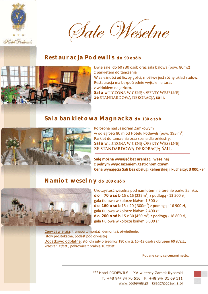 Sale Weselne Restauracja Podewils do 90 osób Dwie sale: do 60 i 30 osób oraz sala balowa (pow. 80m2) z parkietem do taoczenia W zależności od liczby gości, możliwy jest różny układ stołów. Restauracja ma bezpośrednie wyjście na taras z widokiem na jezioro. Sala w ze Sala bankietowa Magnacka sali. do 130 osób Położona nad Jeziorem Zamkowym w odległości 80 m od Hotelu Podewils (pow. 195 m²) Parkiet do taoczenia oraz scena dla orkiestry. Sala w Salę można wynająd bez aranżacji weselnej z pełnym wyposażeniem gastronomicznym. Cena wynajęcia Sali bez obsługi kelnerskiej i kucharzy: 3 000,- zł Namiot weselny do 200 osób Uroczystośd weselna pod namiotem na terenie parku Zamku. do 70 osób 15 x 15 (225m2) z podłogą - 13 500 zł, gala tiulowa w kolorze białym 1 300 zł 2 do 160 osób 15 x 20 ( 300m ) z podłogą - 16 900 zł, gala tiulowa w kolorze białym 2 400 zł do 200 osób 15 x 30 (450 m2) z podłogą - 18 800 zł, gala tiulowa w kolorze białym 3 800 zł Ceny zawierają: transport, montaż, demontaż, oświetlenie, stoły prostokątne, podest pod orkiestrę Dodatkowo odpłatne: stół okrągły o średnicy 180 cm tj. 10 -12 osób z obrusem 60 zł/szt., krzesła 5 zł/szt., pokrowiec z pralnią 10 zł/szt. Podane ceny są cenami netto. *** Hotel PODEWILS XV-wieczny Zamek Rycerski T: +48 94/ 34 70 516 F: +48 94/ 31 69 111 www.podewils.pl [email protected]