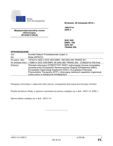 Rada Unii Europejskiej Bruksela, 28 listopada 2014 r. 16031/14 ADD 2 Międzyinstytucjonalny numer referencyjny: 2014/0212 (NLE) SOC 829 EMPL 180 SAN 451 TRANS 559 SPRAWOZDANIE Od: Komitet Stałych Przedstawicieli (część I) Do: Rada (EPSCO) Nr poprz. dok.: 15753/14 ADD 2 SOC 802 EMPL 169 SAN 440 TRANS 541 Nr wniosku Kom.: 11688/14 SOC 558 EMPL 95 SAN 282 TRANS 355 - COM(2014) 452 final Dotyczy: Wniosek dotyczący DYREKTYWY RADY wykonującej Umowę europejską zawartą przez Europejskie Stowarzyszenie Żeglugi Śródlądowej (EBU), Europejską Organizację Kapitanów (ESO) i Europejską Federację Pracowników Transportu (ETF) i dotyczącą niektórych aspektów organizacji czasu pracy w transporcie śródlądowym Delegacje otrzymują w załączeniu tekst umowy europejskiej dotyczącej powyższego wniosku. Projekt dyrektywy Rady w sprawie wykonania tej umowy znajduje się w dok. 16031/14 ADD 1. Sprawozdanie znajduje się w dok. 16031/14. ____________________ 16031/14 ADD 2 DG B 4A lo/DJ/dk 1 PL ZAŁĄCZNIK Umowa europejska dotycząca niektórych aspektów organizacji czasu pracy w transporcie śródlądowym dotycząca wniosku dotyczącego dyrektywy Rady wykonującej Umowę europejską zawartą przez Europejskie Stowarzyszenie Żeglugi Śródlądowej (EBU), Europejską Organizację Kapitanów (ESO) i Europejską Federację Pracowników Transportu (ETF) i dotyczącą niektórych aspektów organizacji czasu pracy w transporcie śródlądowym 16031/14 ADD 2 Lo/DJ/dk DG B 4A 2 EN ZAŁĄCZNIK Mając na uwadze, co następuje: 1. Dyrektywa 2003/88/WE dotycząca niektórych aspektów organizacji czasu pracy ustanawia ogólne minimalne standardy, które z wyjątkiem obszarów, o których mowa w artykule 20 ust. 1 (odpoczynek dobowy, przerwy, odpoczynek tygodniowy, wymiar czasu pracy w porze nocnej) odnoszą się również do organizacji czasu pracy w wodnym transporcie śródlądowym. Z uwagi na fakt, że przepisy nie uwzględniają w wystarczającym stopniu sytuacji zawodowej i osobistej osób zatrudnionych w sektorze transportu śródlądowego, istnieje potrzeba ustanowienia bardziej szczegółowych przepisów zgodnie z art. 14 dyrektywy 2003/88/WE. 2. Tego rodzaju bardziej szczegółowe przepisy powinny zapewnić wysoki poziom ochrony zdrowia i bezpieczeństwa pracowników zatrudnionych w tym sektorze. 3. Wodny transport śródlądowy to forma transportu o wymiarze międzynarodowym, która charakteryzuje się przede wszystkim aktywnością transgraniczną w europejskiej sieci wodnego transportu śródlądowego. W związku z tym należy podjąć działania mające na celu stworzenie jednolitych warunków na rynku pracy w tym sektorze, a także zapobieganie nieuczciwej konkurencji, wynikającej z różnic w przepisach dotyczących organizacji czasu pracy. 4. Ze względu na duże znaczenie sektora transportu dla konkurencyjności gospodarczej UE postawiła sobie za cel zwrócenie większej uwagi na te mniej energochłonne, przyjaźniejsze dla środowiska oraz bezpieczniejsze formy transportu 1. Transport wodny śródlądowy, jako forma transportu przyjazna dla środowiska, charakteryzująca się niewykorzystanym potencjałem zdolności przewozowych, może w zrównoważony sposób przyczynić się do zmniejszenia natężenia transportu drogowego i kolejowego towarów w Europie. 1 Zob. komunikat Komisji w sprawie promocji żeglugi śródlądowej „NAIADES” COM(2006) 6 final z 17.1.2006. 16031/14 ADD 2 DG B 4A lo/DJ/dk 3 PL 5. Organizacja pracy w sektorze jest różna. Liczba pracowników oraz wymiar czasu pracy na pokładzie różnią się w zależności od organizacji pracy, przedsiębiorstwa, obszaru, na którym eksploatowany jest statek, długości trasy oraz wielkości statku. Z jednej strony statki są eksploatowane w ramach żeglugi ciągłej, czyli w 24-godzinnym systemie zmianowym. Z drugiej strony przede wszystkim średnie przedsiębiorstwa eksploatują swoje statki zwykle przez okres 14 godzin przez pięć lub sześć dni w tygodniu. W transporcie śródlądowym czas pracy danego pracownika na pokładzie nie jest równoznaczny z okresem eksploatacji statku. 6. Specyfika tego transportu polega na tym, że pokład może być dla pracowników nie tylko miejscem pracy, ale również miejscem zakwaterowania lub zamieszkania. W związku z tym powszechnie przyjęte jest spędzanie okresów odpoczynku na pokładzie. Wielu pracowników zatrudnionych w transporcie śródlądowym, w szczególności wykonujących pracę w większej odległości od miejsca zamieszkania, pracuje przez szereg kolejnych dni na pokładzie, co ma na celu zaoszczędzenie czasu podróży. Pracownicy ci mogą następnie spędzić szereg dni w domu lub też w innym dowolnie wybranym miejscu. Na przykład pracownik wykonujący pracę zgodnie z harmonogramem 1:1 ma jednakową liczbę dni pracy i odpoczynku. W związku z tym liczba kolejnych dni pracy na pokładzie, a także liczba dni odpoczynku, może być odpowiednio wyższa niż w przypadku pracy na lądzie. 7. Na przeciętny czas pracy w transporcie śródlądowym składa się zasadniczo znaczny okres gotowości (na przykład w związku z nieplanowanymi pracami konserwacyjnymi przy śluzach, bądź też załadunkiem lub rozładunkiem jednostki), który może również przypadać w porze nocnej. W związku z powyższym istnieje możliwość określenia większego maksymalnego dobowego i tygodniowego wymiaru czasu pracy, niż przewiduje to dyrektywa 2003/88/WE. 16031/14 ADD 2 DG B 4A lo/DJ/dk 4 PL 8. Jednocześnie należy wziąć pod uwagę fakt, że na obciążenie pracą w transporcie śródlądowym wpływa szereg czynników, takich jak np. hałas, drgania, czy też organizacja czasu pracy. Niezależnie od przepisów dyrektywy Rady 89/391/EWG z dnia 12 czerwca 1989 r. w sprawie wprowadzenia środków w celu poprawy bezpieczeństwa i zdrowia pracowników w miejscu pracy 2 dla ochrony pracowników przeprowadza się coroczne kontrole zdrowia, uwzględniające szczególne war