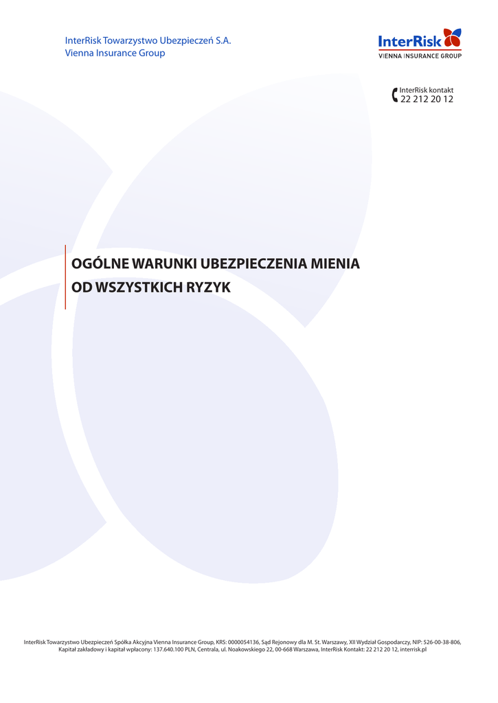 InterRisk Towarzystwo Ubezpieczeń S.A. Vienna Insurance Group InterRisk kontakt 22 212 20 12 OGÓLNE WARUNKI UBEZPIECZENIA MIENIA OD WSZYSTKICH RYZYK InterRisk Towarzystwo Ubezpieczeń Spółka Akcyjna Vienna Insurance Group, KRS: 0000054136, Sąd Rejonowy dla M. St. Warszawy, XII Wydział Gospodarczy, NIP: 526-00-38-806, Kapitał zakładowy i kapitał wpłacony: 137.640.100 PLN, Centrala, ul. Noakowskiego 22, 00-668 Warszawa, InterRisk Kontakt: 22 212 20 12, interrisk.pl Informacje, o których mowa w art. 17 ust. 1 ustawy o działalności ubezpieczeniowej i reasekuracyjnej RODZAJ INFORMACJI 2 NUMER ZAPISU Z WZORCA UMOWNEGO 1. Przesłanki wypłaty odszkodowania i innych świadczeń lub wartości wykupu ubezpieczenia §2 - §6, §8, §12, §15 - §18, §21 2. Ograniczenia oraz wyłączenia odpowiedzialności zakładu ubezpieczeń uprawniające do odmowy wypłaty odszkodowania i innych świadczeń lub ich obniżenia §7, §9, §14 ust. 3, §15 ust. 1 pkt 1 i 3, ust. 6-8, §6 ust. 1 pkt 2 i 3, ust. 2, §18 ust. 4 3. Koszty oraz inne obciążenia potrącane ze składek ubezpieczeniowych, z aktywów ubezpieczeniowych funduszy kapitałowych lub poprzez umorzenie jednostek uczestnictwa ubezpieczeniowych funduszy kapitałowych Nie dotyczy 4. Wartość wykupu ubezpieczenia w poszczególnych okresach trwania ochrony ubezpieczeniowej oraz okres, w którym roszczenie o wypłatę wartości wykupu nie przysługuje Nie dotyczy OGÓLNE WARUNKI UBEZPIECZENIA MIENIA OD WSZYSTKICH RYZYK SPIS TREŚCI POSTANOWIENIA OGÓLNE ....................................................................................................................... 3 DEFINICJE ............................................................................................................................................................... 3 PRZEDMIOT UBEZPIECZENIA .................................................................................................................... 4 MIEJSCE UBEZPIECZENIA ........................................................................................................................... 5 ZAKRES UBEZPIECZENIA ........................................................................................................................... 5 UBEZPIECZONE KOSZTY DODATKOWE ............................................................................................ 5 OGRANICZENIA I WYŁĄCZENIA ODPOWIEDZIALNOŚCI ....................................................... 5 SUMA UBEZPIECZENIA ............................................................................................................................. 7 NIEDOUBEZPIECZENIE .............................................................................................................................. 8 SYSTEM UBEZPIECZENIA ........................................................................................................................ 8 ZAWARCIE UMOWY UBEZPIECZENIA ............................................................................................. 8 OKRES UBEZPIECZENIA POCZĄTEK I KONIEC ODPOWIEDZIALNOŚCI ........................ 8 SKŁADKA UBEZPIECZENIOWA .............................................................................................................. 9 PRAWA I OBOWIĄZKI STRON UMOWY ............................................................................................. 9 ZGŁOSZENIE SZKODY I USTALENIE WYSOKOŚCI SZKODY .................................................... 10 USTALENIE WYSOKOŚCI ODSZKODOWANIA ........................................................................... 12 POWOŁANIE RZECZOZNAWCY ....................................................................................................... 12 WYPŁATA ODSZKODOWANIA ........................................................................................................... 12 PODWÓJNE UBEZPIECZENIE ............................................................................................................. 12 ROSZCZENIA REGRESOWE .................................................................................................................. 12 POSTANOWIENIA KOŃCOWE ............................................................................................................ 13 ZAŁĄCZNIK NR 1 DO OWU MIENIA OD WSZYSTKICH RYZYK ............................................ 13 MINIMALNE WYMOGI ZABEZPIECZENIA MIENIA I WARTOŚCI PIENIĘŻNYCH PRZED KRADZIEŻĄ Z WŁAMANIEM LUB RABUNKIEM ................... 13 KONSTRUKCJA ŚCIAN, STROPÓW, SUFITÓW, PODŁÓG I DACHÓW .............................. 13 ZABEZPIECZENIE OKIEN I ZEWNĘTRZNYCH OTWORÓW ............................................... 13 KONSTRUKCJA I ZABEZPIECZENIE DRZWI ZEWNĘTRZNYCH ........................................... 14 ZABEZPIECZENIE KLUCZY .................................................................................................................... 14 ZABEZPIECZENIE POJAZDÓW MECHANICZNYCH STANOWIĄCYCH ŚRODKI OBROTOWE ................................................................................................................................... 14 KONSTRUKCJA ZAMKÓW, KŁÓDEK I UCHWYTÓW ............................................................. 14 PRZECHOWYWANIE WARTOŚCI PIENIĘŻNYCH ....................................................................... 14 TRANSPORT WARTOŚCI PIENIĘŻNYCH ........................................................................................ 15 POSTANOWIENIA OGÓLNE §1 1. Niniejsze ogólne warunki ubezpieczenia mienia od wszystkich ryzyk, zwane dalej owu, mają zastosowanie do umów ubezpieczenia zawieranych pomiędzy osobami fizycznymi prowadzącymi działalność gospodarczą, osobami prawnymi lub jednostkami organizacyjnymi nie posiadającymi osobowości prawnej, zwanymi dalej Ubezpieczającym a InterRisk Towarzystwem Ubezpieczeń S.A. Vienna Insurance Group, zwanym dalej InterRisk TU S.A. 2. Do umowy ubezpieczenia mog