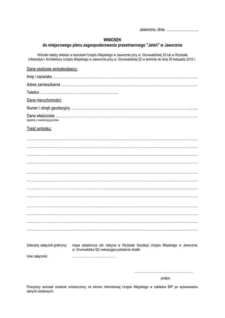 Jaworzno, dnia …............................ WNIOSEK do miejscowego planu zagospodarowania przestrzennego "Jeleń" w Jaworznie Wnioski należy składać w kancelarii Urzędu Miejskiego w Jaworznie przy ul. Grunwaldzkiej 33 lub w Wydziale Urbanistyki i Architektury Urzędu Miejskiego w Jaworznie przy ul. Grunwaldzkiej 52 w terminie do dnia 30 listopada 2015 r. Dane osobowe wnioskodawcy: Imię i nazwisko ……………………………………………………………………………………………………... Adres zamieszkania ……………………………………………………………………………………………...... Telefon ……………………………………………………… Dane nieruchomości: Numer i obręb geodezyjny ……………………………………………………………………………………....... Dane właściciela ……………………………………………………………………………………………………. zgodnie z ewidencją gruntów Treść wniosku: ………………………………………………………………………………………………………………………… ………………………………………………………………………………………………………………………… ………………………………………………………………………………………………………………………… ………………………………………………………………………………………………………………………… ………………………………………………………………………………………………………………………… ………………………………………………………………………………………………………………………… ………………………………………………………………………………………………………………………… ………………………………………………………………………………………………………………………… ………………………………………………………………………………………………………………………… ………………………………………………………………………………………………………………………… ………………………………………………………………………………………………………………………… ………………………………………………………………………………………………………………………… Zalecany załącznik graficzny: mapa zasadnicza (do nabycia w Wydziale Geodezji Urzędu Miejskiego w Jaworznie, ul. Grunwaldzka 52) wskazująca położenie działki Inne załączniki: …………………………………… ………………………………………………… podpis Powyższy wniosek zostanie umieszczony na stronie internetowej Urzędu Miejskiego w zakładce BIP po wykasowaniu danych osobowych.