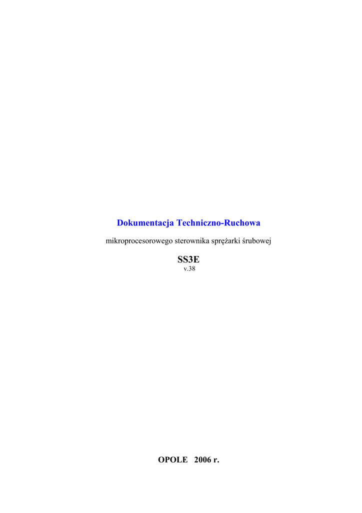 Dokumentacja Techniczno-Ruchowa mikroprocesorowego sterownika sprężarki śrubowej SS3E v.38 OPOLE 2006 r. d-ss3E38 AP Mikroster OPOLE -2- I. PODSTAWOWE WYMAGANIA I BEZPIECZEŃSTWO UŻYTKOWANIA Montaż i instalacja powinna być przeprowadzona przez wykwalifikowany personel. Podczas instalacji należy zastosować wszelkie wymogi ochrony. Na instalatorze spoczywa obowiązek instalacji zgodnie z przepisami dotyczącymi bezpieczeństwa i kompatybilności elektromagnetycznej. Montaż należy przeprowadzić zgodnie z dokumentacją techniczną urządzenia oraz należy przeprowadzić właściwą konfigurację. Niewłaściwa konfiguracja może spowodować błędne działanie, prowadzące do uszkodzenia lub wypadku. W urządzeniu występuje niebezpieczne napięcie, które może spowodować śmiertelne porażenie. Przed przystąpieniem do instalacji, konserwacji lub naprawy należy bezwzględnie odłączyć urządzenie od źródła zasilania. Urządzenie przeznaczone jest do pracy w środowisku przemysłowym, nie należy używać go w środowisku domowym lub podobnym. Nie używać urządzenia w strefie zagrożonej wybuchem. Zabezpieczyć urządzenie przed opadami atmosferycznymi, nadmierną wilgocią i temperaturą. Producent nie ponosi odpowiedzialności za szkody wynikłe z niewłaściwego zainstalowania oraz nieprawidłowego użytkowania urządzenia . II. ZASTOSOWANIE. OGÓLNA CHARAKTERYSTYKA. Sterowniki typu SS3 są nowoczesnymi specjalizowanymi układami przeznaczonymi do sterowania osprzętem elektrycznym sprężarek śrubowych. Przeznaczony jest on do kompresorów wyposażonych w analogowy przetwornik ciśnienia, oraz dwa rezystancyjne czujniki temperatury (Pt1000, lub wersja z Pt100). Ponadto można podłączyć cały szereg czujników i przetworników związanych z zabezpieczeniem i eksploatacją, silnika, modułu śrubowego itp. Sterownik jest tak zaprojektowany, aby mógł pracować całkowicie autonomicznie bez nadzoru, nie wymaga również okresowej regulacji i konserwacji. Poprzez zastosowanie indywidualnie zaprojektowanej klawiatury oraz wyświetlacza alfanumerycznego obsługa sterownika jest prosta, a ustawianie parametrów jego pracy łatwe i jednoznaczne. Podstawowe parametry sterownika SS3 1. Zasilanie 2x20VAC /10VA, ± 10% - poprzez transformator 230VAC/2x20VAC - 20VA 2. Wyjścia : - 230VAC, 3A 3 szt. styczniki silnika głównego sprężarki -gwiazda/trójkąt, - 230VAC, 0,5A 2 szt. styczniki wentylatora chłodnicy i podgrzewacza oleju, - 230VAC, 0.1A 2 szt. elektrozawory pracy jałowej (odciążenia) i spustu kondensatu z kontrolą prądu obciążenia, - 230 VAC/0,5A 1 szt. styk przekaźnika, sygnalizacja alarmu maszyny. 3. Wejścia dwustanowe: - 230VAC, 3 mA 3 szt. kontrola obecności i kolejności faz - poziom kontroli napięciafazowego U > 180 VAC, opóźnienie 0,7 s. - 24VDC, 10 mA 6 szt. kontrola: czujników zużycia separatora, filtrów oleju i powietrza, styku termostatu, stanu przekaźnika termicznego, wyłącznika awaryjnego. 4. Wejścia analogowe: - 420 mA / 20VDC 1 szt. pomiar ciśnienia, dwuprzewodowy, zakres 01,6 MPa, dokładność 0,5%, rezystancja wejścia 250 Ω - Pt1000 2 szt. pomiar temperatury oleju i temperatury powietrza, zakres 0-160 C, dokładność 0,5%, (opcja PT100) - PTC 1 szt. pomiar temperatury uzwojeń (i łożysk) silnika termistorami PTC wg DIN 44081. 5. Łącze transmisyjne dwuprzewodowe, wykorzystane do komunikacji sterowników przy pracy w połączeniu kaskadowym lub sekwencyjnym. 6. Pulpit sterujący: 10 przycisków, 12 diod informacyjnych, podświetlany wyświetlacz LCD 2x16 znaków oraz dwa wyświetlacze LED po 3 znaki, wysokość 7mm. d-ss3E38 AP Mikroster OPOLE -3- 7. Warunki klimatyczne: - temperatura pracy - 20 °C do 55 °C, - wilgotność do 90% bez kondensacji, - wysokość do 2000 m n.p.m. 8. Obudowa sterownika: - materiał NORYL GFN, typ obudowy – panelowa (tablicowa) , - wymiar 144x144x85 mm , - stopień ochrony IP54 (z uszczelką). 9. Ciężar sterownika 0,70 kg . 10. Kompatybilność elektromagnetyczna: - odporność na zakłócenia elektromagnetyczne wg EN-61000-6-4:2001 - emisja zakłóceń elektromagnetycznych wg EN 61000-6-4:2001 11. Wymagania bezpieczeństwa: według normy PN-IEC 61010-1+A1: III. BUDOWA STEROWNIKA Podstawowym elementem sterownika jest procesor jednoukładowy Siemens`a, który w połączeniu z pamięciami typu EPROM, EEPROM i RAM oraz zegarem czasu rzeczywistego umożliwia zaprogramowanie dowolnego algorytmu sterowania sprężarką. Sterownik składa się z modułu procesora i modułu wejść-wyjść oraz pulpitu, umieszczonych w obudowie natablicowej. Na pulpicie umieszczone są przyciski służące do ustawiania parametrów sterowania, oraz wyświetlacz LCD 2x16 znaków i dwa trzycyfrowe wyświetlacze LED. Alarmy i informacje o stanie sprężarki są wyświetlane na kolorowych diodach LED, umieszczonych z boku pulpitu. Przewody sygnałowe doprowadzane są z tyłu obudowy poprzez dwa złączą 16-to i 20-to zaciskowe. Na wyjściach sterujących zastosowano przekaźniki półprzewodnikowe SSR (triaki). W porównaniu z układami stykowymi mają one znacznie dłuższy czas życia oraz nie generują zakłóceń - ponieważ zawsze załączane są w „zerze” (=0V). Wyjście sygnalizacji alarmu, to miniaturowy przekaźnik ze stykiem zwiernym. Układy wyjściowe oraz wejściowe posiadają optoizolację. IV. STEROWANIE PRACĄ SPRĘŻARKI Po każdym załączeniu sterownika (podaniu napięcia zasilania) następuje testowanie jego wewnętrznych układów: mikrokontrolera, pamięci RAM, EPROM, EEPROM oraz stanu miniaturowego akumulatora. W przypadku wykrycia błędów w pracy tych układów są wyświetlane odpowiednie komunikaty. 1. Uruchomienie sprężarki. Po załączeniu sprężarki przyciskiem START, następuje rozruch silnika głównego zawsze z uwzględnieniem przełączania gwiazda/trójkąt. Czas przełączenia w „trójkąt” - wynosi zwykle kilka sekund (ustawiany jest przez producenta). Po rozruchu, 