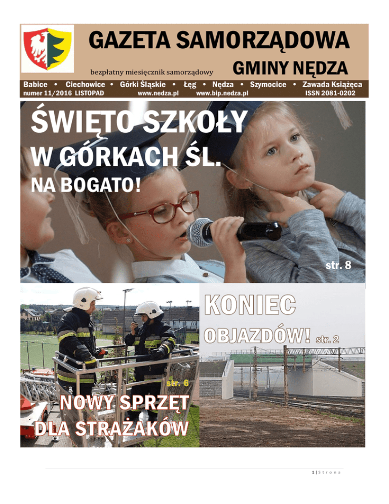 GAZETA SAMORZĄDOWA bezpłatny miesięcznik samorządowy GMINY NĘDZA Babice • Ciechowice • Górki Śląskie • Łęg • Nędza • Szymocice • Zawada Książęca numer 11/2016 LISTOPAD www.nedza.pl www.bip.nedza.pl ISSN 2081-0202 ŚWIĘTO SZKOŁY W GÓRKACH ŚL. NA BOGATO! str. 8 str. 6 1|S t r o n a Z URZĘDU Gazeta Samorządowa Gminy Nędza nr 11/2016 Utrudnienia trwały ponad rok. Zarząd Dróg Wojewódzkich wielokilometrowymi objazdami. wyremontował w tym czasie oba wiadukty na drodze nr 421 Na początku października tego łączącej centrum Nędzy z Ciechowicami i dalej położonymi miejscowościami. Od 9 roku ruszyły roboty na drugim listopada droga znów jest przejezdna. obiekcie w ciągu ul. Jana III Sobieskiego czyli na DW 421. siatkowo kamiennych i przebudowa rzypomnijmy, że remont W tym przypadku roboty pierwszego z wiaduktów rozpoczął się dojazdów do wiaduktu. polegały jedynie na wymianie Inwestycję za ponad 4,7 mln zł we wrześniu 2015 roku. przęsła. firma TRAKCJA Przedmiotem zamówienia było zrealizowała Zgodnie z umową remont miał się PRKiI S.A. Zakład Robót wykonanie, m.in. rozbiórki zakończyć do 9 listopada. Udało się Mostowych. Wyłączenie drogi z istniejącego obiektu, budowa dotrzymać terminu i droga znów jest wiaduktu wraz z obustronnymi ruchu wiązało się dla mieszkańców i przejezdna. ● innych użytkowników z konstrukcjami oporowymi z koszy P 2|S t r o n a Z URZĘDU Gazeta Samorządowa Gminy Nędza nr 11/2016 BUDUJĄ CHODNIK PRZY UL. GLIWICKIEJ W rejonie ośrodka Aquabrax ruch na drodze jest bardzo duży, a brak chodnika mocno zagrażał bezpieczeństwu mieszkańców. W końcu mogą odetchnąć. Ruszyła jego budowa. Ul. Gliwicka w Nędzy jest drogą wojewódzką, ale Rada Gminy Nędza podjęła jakiś czas temu uchwałę w sprawie przejęcia zadania od województwa. Nastąpiło to na mocy porozumienia zawartego między Gminą Nędza a Województwem Śląskim, regulującego przede wszystkim wzajemne rozliczenia finansowe: 90 proc. kosztów pokrywa województwo, 10 proc gmina. Przetarg wygrało konsorcjum firm: Firma Budowlana "D-ART" Damian Ogrodowski z Jankowic i Przedsiębiorstwo Usług Technicznych "INFRAGO" Dominika Ogrodowska z Jankowic. Wartość oferty to 1.234 728,70 zł brutto. Termin wykonania ustalono na 30 listopada. Inwestycja obejmuje budowę chodnika wraz z odwodnieniem w ciągu drogi wojewódzkiej DW 919 ul. Gliwicka w Nędzy na odcinku od km 12+540,50 do km 13+056,50 po stronie lewej (stronie istniejącej zabudowy mieszkaniowej jednorodzinnej) a także po prawej od km 12+978,70 do km 12+986,30 (w rejonie istniejącego przejścia dla pieszych umożliwiającego bezpieczne dojście do istniejącego przystanku autobusowego z zatoką). To bardzo ważne zadanie, bo bezpośrednio przekłada się na bezpieczeństwo mieszkańców. Obecnie chodnika w tym miejscu nie ma, a ruch, w tym tranzytowy, jest duży. Piesi mają do dyspozycji tylko pobocze. DW 919 przenosi ruch pomiędzy Raciborzem a Gliwicami oraz innymi miejscowościami na tej trasie. Stanowi dogodne połączenie z autostradą A4 i A1. Droga obsługuje również między innymi dojazd do chętnie odwiedzanego ośrodka rekreacyjnego. Na czas robót wprowadzono ruch wahadłowy. ● SPRAWDŹ CZY PROM KURSUJE DZWOŃ 792 330 563 DZWONIĆ MOŻNA W DNI, KIEDY PROM POWINIEN KURSOWAĆ: ● 1 października - 31 maja: godz. 6:00 – 17:30 dni powszednie 9:30 – 17:00 niedziele i święta ● 1 czerwca - 15 sierpnia: godz. 6:00 – 20:00 dni powszednie 9:30 – 17:00 niedziele i święta ● 16 sierpnia - 30 września: godz. 6:00 – 19:30 dni powszednie 9.30 – 17.00 niedziele i święta PROM NIE KURSUJE W ŚWIĘTA USTAWOWO WOLNE 3|S t r o n a OGŁOSZENIE INFORMUJE SIĘ WŁAŚCICIELI NIERUCHOMOŚCI NIEZAMIESZKAŁYCH, NA KTÓRYCH POWSTAJĄ ODPADY KOMUNALNE (w rozumieniu art. 6c ust.2 ustawy o utrzymaniu czystości i porządku w gminach), ŻE RADA GMINY NĘDZA PODJĘŁA UCHWAŁĘ W SPRAWIE ODBIERANIA Z DNIEM ODPADÓW KOMUNALNYCH OD WŁAŚCICIELI NIERUCHOMOŚCI, NA KTÓRYCH NIE ZAMIESZKUJĄ MIESZKAŃCY, A POWSTAJĄ ODPADY KOMUNALNE. Wójt Gminy Nędza Anna Iskała 4|S t r o n a Z URZĘDU Ustawa z dnia 13 września 1996 roku o utrzymaniu czystości i porządku w gminach ( t.j. Dz. U. z 2016r, poz. 250) daje radzie gminy możliwość postanowienia o odbieraniu odpadów komunalnych od właścicieli nieruchomości, na których nie zamieszkują mieszkańcy, a powstają odpady komunalne. Wiele rad gmin skorzystało z tego uprawnienia i podjęło takie uchwały już wcześniej. Pozwoliło to na kompleksowe rozwiązanie problemu odbioru odpadów komunalnych i tak zwane „uszczelnienie systemu”. Rada Gminy Nędza 13 października 2016 roku, po konsultacjach projektu uchwały również postanowiła o odbieraniu odpadów komunalnych z terenu nieruchomości, na których nie Gazeta Samorządowa Gminy Nędza nr 11/2016 zamieszkują mieszkańcy, a powstają odpady komunalne od stycznia 2017r. Uchwała wchodzi w życie po 14 dniach od ogłoszenia w Dzienniku Urzędowym Województwa Śląskiego. Oznacza to, że od stycznia 2017 roku właściciele nieruchomości niezamieszkałych, na których powstają odpady komunalne (np. szkoły, parafie, sklepy, zakłady produkcyjne, usługowe itp.) będą zobowiązani do złożenia stosownej deklaracji o wysokości opłaty za gospodarowanie odpadami komunalnymi (tak jak do tej pory robili to właściciele nieruchomości zamieszkałych, a Gmina będzie zobowiązana zorganizować odbiór odpadów komunalnych z terenu tych nieruchomości. Odbiór odpadów nie będzie już odbywał się na podstawie podpisanej umowy bezpośrednio z przedsiębiorcą świadczącym usługi odbioru odpadów – to Gmina wyłoni takiego przedsiębiorcę w drodze przetargu. Dlatego też właściciele tych niezamieszkałych nieruchomości powinni dążyć do wygaśnięcia lub rozwiązania indywidualnych umów w części, w której dotyczą odpadów komunalnych. Należy jed
