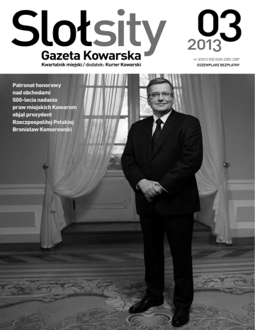 03 Slołsity Gazeta Kowarska Kwartalnik miejski / dodatek: Kurier Kowarski Patronat honorowy nad obchodami 500-lecia nadania praw miejskich Kowarom objął prezydent Rzeczpospolitej Polskiej Bronisław Komorowski 2013 nr 3/2013 (50) ISSN 2300-2387 EGZEMPLARZ BEZPŁATNY S l o łs i ty / R ocznicowe obchody Wstępniak Kowary obchodzą dostojne urodziny, dlatego ten numer naszego pisma znacznie różni się od poprzednich, nazwijmy nieświątecznych. Więcej miejsca poświęcamy na przybliżenie historii, na wspomnienia, bo okazja do tego niepowtarzalna. Chcemy naszą lokalną przeszłość przybliżyć nie tylko mieszkańcom, ale i szacownym gościom, którzy zdecydowali się nad Jedlicą świętować rocznicę nadania praw miejskich. Przeszłość miasta do łatwych nie należała. Lata świetności przeplatały się z kryzysami, wojnami, kataklizmami natu- Fot. Adam Peczeniuk ry. Nie będzie przesady, gdy dodam, że tak jest do dziś. Mieszkańcy jednak swoją codzienną pracą, najczęściej ciężką, bo pod ziemią, starali zapewnić byt sobie i najbliższym. Drukujemy też przewodnik po jubileuszowych imprezach. Pół tysiąca lat zobowiązuje do godnych uroczystości. I znów wrócę do historii, nad Jedlicą przewinął się kulturowy tygiel. Mówiono tu różnymi językami, granice zmieniały się, ale tworzona była tożsamość miejsca. Dziś jesteśmy za nie odpowiedzialni i my tworzymy wizerunek tego miasta. Jacek Kunikowski SLOŁSITY GAZETA KOWARSKA kwartalnik miejski Slołsity Gazeta Kowarska Redakcja: Jacek Kunikowski (red. nacz.), Agnieszka Jakubik, Dariusz Kaliński, Zbigniew Piepiora, Andrzej Weinke, Mirosłw Górecki, Ewa Kubarko-Lewandowska (dział reklam) Wydawca: Miejski Ośrodek Kultury, ul. Szkolna 2, 58-530 Kowary tel./fax: 75 718 25 77; e-mail: [email protected]; www.gazeta.kowary.pl Layout, skład komputerowy: Wojciech Miatkowski Na okładce: prezydent RP, Bronisław Komorowski Druk: APLA Łomnica REKLAMA OKRĘGOWA STACJA KONTROLI POJAZDÓW tel. 75 643 92 33; www.juro-trans.com.pl czynne pon.– pt., 7:00–19:00, w soboty 8:00–14.00 Świadczymy usługi: • Przeglądów rejestracyjnych wszystkich rodzajów pojazdów • Pierwszych przeglądów rejestracyjnych pojazdów sprowadzonych do kraju • Badań powypadkowych • Zmian rodzaju pojazdu • Obsługujemy pojazdy: osobowe, dostawcze, ciężarowe (specjalizacja RVI) oraz naczepy • Pracujemy na urządzeniach MAHA • Oferujemy fachowe doradztwo przy zakupie samochodów SERWIS SAMOCHODÓW OSOBOWYCH I CIĘŻAROWYCH czynne pon.– pt. 8:00–18:00, w soboty 8:00–14.00 Świadczymy usługi: • diagnostyka komputerowa (osobowe i ciężarowe) • ustawienie geometrii kół (osobowe i ciężarowe) • kompleksowy serwis klimatyzacji samochodowych • wymiana płynów eksploatacyjnych • naprawa zawieszenia • naprawa układu hamulcowego • naprawa układu kierowniczego • naprawy instalacji elektrycznych • układy wydechowe • NOWOŚĆ: instalacja LPG (auto-gaz) • NOWOŚĆ: usługi wulkanizacyjne. SPRZEDAŻ CZĘŚCI ZAMIENNYCH I AKCESORIÓW MYJNIA BEZDOTYKOWA – bezpieczne i skuteczne mycie samochodu. JURO-TRANS Kowary, ul. Zamkowa 9, tel. 75 643 96 55, 695 200 203 www.juro-trans.com.pl, [email protected] S l o łs i ty / R ocznicowe obchody Program „Dni Miasta Kowary” 12.09.2013 (czwartek) godz. 17.00 wernisaż wystawy fotograficznej pt. „Karkonosze oczyma Fotografów” – prace polskich i czeskich fotografików, MOK Kowary 13.09.2013 (piątek) godz. 17.00 „Przegląd teatrów z Polski i Czech” – sala widowiskowa MOK Kowary 14.09.2013 (sobota) godz. 12.00 uroczyste odegranie hejnału kowarskiego na schodach ratusza Kowarskiego godz. 12.15 zakopanie Kapsuły Czasu oraz odsłonięcie pamiątkowego Kamienia Przyjaźni godz. 12.30 przemarsz korowodu godz. 14.00 uroczyste rozpoczęcie obchodów jubileuszu miasta, występy sceniczne, zabawy, konkursy oraz Wielkie Gotowanie 500 litrów żurku rocznicowego godz. 20.00 dyskoteka pod gwiazdami do muzyki Uli Band 15.09.2013 (niedziela) godz. 10.30 uroczysta Msza św. w Kościele im. Najświętszej Marii Panny w Kowarach godz. 13.00 wernisaż wystawy prac dzieci i młodzieży – „Plakat obchodów jubileuszu miasta” – MOK Kowary godz. 14.00 uroczysta akademia połączona z wręczeniem odznaczeń i wyróżnień zasłużonym dla miasta – sala widowiskowa MOK Kowary godz. 16.00 otwarcie jubileuszowej wystawy „40-lecie Warsztatów Sztuki Włókna”, MOK Kowary sala wystawowa godz. 16.00 festyn plenerowy na Stadionie Miejskim, w trakcie którego odbędą się m.in., występy muzyczne na scenie głównej: Mafi Furach, Los Bandidos, atrakcje, miasteczko ruchu drogowego godz. 20.00 – Koncert Zespołu Blue Caffe Fot. Adam Peczeniuk REKLAMA 3 S l o łs i ty / W kilk u s ł owach Jubileusz księdza W poprzednim numerze GK przedstawiliśmy sylwetkę księdza Bolesława Stanisławiszyna. Duchowny w lipcu odchodził jubileusz posługi. Uroczysta msza święta odbyła się w kowarskim kościele p.w. Najświętszej Marii Panny, modlili się na niej wierni niemal z całego Dolnego Śląska, bo ksiądz Bolesław posługę kapłańską pełnił w różnych miejscowościach regionu – od Pieńska po Kotlinę Kłodzką, gdzie dziś jest proboszczem w parafii św. Marcina w Żelaźnie. Jego dewizą jest służba Bogu i ludziom. (jk) Dziesięć lat miniatur Kowarski Park Miniatur Zabytków Dolnego Śląska obchodził 14 sierpnia dziesięciolecie powstania. To kolejny w roku pięćsetlecia miasta jubileusz nad Jedlicą. Przypomnijmy, że oficjalne otwarcie parku odbyło się podczas Festiwalu Filmów Komediowych w Lubomierzu w 2003 roku. Wtedy Marian Piasecki, pomysłodawca miniatur, mógł pokazać światu zaledwie kilka pomniejszonych w skali 1:25 zabytków. Dziś turyści mogą oglądać ich sporą kolekcję, w parku są 43 eksponaty: zamki, pałace, katedry, kościoły, ale i schroniska górskie czy model szczytu Śnieżki. Ze względu na mnogość zabytk