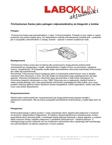 Trichomonas foetus jako patogen odpowiedzialny za biegunki u kotów Patogen Trichomonas foetus jest pierwotniakiem z rzędu Trichomonadidae. Posiada on trzy rzęski w części przedniej oraz jedną rzęskę tylną. Ich stwierdzenie metodą mikroskopową moŜliwe jest – podobnie jak w przypadku pierwotniaków z rodzaju Giardia – jedynie w świeŜo wydalonym kale. Występowanie Trichomonas foetus znany jest od dawna jako przenoszony drogą płciową drobnoustrój chorobotwórczy występujący u bydła, odpowiedzialny między innymi za poronienia, zapalenie macicy i bezpłodność. W przypadku bydła dzięki wprowadzeniu sztucznej inseminacji drobnoustrój ten udało się wyeliminować. Pierwotniak Trichomonas foetus występuje takŜe w przewodzie pokarmowym oraz w obrębie nosowych błon śluzowych u świń, lecz jak dotąd nie stwierdzono jego patologiczności dla tego gatunku. Pierwsze doniesienia o obecności tego pierwotniaka w kale kotów cierpiących na chroniczne biegunki odnotowano w roku 1996. Dotyczyły one w większości młodych kotów w wieku poniŜej jednego roku oraz gospodarstw domowych posiadających kilka kotów, przy czym problem dotyczył głównie kotów rasowych (kotów bengalskich, kotów syjamskich, kotów rasy Main Coon oraz kotów abisyńskich). Rozprzestrzenianie Wśród kotów drobnoustrój ten rozprzestrzenia się drogą pokarmową poprzez kontakt z zakaŜonymi odchodami. Nie są znane przypadki przeniesienia drobnoustroju z bydła bądź świń na kota. Patogeneza Drobnoustrój bytuje w jelicie grubym i moŜe wywoływać stany zapalne jelit połączone z trudnymi do leczenia i długotrwałymi biegunkami. W badaniu ultrasonograficznym zaobserwować moŜna pogrubienie błony śluzowej jelita, a histologia biopsji jelitowej wykazuje z reguły łagodne, a czasem takŜe znaczne zmiany zapalne połączone z naciekiem limfocytarnym i plazmocytarnym. Z histologicznego punktu widzenia nie ma moŜliwości odróŜnienia stanu zapalnego jelit wywołanego tym pierwotniakiem od stanów zapalnych o innym podłoŜu. Obraz kliniczny U chorych zwierząt obserwuje się typowe przy zapaleniu jelita grubego częste biegunki o stosunkowo niewielkiej objętości, czasem z domieszką śluzu i krwi. Biegunkom często towarzyszy bolesne parcie, a takŜe niekontrolowane stolce, przy czym z reguły nie obserwuje się zaburzeń ogólnego samopoczucia zwierzęcia. Równie rzadko obserwuje się podwyŜszoną ciepłotę ciała. JeŜeli biegunki utrzymują się przez dłuŜszy czas, moŜe dojść do zapalenia błony śluzowej odbytu, co dla chorego zwierzęcia jest szczególnie bolesne. Z reguły nie obserwuje się utraty wagi ciała. Przebieg Nieleczone, biegunki przybierają postać przewlekłą bądź pojawiają się z przerwami i utrzymują się przez okres 6-9 miesięcy. W sporadycznych przypadkach obserwowano biegunki utrzymujące się nawet przez kilka lat. Nawet u zwierząt nieleczonych następuje samoczynne ustąpienie choroby, przy czym drobnoustrój wydalany jest nadal - choć w mniejszych ilościach - przez stosunkowo długi okres, nawet do 5 lat. Niewiele natomiast wiadomo o zakaŜeniach drogą płciową u kotów - analogicznie do zakaŜeń u bydła. Obecność pierwotniaka Trichomonas foetus w treści macicznej stwierdzono jedynie u jednej kotki z ropomaciczem leczonej przez dłuŜszy glukokortykoidami. Istnieje jednak ryzyko, iŜ u kocurów, u których nie występują objawy kliniczne – podobnie jak u byków rozpłodowych – drobnoustrój moŜe bytować w okolicy napletka. Diagnoza Istnieje cały szereg mniej lub bardziej czułych metod diagnostycznych. Diagnostyka bezpośrednia odbywa się na podstawie świeŜej próbki stolca. JeŜeli wskutek zapalenia jelita wraz ze stolcem wydzielany jest śluz, do badania naleŜy wykorzystać śluz, gdyŜ zawiera on szczególnie duŜą liczbę pierwotniaków. NaleŜy pobrać niewielką ilość kału lub śluzu (na przykład z uŜytego wcześniej termometru), nanieść próbkę na nośnik oraz zmieszać ją z kroplą roztworu soli kuchennej. Tak przygotowaną próbkę nakrywamy szkiełkiem wierzchnim. Trichomonas foetus bytuje w jelicie grubym w postaci niewielkiego, ruchliwego trofozoitu (stadium troficzne), który dzięki swojej budowie morfologicznej i ruchliwości jest bardzo dobrze widoczny pod mikroskopem (obiektyw 20 lub 40). Same rzęski z reguły nie są widoczne, widoczny jest jedynie ich ruch. Drobnoustrój przypomina kształtem kijankę, a wzdłuŜ jego boków biegnie ruchliwa, falująca błona. Sposób poruszania się drobnoustroju wydaje się być nieskoordynowany. Czułość metody bezpośredniej moŜna dodatkowo zwiększyć badając kilka próbek kału. W diagnostyce róŜnicowej w rachubę wchodzi pierwotniak z rodzaju Giardia, ten posiada jednak dwa jądra. Po wybarwieniu u T. foetus widoczne jest pojedyncze jądro oraz rzęski, a raczej ich ruch. JeŜeli zakaŜony kot leczony jest ze względu na nawracające biegunki przez dłuŜszy czas antybiotykami, liczba wydalanych przez zwierzę trofozoitów jest z reguły stosunkowo niewielka. Dlatego teŜ konieczne jest zastosowanie bardziej czułych metod diagnostycznych, na przykład hodowli lub PCR. Posiłkując się diagnostyką stosowaną u bydła podjęliśmy próbę wyhodowania T. foetus na odpowiednim podłoŜu (podłoŜe Trichomonas Medium firmy Heipha). PodłoŜe to stanowiła specjalna zawiesina w probówkach przeznaczona specjalnie do hodowli rzęsistków i hamująca rozwój bakterii, a takŜe droŜdŜy i pleśni. W probówce zawierającej 10 ml zawiesiny umieszczono próbkę kału wielkości ziarenka grochu. Ze względu na stosunkowo rzadką konsystencję kału selekcji próbek do badania dokonano z materiału rutynowego nie uwzględniając wcześniejszych informacji. Inkubacja przebiegała wstępnie w temperaturze 28°C przez okres 48 godzin, nas tępnie przy pomocy zakraplacza pobierano kroplę zawiesiny hodowlanej przenosząc ją na nośnik i przykrywając s
