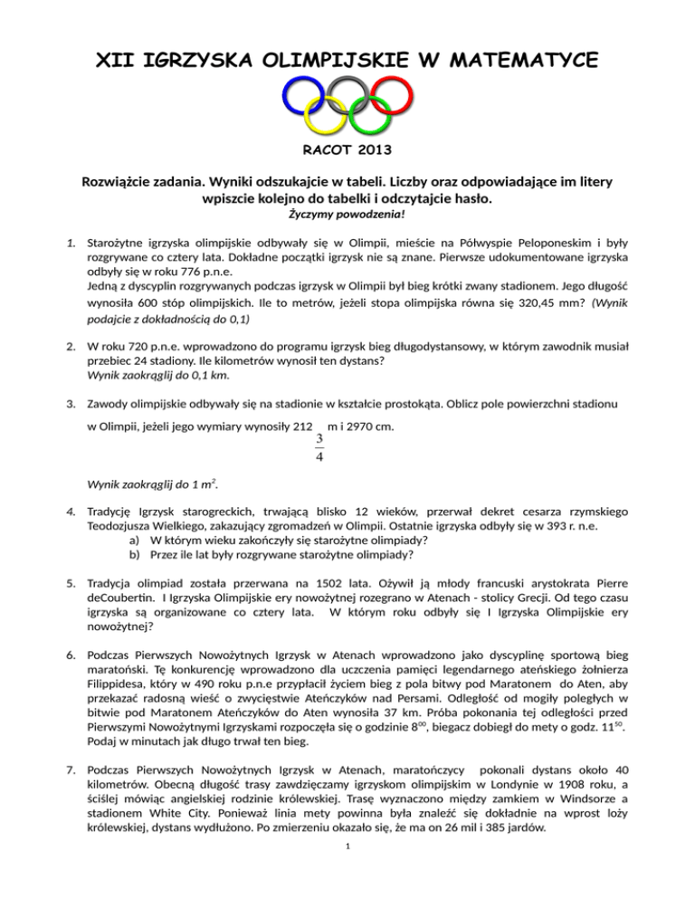 XII IGRZYSKA OLIMPIJSKIE W MATEMATYCE RACOT 2013 Rozwiążcie zadania. Wyniki odszukajcie w tabeli. Liczby oraz odpowiadające im litery wpiszcie kolejno do tabelki i odczytajcie hasło. Życzymy powodzenia! 1. Starożytne igrzyska olimpijskie odbywały się w Olimpii, mieście na Półwyspie Peloponeskim i były rozgrywane co cztery lata. Dokładne początki igrzysk nie są znane. Pierwsze udokumentowane igrzyska odbyły się w roku 776 p.n.e. Jedną z dyscyplin rozgrywanych podczas igrzysk w Olimpii był bieg krótki zwany stadionem. Jego długość wynosiła 600 stóp olimpijskich. Ile to metrów, jeżeli stopa olimpijska równa się 320,45 mm? (Wynik podajcie z dokładnością do 0,1) 2. W roku 720 p.n.e. wprowadzono do programu igrzysk bieg długodystansowy, w którym zawodnik musiał przebiec 24 stadiony. Ile kilometrów wynosił ten dystans? Wynik zaokrąglij do 0,1 km. 3. Zawody olimpijskie odbywały się na stadionie w kształcie prostokąta. Oblicz pole powierzchni stadionu w Olimpii, jeżeli jego wymiary wynosiły 212 3 4 m i 2970 cm. Wynik zaokrąglij do 1 m2. 4. Tradycję Igrzysk starogreckich, trwającą blisko 12 wieków, przerwał dekret cesarza rzymskiego Teodozjusza Wielkiego, zakazujący zgromadzeń w Olimpii. Ostatnie igrzyska odbyły się w 393 r. n.e. a) W którym wieku zakończyły się starożytne olimpiady? b) Przez ile lat były rozgrywane starożytne olimpiady? 5. Tradycja olimpiad została przerwana na 1502 lata. Ożywił ją młody francuski arystokrata Pierre deCoubertin. I Igrzyska Olimpijskie ery nowożytnej rozegrano w Atenach - stolicy Grecji. Od tego czasu igrzyska są organizowane co cztery lata. W którym roku odbyły się I Igrzyska Olimpijskie ery nowożytnej? 6. Podczas Pierwszych Nowożytnych Igrzysk w Atenach wprowadzono jako dyscyplinę sportową bieg maratoński. Tę konkurencję wprowadzono dla uczczenia pamięci legendarnego ateńskiego żołnierza Filippidesa, który w 490 roku p.n.e przypłacił życiem bieg z pola bitwy pod Maratonem do Aten, aby przekazać radosną wieść o zwycięstwie Ateńczyków nad Persami. Odległość od mogiły poległych w bitwie pod Maratonem Ateńczyków do Aten wynosiła 37 km. Próba pokonania tej odległości przed Pierwszymi Nowożytnymi Igrzyskami rozpoczęła się o godzinie 8 00, biegacz dobiegł do mety o godz. 1150. Podaj w minutach jak długo trwał ten bieg. 7. Podczas Pierwszych Nowożytnych Igrzysk w Atenach, maratończycy pokonali dystans około 40 kilometrów. Obecną długość trasy zawdzięczamy igrzyskom olimpijskim w Londynie w 1908 roku, a ściślej mówiąc angielskiej rodzinie królewskiej. Trasę wyznaczono między zamkiem w Windsorze a stadionem White City. Ponieważ linia mety powinna była znaleźć się dokładnie na wprost loży królewskiej, dystans wydłużono. Po zmierzeniu okazało się, że ma on 26 mil i 385 jardów. 1 I tak zostało do dziś... Ile metrów liczy obecnie długość trasy biegu maratońskiego? (1 mila ang. = 1760 jardów =1609,344m; 1 jard = 0,9144m) Wynik zaokrąglij do całości. 8. Stosunkowo późno, bo dopiero na igrzyskach olimpijskich w 1984 roku w Los Angeles konkurencją olimpijską stał się kobiecy maraton. Zwyciężyła reprezentantka USA Joan Benoit w czasie 2:24:52. Jaka była średnia prędkość biegaczki? Przedstaw ją w m/s. Wynik zaokrąglij do całości. 9. Stolica Wielkiej Brytanii jest pierwszym miastem, które trzykrotnie zorganizowało Olimpiadę. Igrzyska zawitały tu w latach 1908, 1948 oraz 2012. Jednocześnie zeszłoroczne Igrzyska powinny być czwartymi (a nie trzecimi) z kolei - stolica Wielkiej Brytanii miała podjąć się organizacji IO w roku 1944. W imprezie przeszkodziła jednak wojna. Które z kolei igrzyska odbyły się w 2012 roku w Londynie? 10. Maraton mężczyzn podczas Letnich Igrzysk Olimpijskich 2012 rozegrano 12 sierpnia o godzinie 11:00 czasu miejscowego (12:00 czasu polskiego) na ulicach Londynu. Wystartowało 105 zawodników, z których do mety dobiegło 85. Zwycięzcą został Ugandyjczyk Stephen Kiprotich (2:08:01). Polak Henryk Szost stoczył heroiczny bój z ciemnoskórymi zawodnikami. Zajął 9 miejsce, uzyskując wynik gorszy od zdobywcy złotego medalu o 4min. 27s. Zostawił daleko w tyle wszystkich pozostałych biegaczy ze Starego Kontynentu. a) Jaki był czas Polaka? b) Jaki procent zawodników ukończył bieg maratoński? Wynik podaj z dokładnością do 0,01) 11. W celu upamiętnienia udziału Polski w igrzyskach w Londynie Narodowy Bank Polski wyemitował monety okolicznościowe "Polska Reprezentacja Olimpijska Londyn 2012" Na awersie srebrnej 10-złotówki na tle stylizowanych konturów panoramy miasta, znalazł się wizerunek orła ustalony dla godła Rzeczypospolitej Polskiej. Na rewersie umieszczono kompozycję składającą się ze stylizowanych wizerunków zawodników różnych dyscyplin sportowych na tle pięciu stylizowanych kół. Awers srebrnej monety „Polska reprezentacja olimpijska Londyn 2012” o nominale 10 zł. Rewers srebrnej monety „Polska reprezentacja olimpijska Londyn 2012” o nominale 10 zł. Stop Stempel Średnica Masa Nakład Cena sprzedaży Liczba monet przeznaczonych do sprzedaży Ag 925/1000 lustrzany 32,00 mm 14,14 g 50 tys. szt. 94 zł 42,5 tys. szt. Data emisji 12-07-2012 a) Podaj (w kilogramach) wagę wszystkich wyemitowanych monet. b) Podaj w centymetrach, jaką drogę pokonałaby ta moneta tocząc się po stole przy wykonaniu czterech pełnych obrotów (przyjmij π ≈ 3,14, wynik zaokrąglij do 0,1). c) Podaj, jaki procent czystego srebra zawiera wyemitowana 10 – złotówka. 2 d) Ile pieniędzy wpłynie do NBP po sprzedaży monet wystawionych na aukcji? 12. O organizację IO 2012 walczyło w finale 5 miast - Londyn, Paryż, Madryt, Nowy Jork i Moskwa. Ostateczna bitwa rozegrała się 6 lipca 2005 roku między stolicą Wielkiej Brytanii a Hiszpanii - członkowie Międzynarodowego Komitetu Olimpijskiego głosowali więc... wynik Londyn 54:50 Madryt. O ile proce