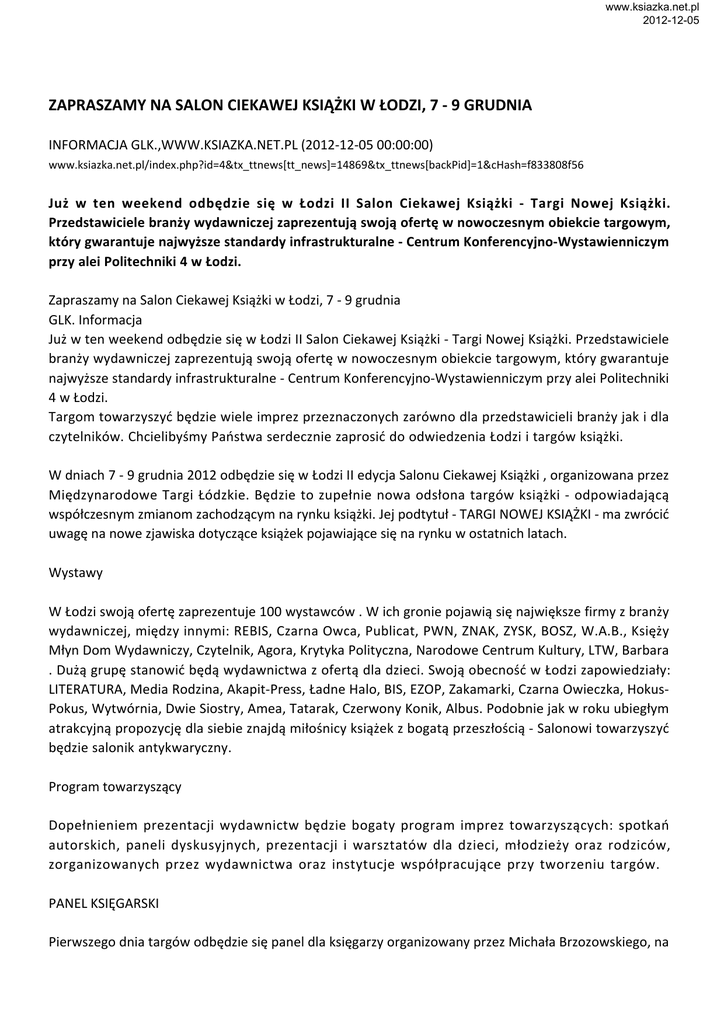 www.ksiazka.net.pl 2012-12-05 ZAPRASZAMY NA SALON CIEKAWEJ KSIĄŻKI W ŁODZI, 7 - 9 GRUDNIA INFORMACJA GLK.,WWW.KSIAZKA.NET.PL (2012-12-05 00:00:00) www.ksiazka.net.pl/index.php?id=4&tx_ttnews[tt_news]=14869&tx_ttnews[backPid]=1&cHash=f833808f56 Już w ten weekend odbędzie się w Łodzi II Salon Ciekawej Książki - Targi Nowej Książki. Przedstawiciele branży wydawniczej zaprezentują swoją ofertę w nowoczesnym obiekcie targowym, który gwarantuje najwyższe standardy infrastrukturalne - Centrum Konferencyjno-Wystawienniczym przy alei Politechniki 4 w Łodzi. Zapraszamy na Salon Ciekawej Książki w Łodzi, 7 - 9 grudnia GLK. Informacja Już w ten weekend odbędzie się w Łodzi II Salon Ciekawej Książki - Targi Nowej Książki. Przedstawiciele branży wydawniczej zaprezentują swoją ofertę w nowoczesnym obiekcie targowym, który gwarantuje najwyższe standardy infrastrukturalne - Centrum Konferencyjno-Wystawienniczym przy alei Politechniki 4 w Łodzi. Targom towarzyszyć będzie wiele imprez przeznaczonych zarówno dla przedstawicieli branży jak i dla czytelników. Chcielibyśmy Państwa serdecznie zaprosić do odwiedzenia Łodzi i targów książki. W dniach 7 - 9 grudnia 2012 odbędzie się w Łodzi II edycja Salonu Ciekawej Książki , organizowana przez Międzynarodowe Targi Łódzkie. Będzie to zupełnie nowa odsłona targów książki - odpowiadającą współczesnym zmianom zachodzącym na rynku książki. Jej podtytuł - TARGI NOWEJ KSIĄŻKI - ma zwrócić uwagę na nowe zjawiska dotyczące książek pojawiające się na rynku w ostatnich latach. Wystawy W Łodzi swoją ofertę zaprezentuje 100 wystawców . W ich gronie pojawią się największe firmy z branży wydawniczej, między innymi: REBIS, Czarna Owca, Publicat, PWN, ZNAK, ZYSK, BOSZ, W.A.B., Księży Młyn Dom Wydawniczy, Czytelnik, Agora, Krytyka Polityczna, Narodowe Centrum Kultury, LTW, Barbara . Dużą grupę stanowić będą wydawnictwa z ofertą dla dzieci. Swoją obecność w Łodzi zapowiedziały: LITERATURA, Media Rodzina, Akapit-Press, Ładne Halo, BIS, EZOP, Zakamarki, Czarna Owieczka, HokusPokus, Wytwórnia, Dwie Siostry, Amea, Tatarak, Czerwony Konik, Albus. Podobnie jak w roku ubiegłym atrakcyjną propozycję dla siebie znajdą miłośnicy książek z bogatą przeszłością - Salonowi towarzyszyć będzie salonik antykwaryczny. Program towarzyszący Dopełnieniem prezentacji wydawnictw będzie bogaty program imprez towarzyszących: spotkań autorskich, paneli dyskusyjnych, prezentacji i warsztatów dla dzieci, młodzieży oraz rodziców, zorganizowanych przez wydawnictwa oraz instytucje współpracujące przy tworzeniu targów. PANEL KSIĘGARSKI Pierwszego dnia targów odbędzie się panel dla księgarzy organizowany przez Michała Brzozowskiego, na www.ksiazka.net.pl 2012-12-05 którym zaprezentowane zostaną projekty mające na celu wzmocnienie pozycji księgarni niezależnych na rynku. Proponowane rozwiązania i projekty przedstawią: Narodowe Centrum Kultury, OSDW AZYMUT oraz Polska Izba Książki. NOWE MEDIA I TECHNOLOGIE w ujęciu AZYMUT Sp. z o.o. 7 grudnia odbędzie się panel poświęcony nowym mediom na rynku wydawniczym , przygotowany przez największą polską firmę dystrybucyjną - AZYMUT OSDW. Tematyka panelu dotyczyć będzie: rynku ebooków, platformy edukacyjnej Educhmura; portal Lubimy Czytać zaprezentuje "Aplikacje mobilne na rynku książki"; trzecia część dotyczyć będzie nowych technologii i usług OSDW AZYMUT. NOWE MEDIA w ujęciu MICROSOFT "Współczesny czytelnik, współczesny wydawca. Jak technologia pomaga miłośnikom książek." Prelekcja ma za zadanie pokazać nowe możliwości dla miłośników książek, związane z rozwijającą się technologią informatyczną. Microsoft opowie jak pasjonat zapachu farby drukarskiej może odnaleźć się we współczesnym, cyfrowym świecie, i czerpać z niego pełnymi garściami. ROZSTRZYGNIĘCIE KONKURSU "NAJLEPSZA KSIĄŻKA NA ZIMĘ" Uroczystość ogłoszenia wyników i wręczenia statuetek odbędzie się 7 grudnia (piątek) o godzinie 13.00 w OPEN SPACE. Konkurs organzuje portal granice.pl SPOTKANIA Z AUTORAMI Podczas targów odbędzie się kilkadziesiąt spotkań ze znanymi pisarzami, filozofami oraz ilustratorami książek. W Łodzi pojawią się między innymi: Marek Bieńczyk ; Iwona Chmielewska , znana na całym świecie autorka książek dla dzieci; Dominika Dymińska , autorka kontrowersyjnej książki "Mięso"; Kaja Malanowska ; Agata Bielik-Robson ; Lidia Ostałowska ; Sławek Shuty ; Krzysztof Beśka ; Tomasz Grzywaczewski , który współorganizował Long Walk Plus Expedition - wyprawę śladami grupy więźniów, którzy w 1941 r. uciekli z syberyjskiego łagru i dotarli do Indii; Dariusz Brzóska Brzóskiewicz z książką "Haiku"; Jacek Kusiński - autor książki "Łódź na mapach 1793-1939"; Lech Lechowicz , autor licznych książek o fotografii; Justyna Sobolewska; Marzena Bomanowska ; Tomasz Szwed - znany piosenkarz country i autor książek dla dzieci; Paweł Gumola - muzyk kultowej grupy Moskwa, który promować będzie album poświęcony muzyce niezależnej z lat 80. KSIĄŻKI Z AUTOGRAFEM Na wielu stoiskach będzie można spotkać najlepszych autorów i uzyskać autograf . Będą wśród nich między innymi: Tomasz Sekielski, Grzegorz Kasdepke, Paweł Wakuła, Kalina Jerzykowska, Izabella Klebańska, Grażyna Bąkiewicz, Sergiusz Pinkwart. PANELE DYSKUSYJNE www.ksiazka.net.pl 2012-12-05 - LITERACKIE OBRAZY ŁODZI (8 grudnia) - blok spotkań organizowanych przez Centrum Dialogu im. M. Edelmana - WIDZIEĆ WIĘCEJ - edukacja a współczesna książka dla dzieci (7 grudnia) - organizowany przez Stowarzyszenie Twórców Kultury i Sztuki KAMIENICA 56 oraz Poza Rozkładem panel dyskusyjny pomyślany jako miejsce wymiany doświadczeń i pomysłów na wykorzystanie współczesnej książki dla dzieci, zwłaszcza książki obrazowej w procesie edukacji (przedszkolnej, szkolnej i domowej). - podsumowan