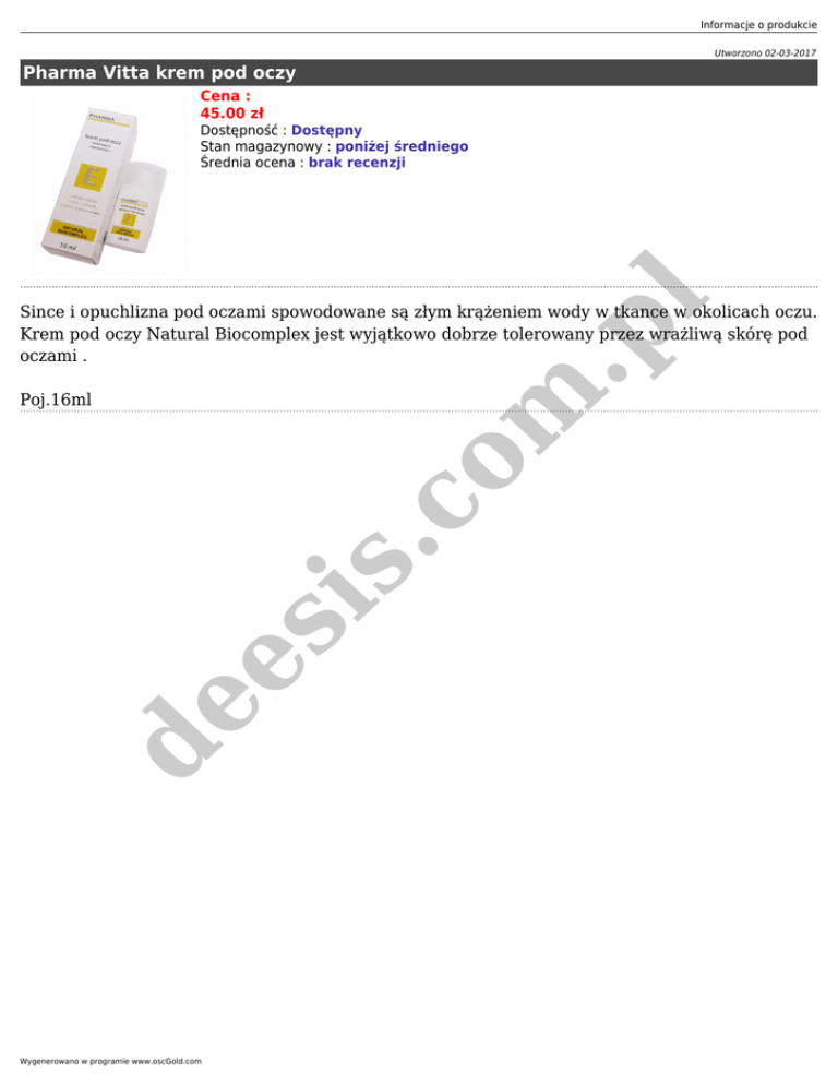 Informacje o produkcie Utworzono 02-03-2017 Pharma Vitta krem pod oczy Cena : 45.00 zł m .p l Dostępność : Dostępny Stan magazynowy : poniżej średniego Średnia ocena : brak recenzji Since i opuchlizna pod oczami spowodowane są złym krążeniem wody w tkance w okolicach oczu. Krem pod oczy Natural Biocomplex jest wyjątkowo dobrze tolerowany przez wrażliwą skórę pod oczami . de es is .c o Poj.16ml Wygenerowano w programie www.oscGold.com