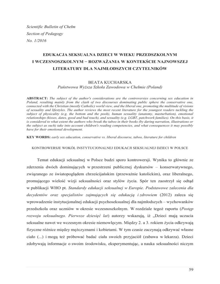 Scientific Bulletin of Chełm Section of Pedagogy No. 1/2016 EDUKACJA SEKSUALNA DZIECI W WIEKU PRZEDSZKOLNYM I WCZESNOSZKOLNYM − ROZWAŻANIA W KONTEKŚCIE NAJNOWSZEJ LITERATURY DLA NAJMŁODSZYCH CZYTELNIKÓW BEATA KUCHARSKA Państwowa Wyższa Szkoła Zawodowa w Chełmie (Poland) ABSTRACT: The subject of the author's considerations are the controversies concerning sex education in Poland, resulting mainly from the clash of two discourses dominating public sphere the conservative one, connected with the Christian (mostly Catholic) world view, and the liberal one, promoting the multitude of visions of sexuality and lifestyles. The author reviews the most recent literature for the youngest readers tackling the subject of physicality (e.g. the bottom and the pooh), human sexuality (anatomy, masturbation), emotional relationships (kisses, dates, good and bad touch), and sexuality (e.g. LGBT, patchwork families). On this basis, it is considered to what extent the authors who break the taboo in their books (by daring narration, illustrations or the subject as such) take into account children's reading competencies, and what consequences it may possibly have for their emotional development. KEY WORDS: early sex education, conservative vs. liberal discourse, taboo, literature for children KONTROWERSJE WOKÓŁ INSTYTUCJONALNEJ EDUKACJI SEKSUALNEJ DZIECI W POLSCE Temat edukacji seksualnej w Polsce budzi sporo kontrowersji. Wynika to głównie ze zderzenia dwóch dominujących w przestrzeni publicznej dyskursów – konserwatywnego, związanego ze światopoglądem chrześcijańskim (przeważnie katolickim), oraz liberalnego, promującego wielość wizji seksualności oraz stylów życia. Spór ten zaostrzył się odtąd w publikacji WHO pt. Standardy edukacji seksualnej w Europie. Podstawowe zalecenia dla decydentów oraz specjalistów zajmujących się edukacją i zdrowiem (2012) zaleca się wprowadzenie instytucjonalnej edukacji psychoseksualnej dla najmłodszych – wychowanków przedszkola oraz uczniów w okresie wczesnoszkolnym. W rozdziale tegoż raportu (Postęp rozwoju seksualnego. Pierwsze dziesięć lat) autorzy wskazują, iż „Dzieci mają uczucia seksualne nawet we wczesnym okresie niemowlęcym. Między 2. a 3. rokiem życia odkrywają fizyczne różnice między mężczyznami i kobietami. W tym czasie zaczynają odkrywać własne ciało (...) i mogą też próbować badać ciała swoich przyjaciół (zabawa w lekarza). Dzieci zdobywają informacje o swoim środowisku, eksperymentując, a nauka seksualności niczym 59 nie różni się w tym zakresie”151. Dalej czytamy: „Na podstawie wyników licznych badań obserwacyjnych zidentyfikowano powszechne zachowania seksualne u dzieci, a równocześnie stwierdzono, że tego typu zachowania są normalne”152. Zgodnie z wytycznymi Standardów edukacja seksualna ma składać się z kilku etapów: I – od niemowlęcia do 3. roku życia (odkrywanie siebie i swego ciała oraz płciowości dorosłych); II – od 4 do 6 lat (odkrywanie seksualności w grupie podczas zabaw, odpowiedź na ciekawość odnośnie prokreacji); III – dla dzieci w wieku od 6 do 9 lat, zaczynających odczuwać wstyd odnośnie swojej fizyczności (nagości, różnic płciowych), które „zadają mniej pytań dotyczących seksu, co jednak nie oznacza, iż są w mniejszym stopniu zainteresowane tym tematem. Zorientowały się już, iż seks jest tematem «niewygodnym» i że nie jest właściwe mówienie o nim w miejscach publicznych”153. W świetle powyższych ustaleń ważną rolę – według autorów raportu – powinna pełnić detabuizująca edukacja seksualna. Podobnego zdania są popularni medialnie psycholodzy w Polsce, jak: Aleksandra Piotrowska czy Lew Starowicz, którzy zgodnie przestrzegają przed brakiem detabuizującej edukacji, co negatywnie wpłynie na cały rozwój dziecka oraz jego przyszłe funkcjonowanie jako człowieka seksualnego. Twierdzą, że „należy skończyć z mitem o aseksualnym charakterze dzieciństwa” oraz szkodliwej idealizacji ze strony środowisk konserwatywnych154. Analogiczną opinię prezentuje edukatorka psychoseksualna, Alicja Długołęcka, która w swoich publikacjach (m.in. w Zwykłej książce, skąd się biorą dzieci?, 2012) zaleca, aby to rodzice inicjowali rozmowy na temat seksu, nie czekając na pierwsze pytania swoich dzieci. Instruktorzy Pontonu (Grupy Edukatorów Seksualnych przy Federacji na rzecz Kobiet i Planowania Rodziny) zachęcają do prowadzenia tego typu zajęć jak najwcześniej, bo – jak przekonuje jedna z instruktorek, Finka Heynemann – od urodzenia posiadamy narządy płciowe i rozwijamy się emocjonalnie, a przecież są to komponenty niezbędne w dorosłym, seksualnie aktywnym życiu155. W opozycji do tego wiodącego w polskich mediach dyskursu pozostaje m.in. Stowarzyszenie „Twoja Sprawa” (STS) oraz rodzice i pedagodzy, zrzeszający się pod hasłem „Idea SSND (Stop Seksualizacji Naszych Dzieci)”, którzy powołują się na odmienne dane niż 151 http://www.federa.org.pl/dokumenty_pdf/edukacja/WHO_BZgA_Standardy_edukacji_seksualnej.pdf, s. 25, (dostęp: 20.01.2016). 152 Ibidem. 153 Ibidem, s. 27. 154 Program TVN24 Tak jest: Stop seksualizacji dzieci. Rozmowa dr Aleksandry Piotrowskiej i Lesława Sierockiego, 12.02.2014, http://www.tvn24.pl/tak-jest,39,m/ochronic-dzieci-przed-seksualizacja,397595.html, (dostęp: 20.01.2016). 155 Cf. F. Heynemann, Nie bójmy się edukacji seksualnej czterolatków!, http://ponton.natemat.pl/59339,niebojmy-sie-edukacji-seksualnej-czterolatkow, (dostęp: 15.01.2016). 60 autorzy raportu WHO. Lesław Sierocki, dyrektor zarządzający STS, organizując akcję „Stop pornobiznesowi”, przytaczał dane z badań Instytutu Profilaktyki Zintegrowanej, z których wynika, że 720 tysięcy dzieci w Polsce (w wieku od 7 do 14 lat) odwiedza strony z pornografią przynajmniej raz w miesiącu156. Podczas regularnie organizowanych przez stowarzyszenie akcji pojawiają 