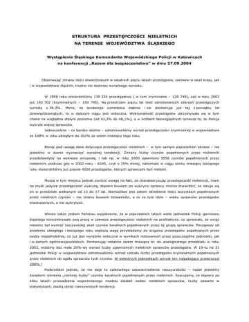 STRUKTURA PRZESTĘPCZOŚCI NIELETNICH NA TERENIE WOJEWÓDZTWA ŚLĄSKIEGO Wystąpienie Śląskiego Komendanta Wojewódzkiego Policji w Katowicach na konferencji „Razem dla bezpieczeństwa” w dniu 27.09.2004 Obserwując zmiany ilości stwierdzonych w ostatnich pięciu latach przestępstw, zarówno w skali kraju, jak i w województwie śląskim, trudno nie dostrzec wyraźnego wzrostu. W 1999 roku stwierdziliśmy 139 334 przestępstwa ( w tym kryminalne – 128 748), zaś w roku 2003 już 192 702 (kryminalnych – 159 795). Na przestrzeni pięciu lat ilość odnotowanych zdarzeń przestępczych wzrosła o 38,3%. Mimo, że tendencja wzrostowa słabnie i nie dorównuje już tej z początku lat dziewięćdziesiątych, to w dalszym ciągu jest widoczna. Wykrywalność przestępstw utrzymywała się w tym czasie na względnie stałym poziomie (od 43,3% do 48,1%), a w liczbach bezwzględnych oznacza to, że Policja wykryła więcej sprawców. Jednocześnie – co bardzo istotne – zahamowaliśmy wzrost przestępczości kryminalnej w województwie ze 108% w roku ubiegłym do 102% za osiem miesięcy tego roku. Biorąc pod uwagę dane dotyczące przestępczości nieletnich – w tym samym pięcioletnim okresie – nie jesteśmy w stanie wyznaczyć wyraźnej tendencji. Zmiany liczby czynów popełnionych przez nieletnich przedstawiłyby na wykresie sinusoidę, i tak np. w roku 2000 ujawniono 9556 czynów popełnionych przez nieletnich, podczas gdy w 2002 roku - 6245, czyli o 35% mniej, natomiast w ciągu ośmiu miesięcy bieżącego roku stwierdziliśmy już prawie 4500 przestępstw, których sprawcami byli nieletni. Muszę w tym miejscu jednak zwrócić uwagę na fakt, że charakteryzując przestępczość nieletnich, mam na myśli jedynie przestępczość wykrytą, dopiero bowiem po wykryciu sprawcy można stwierdzić, że lokuje się on w przedziale wiekowym od 13 do 17 lat. Niemożliwe jest zatem określenie ilości wszystkich popełnionych przez nieletnich czynów – nie znamy bowiem tożsamości, a co za tym idzie – wieku sprawców przestępstw stwierdzonych, a nie wykrytych. Winien także jestem Państwu wyjaśnienie, że w poprzednich latach wiele jednostek Policji garnizonu śląskiego koncentrowało swą pracę w zakresie przestępczości nieletnich na profilaktyce, co sprawiało, że wciąż nieostry był wymiar rzeczywistej skali czynów karalnych popełnianych przez tę grupę sprawców. Począwszy od przełomu ubiegłego i bieżącego roku większą wagę przykładamy do ścigania przestępstw popełnianych przez osoby niepełnoletnie, co już jest wyraźnie widoczne w wynikach notowanych przez poszczególne jednostki, jak i w danych ogólnowojewódzkich. Porównując ostatnie osiem miesięcy br. do analogicznego przedziału w roku 2003, widzimy bez mała 20%-wy wzrost liczby ujawnionych nieletnich sprawców przestępstw. W 19-tu na 31 jednostek Policji w województwie odnotowaliśmy wzrost udziału liczby przestępstw kryminalnych popełnionych przez nieletnich do ogółu sprawców tych czynów. W niektórych jednostkach wzrost ten niepokojąco przekroczył 200% ! Podkreślam jednak, że nie daje to całkowitego odzwierciedlenia rzeczywistości – nadal jesteśmy świadomi istnienia „ciemnej liczby” czynów karalnych popełnianych przez nieletnich. Szacujemy, że dopiero po kilku latach prowadzenia wspomnianego modelu działań wobec nieletnich sprawców, liczby zawarte w statystykach, dadzą obraz rzeczywistych tendencji. Struktura przestępczości nieletnich zdominowana jest przez przestępczość kryminalną. Notujemy jedynie pojedyncze przypadki popełniania przez nieletnich przestępstw gospodarczych. Systematycznie tymczasem wzrasta udział młodych sprawców w kategoriach przestępstw związanych z użyciem przemocy, takich jak uszkodzenie ciała i udział w bójce lub pobiciu. W 1999 roku te dwie kategorie stanowiły 8,6% czynów nieletnich, w roku 2003 wzrosły już o jedną trzecią (11,1%). Niepokojąco wysoki jest również udział w przestępczości nieletnich takich kategorii czynów, jak: rozbój, kradzież rozbójnicza i wymuszenie rozbójnicze. W 2003 roku co czwarty sprawca tego czynu miał nie więcej, niż 17 lat. Dane te wydają się jeszcze bardziej niepokojące, gdy odniesiemy je do liczb dotyczących przestępczości ogółem. Udział nieletnich w przestępstwach stwierdzonych ogółem wyniósł w roku 2003 - 3,5%, zaś w przestępstwach wykrytych - 7,4%.Jednak w kategorii rozbój, kradzież rozbójnicza i wymuszenie rozbójnicze wskaźniki te wyniosły 17,7% w przestępstwach stwierdzonych i około 40% w przestępstwach wykrytych. Można więc stwierdzić, że co trzeci rozbój jest dokonywany przez sprawcę, który nie ukończył siedemnastego roku życia. Patrząc zaś na wyniki odnotowane przez poszczególne komendy powiatowe i miejskie w ciągu ośmiu minionych miesięcy, nie sposób nie zauważyć, że rośnie ilość tych, w których ponad połowa sprawców rozbojów to osoby nieletnie – widać to np. w Częstochowie (55%), Tarnowskich Górach (57%), Myszkowie (61,3%), Zabrzu (67,5%), Kłobucku (68,8%) i w Pszczynie (72%). Nieco niższe, choć również niepokojące, są te wskaźniki w Gliwicach (45%) i w Katowicach (37,9%). Wnioski płynące z naszych dotychczasowych działań, pozwalają na nakreślenie następującego obrazu nieletniego sprawcy: popełnia on przestępstwa pospolite, posługując się najprostszymi metodami. Jeżeli dokonuje kradzieży z włamaniem, stosuje prymitywne, siłowe metody pokonania zabezpieczeń: wybija szybę, czy ukręca kłódkę. Stosunkowo częściej, niż dorośli sprawcy, posługuje się w kradzieży przemocą, brutalnie i bezwzględnie traktując swoje ofiary, nawet wtedy, gdy nie jest to konieczne np. ofiara sama chce oddać przedmiot przestępstwa. Coraz częściej spotykamy się ze zjawiskiem, określanym „przemocą dla przemocy”, która jest swoistym odreagowaniem frustracji młodych ludzi ora