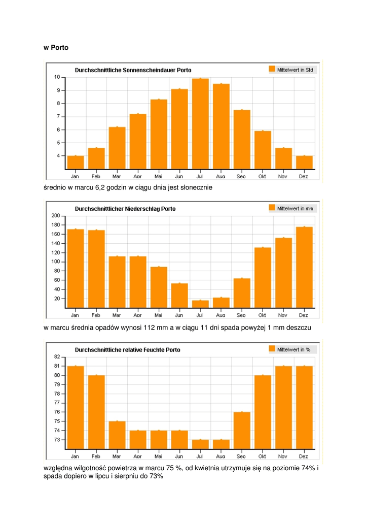 w Porto średnio w marcu 6,2 godzin w ciągu dnia jest słonecznie w marcu średnia opadów wynosi 112 mm a w ciągu 11 dni spada powyżej 1 mm deszczu względna wilgotność powietrza w marcu 75 %, od kwietnia utrzymuje się na poziomie 74% i spada dopiero w lipcu i sierpniu do 73% Temperatura wacha się średnio w granicach od 16,2°C do 6,8°C. Najwyższa notowana wynosiła 28,5°C a najniższa –1,9°C Porto Miesiąc Abs. Max °C Abs. Min °C Ø Max °C Ø Min °C wilgotność względna % opady mm dni z opadami powyżej 1mm godzin słonecznych na dzień Styczeń 22.3 -4.1 13.5 5.1 81 171 14 4.0 Luty 29.0 -3.8 14.3 5.9 80 169 13 4.6 Marzec 28.5 -1.9 16.2 6.8 75 112 11 6.2 Kwiecień 31.9 0.1 17.5 8.3 74 112 10 7.2 Maj 34.7 2.6 19.6 10.6 74 89 9 8.3 Czerwiec 38.7 5.6 22.7 13.5 74 53 6 9.1 Lipiec 40.1 8.8 24.7 15.0 73 16 2 9.9 Sierpień 39.4 8.0 25.0 14.6 73 22 3 9.5 Wrzesień 37.2 3.8 24.0 13.9 76 64 6 7.5 Październik 34.4 1.4 20.9 11.4 80 131 10 5.9 Listopad 27.7 -1.3 16.7 7.9 81 152 12 4.6 Grudzień 24.8 -3.7 13.9 5.9 81 176 12 4.0 średnio w roku 40.1 -4.1 19.1 9.9 77 1267 108 6.8 A Coruna (około 70 km na północ od Santiago de Compostela) w Galicji może być pochmurniej, słonecznie jest przez 4,8 godziny na dzień 86,3 mm opadów na miesiąc to nieco mniej niż w Porto ale za to bywa aż 13 dni deszczowych w których opady są powyżej 1 mm wilgotność względna powietrza w marcu 74% utrzymuje się przez 6 miesięcy w roku, od czerwca do listopada na poziomie 79% Temperatura wacha się średnio w granicach od 14,4°C do 8,2°C. Ekstremalnie najwyższa wynosiła 28,2°C a najniższa 0,8°C A Coruna (Galicja) Miesiąc Abs. Max °C Abs. Min °C Ø Max °C Ø Min °C wilgotność względna % opady mm dni z opadami powyżej 1mm godzin słonecznych na dzień Styczeń 21.2 -0.8 13.0 7.5 77 131.1 16 3.3 Luty 23.0 -0.2 13.3 7.7 76 103.7 16 3.9 Marzec 28.2 0.8 14.4 8.2 74 86.3 13 4.8 Kwiecień 28.0 2.6 15.1 9.2 76 83.3 12 5.6 Maj 34.0 3.6 17.1 11.1 78 78.2 13 6.4 Czerwiec 34.8 8.2 19.5 13.4 79 48.8 8 7.3 Lipiec 33.6 10.2 21.6 15.2 79 25.2 4 8.0 Sierpień 39.6 11.0 22.1 15.6 79 28.8 6 7.6 Wrzesień 31.4 9.0 21.5 14.7 79 62.5 7 5.8 Październik 28.0 5.6 18.9 12.6 79 104 11 5.0 Listopad 25.0 2.8 15.5 9.8 79 116.2 12 3.7 Grudzień 25.6 0.6 13.5 8.3 78 127.8 14 3.0 średnio w roku 39.6 -0.8 17.1 11.1 78 995.9 132 5.4 na podstawie http://www.wetter.com/reise/laenderinfos/klimadatenbank/?type=sun&continent=EU&country=PT&station=085460