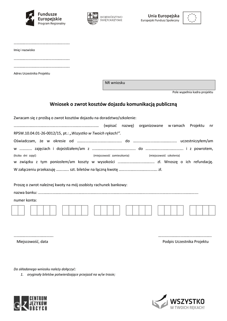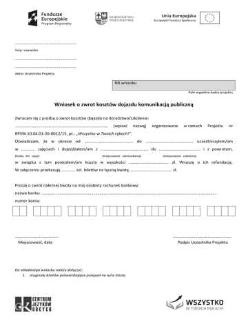 …………………………………………………. Imię i nazwisko …………………………………………………. …………………………………………………. Adres Uczestnika Projektu NR wniosku Pole wypełnia kadra projektu Wniosek o zwrot kosztów dojazdu komunikacją publiczną Zwracam się z prośbą o zwrot kosztów dojazdu na doradztwo/szkolenie: …………….……………………………………………………………… (wpisać nazwę) organizowane w ramach Projektu nr RPSW.10.04.01-26-0012/15, pt.: „Wszystko w Twoich rękach!”. Oświadczam, że w okresie od …………………………..………….. do ……………………….…………….. uczestniczyłem/am w …….…… zajęciach i dojeżdżałem/am z ……………………………………... do ……………………..…………. i z powrotem, (liczba dni zajęć) (miejscowość zamieszkania) (miejscowość szkolenia) ) w związku z tym poniosłem/am koszty w wysokości ……………………………….. zł. Wnoszę o ich refundację. W załączeniu przekazuję ……..….. szt. biletów na łączną kwotę …………………………………. zł. Proszę o zwrot należnej kwoty na mój osobisty rachunek bankowy: nazwa banku: …………………………………………………………………………………………………………………………………………………. numer konta: ……………………….…………. Miejscowość, data Do składanego wniosku należy dołączyć: 1. oryginały biletów potwierdzające przejazd na w/w trasie; ………..…………………………………….. Podpis Uczestnika Projektu …………………………………………………. Imię i nazwisko …………………………………………………. …………………………………………………. Adres Uczestnika Projektu NR wniosku Pole wypełnia kadra projektu Wniosek o zwrot kosztów dojazdu samochodem prywatnym Zwracam się z prośbą o zwrot kosztów dojazdu na doradztwo/szkolenie: …………….……………………………………………………………… (wpisać nazwę) organizowane w ramach Projektu nr RPSW.10.04.01-26-0012/15, pt.: „Wszystko w Twoich rękach!”. Oświadczam, że w okresie od …………………………..………….. do ……………………….…………….. uczestniczyłem/am w …….…… zajęciach i dojeżdżałem/am z ……………………………………... do ……………………..…………. i z powrotem (liczba dni zajęć) (miejscowość zamieszkania) (miejscowość szkolenia) samochodem o numerze rejestracyjnym ………………………………….. . W związku z tym wnoszę o refundację kosztów dojazdu do wysokości ceny najtańszego/ych biletu/ów transportu publicznego na w/w trasie, która obsługiwana jest przez ……………………………………………………… i wynosi ………………………………………….. zł. Proszę o zwrot kosztów dojazdu w wysokości: ………………………….…….. liczba dni zajęć x ………….……………………….. zł cena najtańszego biletu x 2 = …………………………………. zł kwota wnioskowana Proszę o zwrot należnej kwoty na mój osobisty rachunek bankowy: nazwa banku: …………………………………………………………………………………………………………………………………………………. numer konta: ……………………….…………. Miejscowość, data ………..…………………………………….. Podpis Uczestnika Projektu Do składanego wniosku należy dołączyć: 1. kserokopia prawa jazdy Uczestnika Projektu z dopiskiem „Potwierdzam za zgodność z oryginałem (imię i nazwisko, podpis UP)” 2. kserokopia dowodu rejestracyjnego samochodu z dopiskiem „Potwierdzam za zgodność z oryginałem (imię i nazwisko, podpis UP)” 3. zaświadczenie przewoźnika wykonującego usługi w zakresie komunikacji publicznej o wysokości najtańszego biletu na danej trasie lub w przypadku odmowy wydania przez przewoźnika takiego zaświadczenia – oświadczenie Uczestnika projektu o cenie najtańszego biletu na danej trasie, z załączonym biletem potwierdzającym koszt dojazdu z miejsca zamieszkania do miejsca odbywania szkoleń; 4. umowa użyczenia samochodu (jeśli właścicielem nie jest Uczestnik Projektu); 5. oświadczenie Uczestnika Projektu osoby dowożonej oraz oświadczenie osoby dowożącej o dowożeniu Uczestnika Projektu wraz z kserokopią prawa jazdy osoby dowożącej i dowodu rejestracyjnego samochodu (jeżeli Uczestnik był dowożony); ………………………………………………… Miejscowość i data OŚWIADCZENIE PRZEWOŹNIKA O CENIE BILETU Oświadczam, że cena najtańszego biletu jednorazowego normalnego (dla osoby dorosłej) na trasie od ……………………..………………………………………………..……………… do ……………………..………………………………………………..…………… wynosi ………………..…. brutto. …………………………………..…………….……………………. Pieczęć i podpis Przewoźnika UMOWA UŻYCZENIA SAMOCHODU zawarta w dn. ....................... w ...................................................... pomiędzy: ..................................................... , zamieszkałym w ............................. przy ul. ............................................., legitymującym się dowodem osobistym serii ……... nr ...................., zwanym dalej Użyczającym a .............................................. , zamieszkałym w ............................. przy ul. ..................................................., legitymującym się dowodem osobistym serii …..... nr ................, zwanym dalej Biorącym d