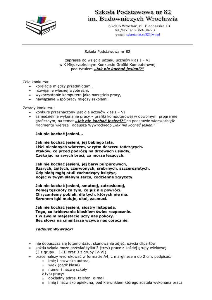 53-206 Wrocław, ul. Blacharska 13 tel./fax 071-363-34-23 e-mail [email protected] Szkoła Podstawowa nr 82 zaprasza do wzięcia udziału uczniów klas I – VI w X Międzyszkolnym Konkursie Grafiki Komputerowej pod tytułem „Jak nie kochać jesieni?” Cele konkursu: korelacja między przedmiotami, rozwijanie własnej wyobraźni, wykorzystanie komputera jako narzędzia pracy, nawiązanie współpracy między szkołami. Zasady konkursu: konkurs przeznaczony jest dla uczniów klas I – VI samodzielnie wykonanie pracy – grafiki komputerowej w dowolnym programie graficznym, na temat „Jak nie kochać jesieni?” na podstawie wiersza/bądź fragmentu wiersza Tadeusza Wywrockiego „Jak nie kochać jesieni” Jak nie kochać jesieni... Jak nie kochać jesieni, jej babiego lata, Liści niesionych wiatrem, w rytm deszczu tańczących. Ptaków, co przed podróżą na drzewach usiadły, Czekając na swych braci, za morze lecących. Jak nie kochać jesieni, jej barw purpurowych, Szarych, żółtych, czerwonych, srebrnych, szczerozłotych. Gdy białą mgłą otuli zachodzący księżyc, Kojąc w twym słabym sercu, codzienne zgryzoty. Jak nie kochać jesieni, smutnej, zatroskanej, Pełnej tęsknoty za tym, co już nie powróci. Chryzantemy pobieli, dla tych, których nie ma. Szronem łąki maluje, ukoi, zasmuci. Jak nie kochać jesieni, siostry listopada, Tego, co królowanie blaskiem świec rozpocznie. I w swoim majestacie uczy nas pokory. Bez słowa na cmentarze wzywa nas corocznie. Tadeusz Wywrocki nie dopuszcza się fotomontażu, skanowania zdjęć, użycia clipartów każda szkoła może przesłać tylko 3 (trzy) prace z każdej grupy wiekowej (3 z grupy I-III oraz 3 z grupy IV-VI) prace należy wydrukować w formacie A4, z marginesem do 2 cm, podpisać: o imię i nazwisko autora, o wiek (bądź klasa) o numer i nazwę szkoły z tyłu pracy: o dokładny adres, telefon, e-mail o imię i nazwisko opiekuna, pod kierunkiem którego została wykonana praca prace należy przesłać drogą elektroniczną w formacie JPG na adres: [email protected] oraz pocztą – wydruk prac (proszę usztywnić prace, zgniecione nie będą brane pod uwagę) na adres szkoły: Szkoła Podstawowa nr 82 im. Budowniczych Wrocławia ul. Blacharska 13 53-206 Wrocław termin nadsyłania prac: do dnia 21 listopada 2016r. rozstrzygnięcie konkursu nastąpi pod koniec listopada, a wyniki podane na stronie internetowej www.sp82.wroclaw.pl dla laureatów przewidziane są nagrody rzeczowe i dyplomy, a dla opiekunów – podziękowania wszystkie prace przechodzą na własność organizatorów, będą prezentowane na wystawie konkursowej laureaci poszczególnych szkół zostaną powiadomieni drogą e-mailową oraz telefonicznie. organizator: Małgorzata Knysz-Ryman Aleksandra Konopacka Dyrektor: