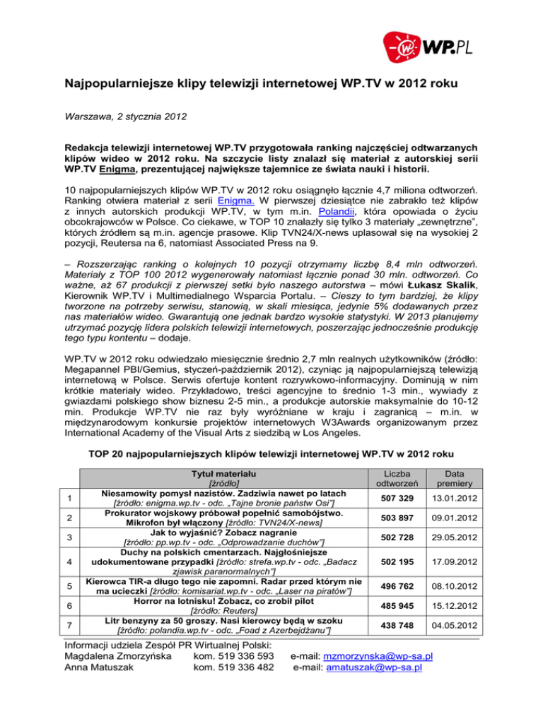Najpopularniejsze klipy telewizji internetowej WP.TV w 2012 roku Warszawa, 2 stycznia 2012 Redakcja telewizji internetowej WP.TV przygotowała ranking najczęściej odtwarzanych klipów wideo w 2012 roku. Na szczycie listy znalazł się materiał z autorskiej serii WP.TV Enigma, prezentującej największe tajemnice ze świata nauki i historii. 10 najpopularniejszych klipów WP.TV w 2012 roku osiągnęło łącznie 4,7 miliona odtworzeń. Ranking otwiera materiał z serii Enigma. W pierwszej dziesiątce nie zabrakło też klipów z innych autorskich produkcji WP.TV, w tym m.in. Polandii, która opowiada o życiu obcokrajowców w Polsce. Co ciekawe, w TOP 10 znalazły się tylko 3 materiały „zewnętrzne”, których źródłem są m.in. agencje prasowe. Klip TVN24/X-news uplasował się na wysokiej 2 pozycji, Reutersa na 6, natomiast Associated Press na 9. – Rozszerzając ranking o kolejnych 10 pozycji otrzymamy liczbę 8,4 mln odtworzeń. Materiały z TOP 100 2012 wygenerowały natomiast łącznie ponad 30 mln. odtworzeń. Co ważne, aż 67 produkcji z pierwszej setki było naszego autorstwa – mówi Łukasz Skalik, Kierownik WP.TV i Multimedialnego Wsparcia Portalu. – Cieszy to tym bardziej, że klipy tworzone na potrzeby serwisu, stanowią, w skali miesiąca, jedynie 5% dodawanych przez nas materiałów wideo. Gwarantują one jednak bardzo wysokie statystyki. W 2013 planujemy utrzymać pozycję lidera polskich telewizji internetowych, poszerzając jednocześnie produkcję tego typu kontentu – dodaje. WP.TV w 2012 roku odwiedzało miesięcznie średnio 2,7 mln realnych użytkowników (źródło: Megapannel PBI/Gemius, styczeń-październik 2012), czyniąc ją najpopularniejszą telewizją internetową w Polsce. Serwis ofertuje kontent rozrywkowo-informacyjny. Dominują w nim krótkie materiały wideo. Przykładowo, treści agencyjne to średnio 1-3 min., wywiady z gwiazdami polskiego show biznesu 2-5 min., a produkcje autorskie maksymalnie do 10-12 min. Produkcje WP.TV nie raz były wyróżniane w kraju i zagranicą – m.in. w międzynarodowym konkursie projektów internetowych W3Awards organizowanym przez International Academy of the Visual Arts z siedzibą w Los Angeles. TOP 20 najpopularniejszych klipów telewizji internetowej WP.TV w 2012 roku 1 2 3 4 5 6 7 Tytuł materiału [źródło] Niesamowity pomysł nazistów. Zadziwia nawet po latach [źródło: enigma.wp.tv - odc. „Tajne bronie państw Osi”] Prokurator wojskowy próbował popełnić samobójstwo. Mikrofon był włączony [źródło: TVN24/X-news] Jak to wyjaśnić? Zobacz nagranie [źródło: pp.wp.tv - odc. „Odprowadzanie duchów”] Duchy na polskich cmentarzach. Najgłośniejsze udokumentowane przypadki [źródło: strefa.wp.tv - odc. „Badacz zjawisk paranormalnych”] Kierowca TIR-a długo tego nie zapomni. Radar przed którym nie ma ucieczki [źródło: komisariat.wp.tv - odc. „Laser na piratów”] Horror na lotnisku! Zobacz, co zrobił pilot [źródło: Reuters] Litr benzyny za 50 groszy. Nasi kierowcy będą w szoku [źródło: polandia.wp.tv - odc. „Foad z Azerbejdżanu”] Informacji udziela Zespół PR Wirtualnej Polski: Magdalena Zmorzyńska kom. 519 336 593 Anna Matuszak kom. 519 336 482 Liczba odtworzeń Data premiery 507 329 13.01.2012 503 897 09.01.2012 502 728 29.05.2012 502 195 17.09.2012 496 762 08.10.2012 485 945 15.12.2012 438 748 04.05.2012 e-mail: [email protected] e-mail: [email protected] 8 9 10 11 12 13 14 15 16 17 18 19 20 Wielka manipulacja! Jola Rutowicz ujawnia kulisy realizacji Big Brothera [źródło: strefa.wp.tv - odc. „Tajemnica Joli Rutowicz”] Wpadka na ślubie! Ten film podbija Internet [źródło: Associated Press] Polka nie mogła uwierzyć. Przygoda Anglika w sopockiej przebieralni [źródło: polandia.wp.tv – odc. „Tim z Anglii”] Reakcja Waśniewskiego na zniknięcie żony [źródło: TVN24/X-news] Matka Madzi przyznaje się przed kamerą [źródło: Biuro detektywistyczne Krzysztofa Rutkowskiego] Przerażająca choroba przywieziona do Polski. To żyje w ludzkim ciele [źródło: konrtowersje.wp.tv – odc. „Choroby tropikalne”] To przybiera na sile. Zapowiedź końca świata? [źródło: pp.wp.tv – odc. „Tajemnicze dźwięki”] Niesmaczny żart o Polakach w Niemczech [źródło: polandia.wp.tv – odc. „Lena z Niemiec”] Zadziwiająca sytuacja w „Jaka to melodia?”. Tego kamery nie pokazały! [źródło: celebryci.wp.tv – odc. „Robert Janowski o wpadkach”] Chciał się przespać z Torbicką po wywiadzie [źródło: tsn.wp.tv, odc. „Grażyna Torbicka o nietypowych sytuacjach”] Wyłowili z wody 7-tonowego olbrzyma [źródło: Associated Press] Piękna Norweżka zignorowała rady. Zaimprezowała z Polakami [źródło: polandia.wp.tv, odc. „Nana z Norwegii”] „To jest obrzydliwe” – Rosjanka szczerze o Polkach [polandia.wp.tv, odc. „Lena z Rosji”] 426 882 28.06.2012 426 048 27.06.2012 406 431 29.06.2012 423 771 04.04.2012 406 330 03.02.2012 401 339 07.08.2012 374 141 10.04.2012 370 407 30.03.2012 360 407 02.09.2012 355 497 08.11.2012 351 549 09.02.2012 341 552 03.12.2012 340 374 30.03.2012 źródło: badania logów serwera multimedialnego WP.PL w okresie 01.01.2012-31.12.2012 W pomiarach uwzględniono również materiały WP.TV osadzane w innych serwisach portalu WP.PL (m.in. odkrywcy.pl, wiadomosci.wp.pl, bloog.pl), z wyłączeniem emisji w zewnętrznych kanałach dystrybucji kontentu, jak telewizory z dostępem do internetu czy aplikacje mobilne. Materiały agencji prasowych, z uwagi na licencje, muszą być usuwane z bazy serwisu po upływie 21 dni, dlatego niektóre pozycje zestawione w powyższych rankingach nie są obecnie dostępne w bazie serwisu WP.TV. Informacji udziela Zespół PR Wirtualnej Polski: Magdalena Zmorzyńska kom. 519 336 593 Anna Matuszak kom. 519 336 482 e-mail: [email protected] e-mail: [email protected]