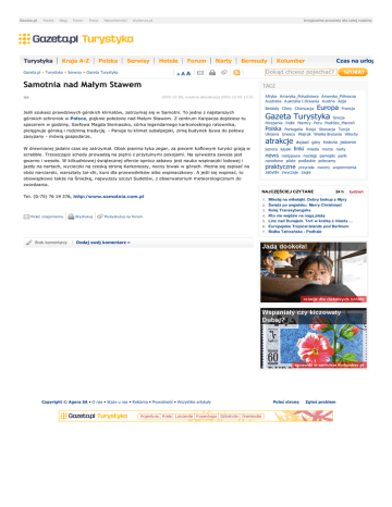 Gazeta.pl Poczta Turystyka Gazeta.pl Blogi Forum Praca Kraje A-Z Turystyka Serwisy Nieruchomości Polska Wyborcza.pl Serwisy Gazeta Turystyka Oryginalne prezenty dla całej rodziny Hotele A Forum Narty Bermudy AA Kolumber Czas na urlop Dokąd chcesz pojechać? Samotnia nad Małym Stawem aa 2003-12-06, ostatnia aktualizacja 2003-12-05 13:51 Afryka Ameryka_Południowa Ameryka_Północna Australia Australia I Oceania Austria Azja Beskidy Chiny Chorwacja Jeśli szukasz prawdziwych górskich klimatów, zatrzymaj się w Samotni. To jedno z najstarszych górskich schronisk w Polsce, pięknie połoŜone nad Małym Stawem. Z centrum Karpacza dojdziesz tu spacerem w godzinę. Szefowa Magda Siemaszko, córka legendarnego karkonoskiego ratownika, pielęgnuje górską i rodzinną tradycję. - Panuje tu klimat subalpejski, zimą budynek bywa do połowy zasypany - mówią gospodarze. Europa Francja Gazeta Turystyka Grecja Hiszpania Indie Niemcy Peru PodróŜe_Marzeń Polska Portugalia Rosja Słowacja Turcja Ukraina Unesco Wajrak Wielka Brytania Włochy atrakcje W drewnianej jadalni czas się zatrzymał. Obok pianina tyka zegar, za piecem kaflowym turyści grają w jeziora kajaki scrabble. Trzeszczące schody prowadzą na piętro z przytulnymi pokojami. Na sylwestra zawsze jest news dojazd góry historia jedzenie linki miasta morze narty gwarno i wesoło. W kilkudniowej świątecznej ofercie oprócz zabawy jest nauka wspinaczki lodowej i nietypowe noclegi pamiątki parki narodowe plaŜe podlaskie polecamy jazdy na nartach, wycieczki na czeską stronę Karkonoszy, nocny biwak w górach. MoŜna się zapisać na praktyczne obóz narciarski, warsztaty tai-chi, kurs dla przewodników albo wspinaczkowy. A jeśli się wspinać, to zabytki zwyczaje Ŝagle przyroda rowery wspomnienia obowiązkowo takŜe na ŚnieŜkę, najwyŜszy szczyt Sudetów, z obserwatorium meteorologicznym do zwiedzania. NAJCZĘŚCIEJ CZYTANE Tel. (0-75) 76 19 376, http:/www.samotnia.com.pl 1. 2. 3. Poleć znajomemu Wydrukuj Podyskutuj na forum 4. 5. 6. 7. Brak komentarzy Dodaj swój komentarz » Copyright © Agora SA • O nas • StaŜe u nas • Reklama • Prywatność • Wszystkie artykuły 24 h tydzień Mikołaj na mikołajki. Dobry biskup z Myry Święta po angielsku. Merry Christmas! Kolej Transsyberyjska Kto nie wejdzie na nagą plaŜę Linz nad Dunajem. Tort w kratkę z miasta ... Europejskie Tropical Islands pod Berlinem Białka Tatrzańska - Podhale Poleć stronę | Zgłoś problem