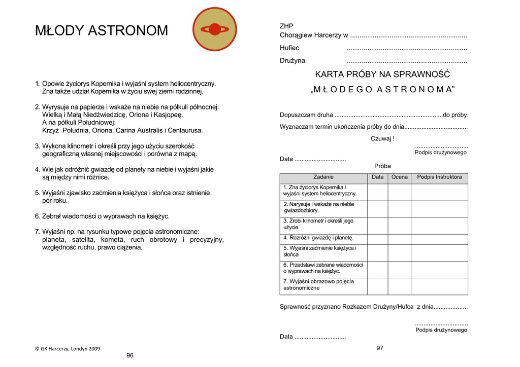 MŁODY ASTRONOM ZHP Chorągiew Harcerzy w .............................................................. Hufiec ................................................................ Drużyna ................................................................ KARTA PRÓBY NA SPRAWNOŚĆ 1. Opowie życiorys Kopernika i wyjaśni system heliocentryczny. Zna także udział Kopernika w życiu swej ziemi rodzinnej. 2. Wyrysuje na papierze i wskaże na niebie na półkuli północnej: Wielką i Małą Niedźwiedzicę, Oriona i Kasjopeę. A na półkuli Południowej: Krzyż Południa, Oriona, Carina Australis i Centaurusa. „M Ł O D E G O A S T R O N O M A” Dopuszczam druha ...............................................................do próby. Wyznaczam termin ukończenia próby do dnia..................................... Czuwaj ! 3. Wykona klinometr i określi przy jego użyciu szerokość geograficzną własnej miejscowości i porówna z mapą. 4. Wie jak odróżnić gwiazdę od planety na niebie i wyjaśni jakie są między nimi różnice. 5. Wyjaśni zjawisko zaćmienia księżyca i słońca oraz istnienie pór roku. 6. Zebrał wiadomości o wyprawach na księżyc. 7. Wyjaśni np. na rysunku typowe pojęcia astronomiczne: planeta, satelita, kometa, ruch obrotowy i precyzyjny, względność ruchu, prawo ciążenia. ............................... Podpis drużynowego Data .............................. Próba Zadanie Data Ocena Podpis Instruktora 1. Zna życiorys Kopernika i wyjaśni system heliocentryczny. 2. Narysuje i wskaże na niebie gwiazdozbiory. 3. Zrobi klinometr i określi jego użycie. 4. Rozróżni gwiazdę i planetę. 5. Wyjaśni zaćmienie księżyca i słońca 6. Przedstawi zebrane wiadomości o wyprawach na księżyc. 7. Wyjaśni obrazowo pojęcia astronomiczne Sprawność przyznano Rozkazem Drużyny/Hufca z dnia.................... ............................... Podpis drużynowego Data .............................. © GK Harcerzy, Londyn 2009 97 96