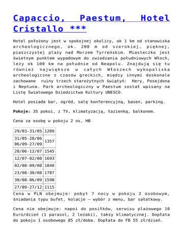 Capaccio, Paestum, Cristallo *** Hotel Hotel położony jest w spokojnej okolicy, ok 1 km od stanowiska archeologicznego, ok. 200 m od szerokiej, pięknej, piaszczystej plaży nad Morzem Tyrreńskim. Miasteczko jest świetnym punktem wypadowym do zwiedzania południowych Włoch, leży ok 100 km na południe od Neapolu. Znajdują się tu również największe w całych Włoszech wykopaliska archeologiczne z czasów greckich, między innymi doskonale zachowane ruiny trzech starożytnych świątyń: Hery, Posejdona i Neptuna. Park archeologiczny w Paestum został wpisany na Listę Światowego Dziedzictwa Kultury UNESCO. Hotel posiada bar, ogród, salę konferencyjną, basen, parking. Pokoje: 35 pokoi, z TV, klimatyzacją, łazienką, balkonem. Cena za osobę w pokoju 2 os, HB 29/03-31/05 1209 31/05-28/06 1357 06/09-27/09 28/06-12/07 1545 12/07-02/08 1693 02/08-09/08 1840 23/08-30/08 1787 30/08-06/09 1598 27/09-27/12 1115 Cena w PLN obejmuje: pobyt 7 nocy w pokoju 2 osobowym, śniadania typu bufet, kolacje – wybór z menu, bar sałatkowy. Cena nie obejmuje: napoi do posiłków, serwisu plażowego 10 Euro/dzień (1 parasol, 2 leżaki), taksy klimatycznej. Dopłata do pokoju 1 osobowego 85 zł/doba. Dopłata do FB 55 zł/dzień. Uwaga: przyjazd i wyjazd: sobota. Minori, Romana**** Hotel Willa Niedawno odnowiony, elegancki i komfortowy hotel, położony w niezwykle malowniczym miasteczku Minori, na Wybrzeżu Amalfitańskim. Region ten wpisany jest na Listę Światowego Dziedzictwa UNESCO. Hotel oddalony jest od plaży ok 150 m, do dyspozycji gości: recepcja, bar, restauracja, basen, sala konferencyjna. Pokoje: Tv sat, mini bar, klimatyzacja, ogrzewanie, suszarka do włosów, sejf. 01/04 – 01/06 01/06 – 01/08 – 01/10 – 01/08 01/10 2900 3385 31/10 Osoba w pokoju 2 osobowym, HB 2660 Cena w PLN obejmuje: pobyt w pokoju, 7 nocy, śniadania typu bufet, kolacje-wybór z menu, bar sałatkowy i deserowy, klimatyzacja. Cena nie obejmuje: napoi do posiłków, taksy klimatycznej (płatnej na miejscu) Dopłata do pokoju 1 osobowego-147 zł/doba. Uwaga: Basen czynny od 01/05-31/10. Wyjazd i przyjazd: sobota. Paestum, Battipaglia, Hotel Club Sabbiadoro**** Hotel położony jest przy plaży, w lesie piniowym, tuż obok wspaniałego Parku Narodowego del Cilento, ok 50 km od Salerno, skąd zaczyna się 70 km słynne Wybrzeże Amalfitańskie Costiera Amalfitana. W Paestum znajduje się również Narodowe Muzeum Archeologiczne. Do dyspozycji gości: recepcja, duży hal, bar, restauracja, wypożyczalnia rowerów (w pobliżu 20 km trasa rowerowa), basen, piano bar, duży ogród z placem zabaw, parking, mini club. Pokoje: z łazienką, TV, suszarką do włosów, mini bar, klimatyzacją. Niektóre pokoje z balkonami. Cena za osobę w pokoju 2 os, HB 03/05-31/05 31/05-28/06 28/06-26/07 26/07-23/08 23/08-06/09 06/09-04/10 1545 1690 2025 2510 1790 Cena w PLN obejmuje: 7 noclegów w pokoju 2 osobowym, śniadania typu bufet, obiadokolacje-wybór z menu, bufet sałatkowy, woda do posiłków, parking, klimatyzacja (w terminie 03/06-19/09). Cena nie obejmuje: napoi do posiłków, taksę klimatyczną. Obowiązkową kartę CLUB 15 Euro/osoba/tydzień, w terminie od 01/06-30/09 która obejmuje: gimnastykę, basen z whirpool, brodzik dla dzieci, tenis stołowy, serwis plażowy (1 parasol, 1 leżak na pokój) 1 dancing w tygodniu, piano bar, mini club dla dzieci 4-10 lat. Positano, Costiera Amalfitana, Hotel Domina Home Royal**** Positano jest chyba najbardziej malowniczym miasteczkiem na wybrzeżu Amalfi. Hotel położony jest w cudownej okolicy, z panoramicznym widokiem na okoliczne wzgórza oraz na turkusowe wody Zatoki Salerno. Plaża jest oddalona ok 1,5 km. Lotnisko w Neapolu, ok 65 km. Do dyspozycji gości: basen z widokiem na zatokę, solarium, taras, bar z przekąskami, piano bar, restauracja, małe centrum SPA, Wi Fi w lobby, korty tenisowe i boisko do piłki nożnej z oświetleniem. Na życzenie pralnia, łóżeczko dla dziecka, parking. Sala konferencyjna dla maksymalnie 50 osób. Pokoje: 77 pokoi, z łazienkami, klimatyzacją, mini barem, sejfem, TV, większość pokoi posiada balkon i widok na morze Cena za osobę w pokoju 2 os, HB 22/03-18/04 18/04-04/05 04/05-07/06 07/06-14/06 27/09-17/10 06/09-13/09 20/09-27/09 13/09-20/09 1835 3890 2318 2897 14/06-28/06 28/06-02/08 02/08-30/08 3327 4277 4985 Cena w PLN obejmuje: 7 noclegów w standardowym pokoju, śniadania typu bufet, kolacje – wybór z menu i bufet sałatkowy. Cena nie obejmuje: taksy klimatycznej, płatnej na miejscu. Dopłata do pokoju z widokiem panoramicznym 54 zł/doba. Parking (na zapytanie) 20 Euro/dzień. Positano, Villa Giusy (8 os) Luksusowa willa położona w centrum Positano, na wybrzeżu Amalfi, z zapierającym dech w piersiach widokiem na zatokę. Willa może pomieścić maksymalnie 8 osób. Na miejscu Wi Fi, taras z widokiem na morze, meble ogrodowe. Pokoje są stylowo i elegancko urządzone, położne na dwóch piętrach. Posiadają telewizory z płaskim ekranem, klimatyzację, ogrzewanie. Prawie wszystkie pokoje mają widok na morze. Przestronna, w pełni wyposażona kuchnia. Jadalnia z kominkiem. Struktura: dwa pokoje z dwoma pojedynczymi łózkami, dwie sypialnie dwuosobowe, oraz pokój jednoosobowy. Willa może być wynajmowana w całości lub dla 2 osób i 6 osób. La Suite: duże, podwójne łóżko, łazienka z wanną i prysznicem, pokój dzienny, telewizor z płaskim ekranem, prywatne wejście do willi. Piękny widok na morze i miasto. Rockery: sypialnia z podwójnym łóżkiem, łazienka z prysznicem, widok na miasto. Bouganville: dwa pojedyncze łóżka, które można połączyć, kominek, łazienka z prysznicem, nieduży taras ze stolikiem, krzesłami, widokiem na morze. Blue Sea’ & ‚La Cupola: dwa pojedyncze łóżka, które można połączyć, łazienka z prysznicem, szafa, komoda, piękny widok na morze. 22/12-06/01 11/03-30/04 01/07-31/08 07/01-10/03 01/05-30/06 01/10-31/10 Wielkanoc 44500 34500 39500 44000 Cena w