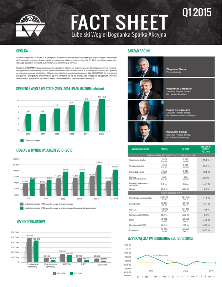 Q1 2015 FACT SHEET Lubelski Węgiel Bogdanka Spółka Akcyjna SPÓŁKA ZARZĄD SPÓŁKI Lubelski Węgiel BOGDANKA S.A. jest jedną z najnowocześniejszych i największych kopalń węgla kamiennego w Polsce oraz krajowym liderem rynku producentów węgla energetycznego. W Q1 2014 produkcja węgla handlowego Bogdanki wyniosła: 2,2 mln ton, a w Q1 2015 2,0 mln ton. Kopalnia BOGDANKA zaopatruje przede wszystkim odbiorców przemysłowych, zlokalizowanych we wschodniej i północno-wschodniej Polsce. Rynek odbiorców jest ustabilizowany, a sprzedaż realizowana jest głównie w oparciu o umowy wieloletnie. Główne kierunki zbytu węgla handlowego z LW BOGDANKA to energetyka zawodowa i energetyka przemysłowa. Spółka wyróżnia się na tle branży pod względem osiąganych wyników finansowych, wydajności wydobycia węgla kamiennego oraz realizowanych inwestycji. Zbigniew Stopa Prezes Zarządu SPRZEDAŻ WĘGLA W LATACH 2010 - 2014 I PLAN NA 2015 (mln ton) Waldemar Bernaciak Zastępca Prezesa Zarządu ds. Handlu i Logistyki 9,3 - 9,5 9,2 10 8,4 7,8 8 6 Roger de Bazelaire 5,8 5,8 2010 2011 Zastępca Prezesa Zarządu ds. Ekonomiczno-Finansowych 4 2 0 2012 2013 2014 Krzysztof Szlaga 2015 Zastępca Prezesa Zarządu ds. Zakupów i Inwestycji Sprzedaż węgla WYSZCZEGÓLNIENIE UDZIAŁ W RYNKU W LATACH 2010 - 2015 Q1 2015 ZMIANA % Q1 2015 /Q1 2014 Q1 2014 PARAMETRY TECHNICZNO - OPERACYJNE 30,0% 24,9% 25,0% 20,9% 15,0% 10,0% 13,7% 13,9% 10,4% 14,2% 14,3% 9,9% 5,0% -11,0 % tys. ton 2 238 -11,1 % tys. ton 2 225 - 12,5 % tys. ton 229 52,8 % 5,2 km 9,3 km - 44,1 % 66,6 % 66,9 % - 0,4 % tys. ton Sprzedaż węgla tys.ton Zapasy (na koniec okresu) tys. ton Długość wykonanych wyrobisk Uzysk 1 990 1 946 350 DANE FINANSOWE 0,0% 2010 2011 2012 2013 Q1 2015 2014 Udział sprzedaży LWB w rynku węgla energetycznego Udział sprzedaży LWB w rynku węgla energetycznego do energetyki zawodowej WYNIKI FINANSOWE 600 000 500 000 3 343 Produkcja netto 16,6% 14,8% tys. ton tys. ton 19,3% 19,8% 20,0% 2 974 Wydobycie brutto 481 540 Przychody ze sprzedaży 428 279 481 540 tys. zł - 11,1 % Zysk brutto 46 454 85 105 tys. zł - 45,4 % EBITDA 144 395 174 149 - 17,1 % Rentowność EBITDA 33,7 % 36,2 % - 6,9 % EBIT 48 152 85 958 tys. zł - 44,0 % Rentowność EBIT 11,2 % 17,9 % - 37,4 % Zysk netto 32 690 62 600 - 47,8 % tys. zł tys. zł tys. zł tys. zł tys. zł tys. zł tys. zł UZYSK WĘGLA LW BOGDANKA S.A. (2013-2015) 428 279 400 000 76,0 % 300 000 74,0 % 174 149 200 000 0 72,0 % 144 395 85 958 85 105 100 000 46 454 Przychody ze sprzedaży Zysk brutto ze sprzedaży 48 152 EBITDA EBIT 62 600 32 690 Zysk netto uzysk kwartalny 70,0 % 68,0 % średnia roczna 66,0 % 64,0 % Q1 2014 Q1 2015 2013 62,0 % 60,0 % Q1 Q2 2015 2014 Q3 Q4 Q1 Q2 Q3 Q4 Q1 Q1 2015 FACT SHEET Lubelski Węgiel Bogdanka Spółka Akcyjna STRUKTURA SPRZEDAŻY WYSZCZEGÓLNIENIE POLITYKA DYWIDENDOWA Zarząd analizuje politykę dywidendową na kolejne lata biorąc pod uwagę lokalne i globalne trendy oraz warunki cenowe. Spółka jako kluczowe traktuje zabezpieczenie płynności i stabilności finansowej. Polityka dywidendowa na kolejne lata zostanie przyjęta i ogłoszona do 30 czerwca 2015 roku wraz ze Strategią działalności na lata 2015-2020. Q1 2015 UDZIAŁ Q1 2014 UDZIAŁ 406 613 tys. zł 94,9 % 456 944 tys. zł 94,9 % 318 tys. zł 0,1 % 1 493 tys. zł 0,3 % Pozostała działalność 18 973 tys. zł 4,4 % 20 565 tys. zł 4,3 % Sprzedaż towarów i materiałów 2 375 tys. zł 0,6 % 2 538 tys. zł 0,5 % PRODUKCJA WĘGLA Razem przychody ze sprzedaży 428 279 tys. zł 100,0 % 481 540 tys. zł 100,0 % Podwojenie zdolności produkcyjnych i utrzymanie stabilnej pozycji głównego dostawcy węgla dla energetyki zawodowej Sprzedaż węgla Sprzedaż ceramiki Zarząd na 2015 r. rekomenduje wypłatę dywidendy w wysokości 3 zł na akcję tj. 37,5% skonsolidowanego zysku netto za 2014 r. (102 mln zł). STRATEGIA Głównymi założeniami Strategii na lata 2013 – 2020 są: LUBELSKI WĘGIEL BOGDANKA S.A. NA GIEŁDZIE PAPIERÓW WARTOŚCIOWYCH ZASOBY 2x2 Podwojenie zasobów operatywnych LW Bogdanka S.A. i przedłużenie żywotności kopalni do ok. 2050 r. • Otrzymanie przez Spółkę: - koncesji na wydobycie w obszarze „K-3” - w dniu 17.06.2014 r. INDEKSY: • WIG - Surowce • WIG20 • WIG30 • Respect Index - koncesji na rozpoznanie złoża „Ostrów” - w dniu 30.06.2014 r. - koncesji na rozpoznanie złoża „Orzechów” - w dniu 14.10.2014 r. • Plan zwiększenia zasobów operatywnych od ok. 237 mln ton do ok. 450 mln ton; • Plan przedłużenia żywotności kopalni do ok. 2050 r. (obecnie 2034 r.) przy średnim rocznym poziomie produkcji netto ok. 12 mln ton węgla. 15,16% Aviva Otwarty Fundusz Emerytalny Aviva BZ WBK 9,76% Otwarty Fundusz Emerytalny PZU „Złota Jesień” 9,63% ING Otwarty Fundusz Emerytalny W związku z istotną zmianą sytuacji rynkowej, od czasu publikacji Strategii na lata 2013 – 2020, Zarząd Spółki pracuje nad założeniami do jej aktualizacji. Aktualizacja Strategii zostanie ogłoszona do dnia 30 czerwca 2015 r. 65,45% Zdolności produkcyjne LW Bogdanka S.A. Pozostali 14 x2 12 * Stan na dzień 30 kwietnia 2015 r., zgodnie z zawiadomieniami otrzymywanymi od akcjonariuszy. 10 7,8 8 6 KURS AKCJI W OKRESIE 22.07.2009 r. - 31.03.2015 r. (zł) 8,4 10,5- 11,5 9,2 5,8 4 2 143 140 120 0 2011 2012 Produkcja netto - baza 2011 2013 2014 2015 Skumulowany przyrost produkcji netto 100 80 60 CENA EMISYJNA 47,00 PLN 40 20 0 2009 2010 2011 2012 2013 2014 KONTAKT Dział Relacji Inwestorskich i Informacji Giełdowych Paweł BIELSKI Magdalena SZEWCZYK Paweł KRASZEWSKI + 48 81 462 55 44 + 48 81 462 55 44 + 48 81 462 50 29 [email protected] [email protected] [email protected] [email protected] [email protected] [email protected] 2015 ZASTRZEŻENIA Niniejszy materiał informacyjny został opracowany przez LW BOGDANKA S.A. („Spółka”). Informacje zawarte w materiale zebrano i przygotowano z dochowaniem należytej staranności, w oparciu o