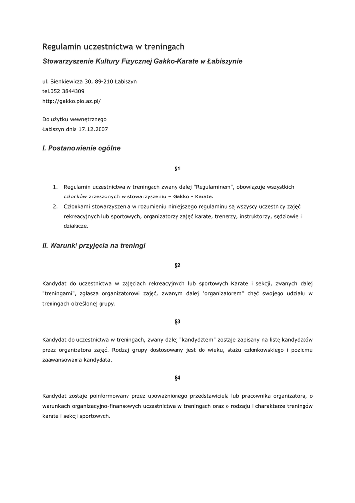 Regulamin uczestnictwa w treningach Stowarzyszenie Kultury Fizycznej Gakko-Karate w Łabiszynie ul. Sienkiewicza 30, 89-210 Łabiszyn tel.052 3844309 http://gakko.pio.az.pl/ Do użytku wewnętrznego Łabiszyn dnia 17.12.2007 I. Postanowienie ogólne §1 1. Regulamin uczestnictwa w treningach zwany dalej "Regulaminem", obowiązuje wszystkich członków zrzeszonych w stowarzyszeniu – Gakko - Karate. 2. Członkami stowarzyszenia w rozumieniu niniejszego regulaminu są wszyscy uczestnicy zajęć rekreacyjnych lub sportowych, organizatorzy zajęć karate, trenerzy, instruktorzy, sędziowie i działacze. II. Warunki przyjęcia na treningi §2 Kandydat do uczestnictwa w zajęciach rekreacyjnych lub sportowych Karate i sekcji, zwanych dalej "treningami", zgłasza organizatorowi zajęć, zwanym dalej "organizatorem" chęć swojego udziału w treningach określonej grupy. §3 Kandydat do uczestnictwa w treningach, zwany dalej "kandydatem" zostaje zapisany na listę kandydatów przez organizatora zajęć. Rodzaj grupy dostosowany jest do wieku, stażu członkowskiego i poziomu zaawansowania kandydata. §4 Kandydat zostaje poinformowany przez upoważnionego przedstawiciela lub pracownika organizatora, o warunkach organizacyjno-finansowych uczestnictwa w treningach oraz o rodzaju i charakterze treningów karate i sekcji sportowych. §5 Na pierwszych zajęciach organizacyjno-informacyjnych, kandydat zostaje poinformowany przez prowadzącego szkolenie zwanego dalej "trenerem lub instruktorem" o treści regulaminu, o organizacji zajęć, oraz o prawach i obowiązkach uczestnika treningów. Zostaje szczegółowo zapoznany z obowiązującymi regułami i zasadami organizacyjnymi, szkoleniowymi i dyscyplinarnymi, obowiązującymi na treningach karate i sekcji oraz o przysługujących mu prawach i obowiązkach określonych w statucie, regulaminach i zarządzeniach stowarzyszenia. Otrzymuje do wypełnienia deklarację członkowska stowarzyszenia. 1. Statut, regulaminy i zarządzenia Stowarzyszenia są dostępne dla wszystkich zainteresowanych u instruktora prowadzącego treningi i na stronie WWW stowarzyszenia http://gakko.pio.az.pl/ . §6 Kandydat składa deklaracje członkowską Stowarzyszenia, zwaną dalej "deklaracją" u trenera lub instruktora prowadzącego treningi. 1. Deklaracja musi być dokładnie i czytelnie wypełniona i podpisana przez kandydata. 2. W przypadku kiedy kandydat jest niepełnoletni, deklarację musi podpisać jeden z rodziców lub opiekun prawny kandydata. 3. Do deklaracji musi być dołączone aktualne zaświadczenie lekarskie potwierdzający dobry stan zdrowia kandydata i dopuszczające go do udziału w rekreacyjnych zajęciach karate lub sekcji sportowych. 4. Kandydat wpłaca za pośrednictwem organizatora (trener lub instruktor), miesięczną składkę członkowską, określoną przez Zarząd Stowarzyszenia. 5. Kandydat do udziału w treningach grup zaawansowanych i wyczynowych karate lub sekcji sportowych, zamiast zaświadczenia lekarskiego dołącza kartę zdrowia sportowca, potwierdzającego jego dobry stan zdrowia i dopuszczenie do treningów specjalistycznych oraz zwodów sportowych. 6. Uczestnik treningów grup zaawansowanych i wyczynowych, zobowiązany jest do udziału w okresowych badaniach lekarskich i uaktualniania karty zdrowia sportowca, zgodnie z obowiązującymi przepisami. 7. W uzasadnionych przypadkach, Zarząd Stowarzyszenia na pisemny wniosek może zwolnić kandydata z obowiązku uiszczenia składki członkowskiej w danym roku szkoleniowym. §7 Kandydat po uzyskaniu członkostwa Klubu, zostaje dopuszczony przez organizatora do uczestnictwa w treningach po spełnieniu wymagań określonych w paragrafach §3, §4, §5, §6, oraz §9 lub §10 Regulaminu. §8 III. Strój treningowy i ochraniacze §9 Uczestnik treningów grup początkujących, zobowiązany jest do posiadania czystego i schludnego sportowego stroju (spodnie dresowe, podkoszulek bawełniany lub karate-gi), klapek, ręcznika i osobistych środków czystości. §10 Uczestnik treningów grup średnio zaawansowanych, zaawansowanych lub wyczynowych zobowiązany jest do posiadania czystego i kompletnego stroju do ćwiczeń - karate-gi, klapek, ręcznika i osobistych środków czystości. §11 1. 2. Na karate-gi mogą być naszyte tylko dwa emblematy: a. znak graficzny karate Shotokan, b. logo Gakko - Karate. Wszelkie inne znaki są niedozwolone. §12 1. Pas do karate-gi wolno nosić tylko zgodny z nadanym stopniem. 2. Oficjalny wykaz stopni i pasów oraz wymagania szkoleniowo - egzaminacyjne, znajdują się na stronie internetowej http://gakko.pio.az.pl/ i komisja karate Shotokan. §13 Noszenie na treningu biżuterii i ozdób jest surowo wzbronione. §14 Uczestnik treningów na grupach średnio zaawansowanych, zaawansowanych lub wyczynowych jest zobowiązany do zaopatrzenia się w komplet osobistych ochraniaczy oraz ich posiadania i używania w czasie treningów. §15 W skład obowiązkowego kompletu osobistych ochraniaczy wchodzą: para napiętników lub rękawice do sportów walki, wkładka na zęby. IV. warunki udziału w ćwiczeniach z partnerem i walce sparingowej §16 Uczestnik treningów grup musi być świadomy ryzyka, wynikającego z brania udziału w ćwiczeniach z partnerem lub kontaktowych walkach sparingowych. Znać reguły, zasady i przepisy odnoszące się do tych ćwiczeń oraz walki sparingowej zwanej dalej "sparingiem" §17 Każdy uczestnik grup bierze dobrowolnie udział w ćwiczeniach z innym partnerem lub walkach sparingowych. §18 Każdy uczestnik zobowiązany jest do znajomości i przestrzegania zasad bezpieczeństwa, związanych z prowadzeniem ćwiczeń z partnerem. §19 W przypadku podjęcia decyzji przez uczestnika treningu grup, o udziale w ćwiczeniu z partnerem lub w sparingu, ponosi on pełne ryzyko odniesienia urazu (kontuzji) w przypadku naruszenia postanowień tego Regulaminu lub umyślnego, przypadkowego, normalnego, nienormalnego zastosowania danej techniki karate przez s