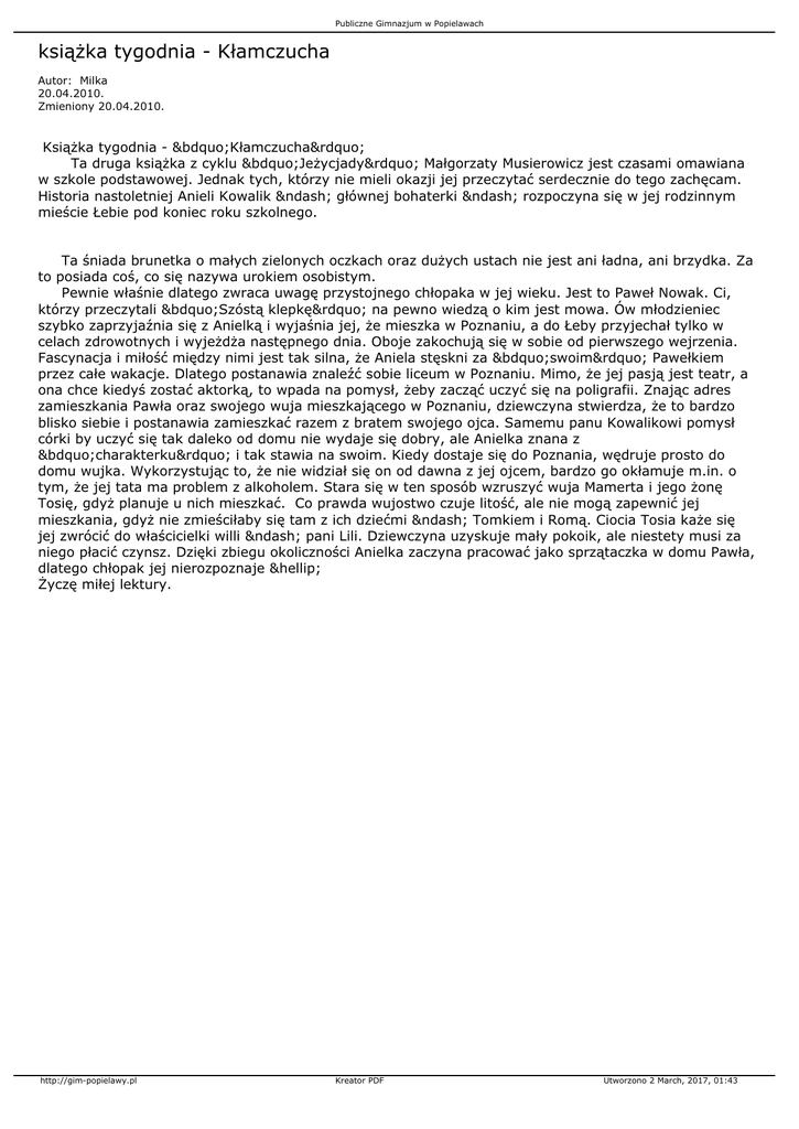 Publiczne Gimnazjum w Popielawach książka tygodnia - Kłamczucha Autor: Milka 20.04.2010. Zmieniony 20.04.2010. Książka tygodnia - „Kłamczucha” Ta druga książka z cyklu „Jeżycjady” Małgorzaty Musierowicz jest czasami omawiana w szkole podstawowej. Jednak tych, którzy nie mieli okazji jej przeczytać serdecznie do tego zachęcam. Historia nastoletniej Anieli Kowalik – głównej bohaterki – rozpoczyna się w jej rodzinnym mieście Łebie pod koniec roku szkolnego. Ta śniada brunetka o małych zielonych oczkach oraz dużych ustach nie jest ani ładna, ani brzydka. Za to posiada coś, co się nazywa urokiem osobistym. Pewnie właśnie dlatego zwraca uwagę przystojnego chłopaka w jej wieku. Jest to Paweł Nowak. Ci, którzy przeczytali „Szóstą klepkę” na pewno wiedzą o kim jest mowa. Ów młodzieniec szybko zaprzyjaźnia się z Anielką i wyjaśnia jej, że mieszka w Poznaniu, a do Łeby przyjechał tylko w celach zdrowotnych i wyjeżdża następnego dnia. Oboje zakochują się w sobie od pierwszego wejrzenia. Fascynacja i miłość między nimi jest tak silna, że Aniela stęskni za „swoim” Pawełkiem przez całe wakacje. Dlatego postanawia znaleźć sobie liceum w Poznaniu. Mimo, że jej pasją jest teatr, a ona chce kiedyś zostać aktorką, to wpada na pomysł, żeby zacząć uczyć się na poligrafii. Znając adres zamieszkania Pawła oraz swojego wuja mieszkającego w Poznaniu, dziewczyna stwierdza, że to bardzo blisko siebie i postanawia zamieszkać razem z bratem swojego ojca. Samemu panu Kowalikowi pomysł córki by uczyć się tak daleko od domu nie wydaje się dobry, ale Anielka znana z „charakterku” i tak stawia na swoim. Kiedy dostaje się do Poznania, wędruje prosto do domu wujka. Wykorzystując to, że nie widział się on od dawna z jej ojcem, bardzo go okłamuje m.in. o tym, że jej tata ma problem z alkoholem. Stara się w ten sposób wzruszyć wuja Mamerta i jego żonę Tosię, gdyż planuje u nich mieszkać. Co prawda wujostwo czuje litość, ale nie mogą zapewnić jej mieszkania, gdyż nie zmieściłaby się tam z ich dziećmi – Tomkiem i Romą. Ciocia Tosia każe się jej zwrócić do właścicielki willi – pani Lili. Dziewczyna uzyskuje mały pokoik, ale niestety musi za niego płacić czynsz. Dzięki zbiegu okoliczności Anielka zaczyna pracować jako sprzątaczka w domu Pawła, dlatego chłopak jej nierozpoznaje … Życzę miłej lektury. http://gim-popielawy.pl Kreator PDF Utworzono 2 March, 2017, 01:43