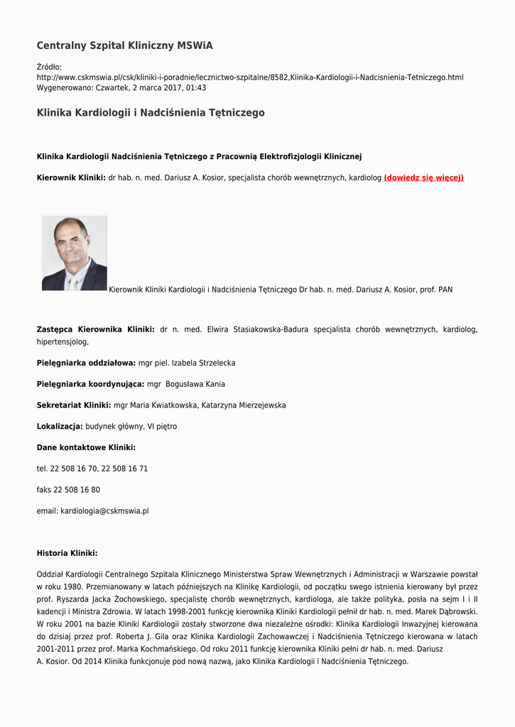 Centralny Szpital Kliniczny MSWiA Źródło: http://www.cskmswia.pl/csk/kliniki-i-poradnie/lecznictwo-szpitalne/8582,Klinika-Kardiologii-i-Nadcisnienia-Tetniczego.html Wygenerowano: Czwartek, 2 marca 2017, 01:43 Klinika Kardiologii i Nadciśnienia Tętniczego Klinika Kardiologii Nadciśnienia Tętniczego z Pracownią Elektrofizjologii Klinicznej Kierownik Kliniki: dr hab. n. med. Dariusz A. Kosior, specjalista chorób wewnętrznych, kardiolog (dowiedz się więcej) Kierownik Kliniki Kardiologii i Nadciśnienia Tętniczego Dr hab. n. med. Dariusz A. Kosior, prof. PAN Zastępca Kierownika Kliniki: dr n. med. Elwira Stasiakowska-Badura specjalista chorób wewnętrznych, kardiolog, hipertensjolog, Pielęgniarka oddziałowa: mgr piel. Izabela Strzelecka Pielęgniarka koordynująca: mgr Bogusława Kania Sekretariat Kliniki: mgr Maria Kwiatkowska, Katarzyna Mierzejewska Lokalizacja: budynek główny, VI piętro Dane kontaktowe Kliniki: tel. 22 508 16 70, 22 508 16 71 faks 22 508 16 80 email: [email protected] Historia Kliniki: Oddział Kardiologii Centralnego Szpitala Klinicznego Ministerstwa Spraw Wewnętrznych i Administracji w Warszawie powstał w roku 1980. Przemianowany w latach późniejszych na Klinikę Kardiologii, od początku swego istnienia kierowany był przez prof. Ryszarda Jacka Żochowskiego, specjalistę chorób wewnętrznych, kardiologa, ale także polityka, posła na sejm I i II kadencji i Ministra Zdrowia. W latach 1998-2001 funkcję kierownika Kliniki Kardiologii pełnił dr hab. n. med. Marek Dąbrowski. W roku 2001 na bazie Kliniki Kardiologii zostały stworzone dwa niezależne ośrodki: Klinika Kardiologii Inwazyjnej kierowana do dzisiaj przez prof. Roberta J. Gila oraz Klinika Kardiologii Zachowawczej i Nadciśnienia Tętniczego kierowana w latach 2001-2011 przez prof. Marka Kochmańskiego. Od roku 2011 funkcję kierownika Kliniki pełni dr hab. n. med. Dariusz A. Kosior. Od 2014 Klinika funkcjonuje pod nową nazwą, jako Klinika Kardiologii i Nadciśnienia Tętniczego. Informacje ogólne: Klinika Kardiologii i Nadciśnienia Tętniczego Centralnego Szpitala Klinicznego MSWiA w Warszawie prowadzi działalność leczniczą, naukową i dydaktyczną w zakresie chorób wewnętrznych, kardiologii i hipertensjologii. Ośrodek dysponuje 30 łóżkowym Oddziałem Kardiologii Ogólnej i Pododdziałem Nadciśnienia Tętniczego oraz 6 łóżkową monitorowaną Salą Intensywnego Nadzoru Kardiologicznego. W skład Kliniki wchodzi ponadto Pracownia Elektrofizjologii Klinicznej, Pracownia Diagnostyki Nieinwazyjnej oraz poradnie specjalistyczne, w tym Poradnię Kardiologiczną, Poradnię Nadciśnienia Tętniczego, Poradnię Zaburzeń Rytmu Serca, Punkt Kontroli Urządzeń Wszczepialnych. W naszym Ośrodku prowadzona jest diagnostyka i leczenie większości chorób układu krążenia. Klinika specjalizuje się w szerokiej nieinwazyjnej diagnostyce i leczeniu choroby niedokrwiennej serca, niewydolności serca, wad zastawkowych, infekcyjnego zapalenia wsierdzia, zatorowości płucnej, nadciśnienia tętniczego ze szczególnym uwzględnieniem postaci opornych i wtórnych oraz diagnostyki, jak również zaburzeń rytmu i przewodzenia. W Pracowni Elektrofizjologii Klinicznej przeprowadzane są zabiegi implantacji układów stymulujących serce, układów resynchronizujących(CRT-P i CRT-D) oraz kardiowerterów-defibrylatorów (ICD-VR i ICD-DR), a także ablacje RF i krioablacje podłoża arytmii. W naszej Klinice, jako jednym z nielicznych Ośrodków w Polsce wykonywane są usuwania elektrod endokawitarnych i układów stymulujących serce. W ramach Kliniki funkcjonuje Ośrodek Diagnostyki i Leczenia Zaburzeń Oddychania Podczas Snu prowadzący diagnostykę bezdechu sennego oraz kwalifikację i próbę leczenia przy pomocy CPAP. Klinika Kardiologii i Nadciśnienia Tętniczego prowadzi ścisłą współpracę z Kliniką Onkologii i Hematologii CSK MSWiA, w ramach której prowadzona jest kwalifikacja oraz ocena powikłań kardiologicznych leczenia przeciwnowotworowego celem zapewnienia optymalnej i bezpiecznej terapii onkologicznej. Klinika, jako integralna część „Heart Team”, współpracuje z Kliniką Kardiologii Inwazyjnej i Kliniką Kardiochirurgii CSK MSWiA w ramach nowoczesnego leczenia choroby wieńcowej, zaburzeń rytmu oraz zastawkowych i wrodzonych wad serca. Działalność dydaktyczna Kliniki obejmuje szkolenie personelu medycznego, lekarzy i pielęgniarek, zdobywanie oraz podnoszenie kwalifikacji zawodowych w zakresie chorób wewnętrznych i kardiologii. Jako jeden z nielicznych ośrodków w kraju Klinika ma uprawnienia do specjalizowania lekarzy w dziedzinie hipertensjologii. W Klinice odbywają się liczne kursy i szkolenia kadry medycznej w zakresie nieinwazyjnych metod diagnostycznych układu krążenia. W ramach działalności dydaktycznej Kliniki prowadzone są warsztaty echokardiograficzne, kursy specjalizacyjne w zakresie hipertensjologii oraz programy edukacyjne dla pacjentów z zakresu prewencji chorób układu sercowo-naczyniowego oraz zasad skutecznego i bezpiecznego stosowania doustnych antykoagulantów w warunkach ambulatoryjnych. Od 2013 roku w Klinice funkcjonuje Studenckie Koło Naukowe afiliowane prze Warszawski Uniwersytet Medyczny i Studenckie Towarzystwo Naukowe. Planowe hospitalizacje: Lokalizacja: pawilon główny, I piętro, gabinet 209A (Łącznik Ł2) Zapisy: do Punktu Konsultacyjnego nie ma zapisów, o liczbie i kolejności przyjętych pacjentów decyduje lekarz, wizyty odbywają się poniedziałek – piątek w godz. 9.00-10.00. Przyjmowanych jest 6 osób dziennie. Informacja telefoniczna: 22 508 1670, 22 508 1671 kwalifikacja do planowych hospitalizacji w Klinice odbywa się w Punkcie Konsultacyjnym na podstawie ważnego skierowania do szpitala. Do Punktu Konsultacyjnego należy się zgłaszać osobiście wraz z pełną dostępną dokumentacją medyczną. Oddział Kardiologii: koordynator: dr n. med. Elwira Stasiakowska-Badura tel. 22 508 11 05, 22