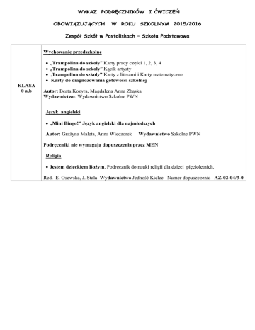 WYKAZ PODRĘCZNIKÓW I ĆWICZEŃ OBOWIĄZUJĄCYCH W ROKU SZKOLNYM 2015/2016 Zespół Szkół w Postoliskach – Szkoła Podstawowa Wychowanie przedszkolne „Trampolina do szkoły” Karty pracy części 1, 2, 3, 4 „Trampolina do szkoły” Kącik artysty „Trampolina do szkoły” Karty z literami i Karty matematyczne Karty do diagnozowania gotowości szkolnej KLASA 0 a,b Autor: Beata Kozyra, Magdalena Anna Zbąska Wydawnictwo: Wydawnictwo Szkolne PWN Język angielski „Mini Bingo!” Język angielski dla najmłodszych Autor: Grażyna Maleta, Anna Wieczorek Wydawnictwo Szkolne PWN Podręczniki nie wymagają dopuszczenia przez MEN Religia Jestem dzieckiem Bożym. Podręcznik do nauki religii dla dzieci pięcioletnich. Red. E. Osewska, J. Stala Wydawnictwo Jedność Kielce Numer dopuszczenia AZ-02-04/3-0 Edukacja wczesnoszkolna Nasz elementarz” Podręcznik do szkoły podstawowej. Klasa 1, części 1, 2, 3, 4 Autor: podręcznik część 1 i 2 M. Lorek, L. Wollman, podręcznik część 3 i 4 M. Lorek, L. Wollman, B. Ochmańska Wydawnictwo: Ministerstwo Edukacji Narodowej „Ćwiczenia z pomysłem”. Klasa 1, części 1, 2, 3, 4 KLASA 1 a,b,c Autor: A. Borchard, J. Brzózka, K. Harmak, K. Izbińska, K. Janiec, A. Jasiocha, A. Chankowska Wydawnictwo: WSiP Język angielski Bugs World 1 Podręcznik dla szkoły podstawowej Autor : C. Read, A. Soberon, M. Kondro Wydawnictwo Macmillan Numer dopuszczenia 30/1/2009/2015 Bugs World 1B Zeszyt ćwiczeń bez elementów pisania Podręczniki i materiały ćwiczeniowe do edukacji wczesnoszkolnej i języka angielskiego są dla uczniów bezpłatne - zamawia je szkoła Religia W imię Ojca i Syna, i Ducha Świętego. Podręcznik dla klasy pierwszej szkoły podstawowej Autor: red. R. Szewczyk, A. Frączak Wydawnictwo Katechetyczne, Warszawa Nr dopuszczenia AZ -11-01/10-WA-1/12 Edukacja wczesnoszkolna „Nasza szkoła. Podręcznik do szkoły podstawowej. Klasa 2. Część 1A.” Autor : Maria Lorek, Monika Zatorska Rok dopuszczenia 2015 „Nasza szkoła. Matematyka. Podręcznik do szkoły podstawowej. Klasa 2. Część 1.” Autor : Maria Lorek, Agata Ludwa Rok dopuszczenia 2015 Wydawnictwo: Ministerstwo Edukacji Narodowej Kolejne 3 części podręcznika będą stopniowo uzyskiwały dopuszczenie MEN KLASA 2 a, b,c „Ćwiczenia z pomysłem. Klasa 2. Część 1,2, 3, 4” „Ćwiczenia z pomysłem. Klasa 2- matematyka, część 1,2,3,4 (praca zbiorowa) Autor: A. Borchard, J. Brzózka, K. Harmak, K. Izbińska, K. Janiec, A. Jasiocha, A. Chankowska Wydawnictwo: WSiP Język angielski Bugs World 2 Podręcznik dla szkoły podstawowej Autor : C. Read, A. Soberon, M. Kondro Wydawnictwo Macmillan Numer dopuszczenia 30/2/2010/2015 Bugs World 2A Zeszyt ćwiczeń doskonalący pisanie Podręczniki i materiały ćwiczeniowe do edukacji wczesnoszkolnej i języka angielskiego są dla uczniów bezpłatne - zamawia je szkoła Religia A oto Ja jestem z wami. Podręcznik katechetyczny dla uczniów klasy drugiej szkoły podstawowej. Autor : Red. R. Szewczyk, A. Frączak Wydawnictwo Diecezji Warszawsko – Praskiej Nr dopuszczenia AZ – 12-01/10-Wa 2/13 Edukacja wczesnoszkolna „Kolorowa klasa. Kształcenie zintegrowane- edukacja wczesnoszkolna . Podręcznik dla klasy III szkoły podstawowej część 1, 2 „Kolorowa klasa. Kształcenie zintegrowane- edukacja wczesnoszkolna. Ćwiczenia, część 1- 6 „Kolorowa klasa” Zeszyty do matematyki części 1 - 6 Autor: K. Sirak- Stopińska, M. Jarząbek, A. Czerkas- Polit, K. Sabbo, H. Gulczyńska, J. Bladowska Ćwiczenia uzupełniające „Kolorowa klasa 3”, części 1,2,3 Autor: K. Nikiel, H. Gulczyńska, K. Sabbo Wydawnictwo Pedagogiczne Operon Język angielski KLASA 3a,b New Sparks Plus 3 . Podręcznik dla szkoły podstawowej. Autor : Magdalena Szpotowicz, Małgorzata Szulc-Kurpaska, P.A. Davies, C. Graham Wydawnictwo : Oxford University Press Polska Sp. z o.o. Numer dopuszczenia 12/3/2011/zl Zeszyt ćwiczeń „New Sparks Plus 3” Religia Kto spożywa moje Ciało , ma życie. Podręcznik katechetyczny dla uczniów klasy trzeciej szkoły podstawowej. Autor : Red. A. Frączak, Ks. R. Szewczyk Wydawnictwo Katechetyczne, Warszawa Nr dopuszczenia AZ-13-01/10-WA-2/14 Podręczniki i materiały ćwiczeniowe do przedmiotów obowiązkowych są dla uczniów bezpłatne zamawia je szkoła. Tylko podręcznik do religii nie jest finansowany przez MEN i szkoła nie zamawia go. Jestem chrześcijaninem. Podręcznik katechetyczny dla uczniów klasy Religia czwartej szkoły podstawowej. Autor : Red. Ks. M. Czyżewski Wydawnictwo Katechetyczne Warszawa Nr dopuszczenia AZ-21-01/10-WA-3/13 Język polski Odkrywamy na nowo Język polski 4. Kształcenie kulturowo-literackie. Podręcznik dla klasy czwartej szkoły podstawowej M. Składanek Numer dopuszczenia 339/1/2011/2015 Wydawnictwo Operon Odkrywamy na nowo Język polski 4. Kształcenie językowe. Podręcznik dla szkoły podstawowej M. Białek Numer dopuszczenia 339/2/2012/2015 Wydawnictwo Operon Bez ćwiczeń KLASA 4 a, b Język angielski Evolution Plus 1. Podręcznik Autor : N. Beare Wydawnictwo Macmillan Polska Sp. z o.o. Numer dopuszczenia 675/1/2014/2015 Evolution Plus 1. Zeszyt ćwiczeń Matematyka Matematyka z plusem - Matematyka 4. Podręcznik dla klasy czwartej szkoły podstawowej M. Dobrowolska, M. Jucewicz, P. Zarzycki Gdańskie Wydawnictwo Oświatowe Numer dopuszczenia 340/1/2015/z1 Matematyka z plusem. Zeszyty ćwiczeń – 2 części(Arytmetyka, Geometria) Historia i społeczeństwo Wczoraj i dziś. Podręcznik do historii i społeczeństwa dla klasy IV szkoły podstawowej G. Wojciechowski Wydawnictwo Nowa Era Numer dopuszczenia 443/1/2012/2015 Wczoraj i dziś Zeszyt ćwiczeń Przyroda Zajęcia komputerowe Lubię to! Podręcznik do zajęć komputerowych dla klasy IV szkoły podstawowej M. Kęska Wydawnictwo Nowa Era Numer dopuszczenia 729/1/2015 Bez ćwiczeń Jak to działa? Podręcznik do zajęć technicznych dla klasy czwartej szkoły podstawowej L. Łabecki, M. Łabecka Wydawni