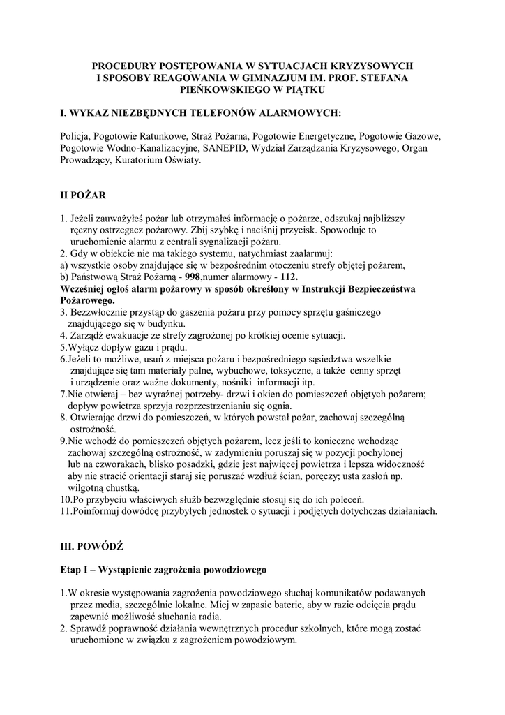 PROCEDURY POSTĘPOWANIA W SYTUACJACH KRYZYSOWYCH I SPOSOBY REAGOWANIA W GIMNAZJUM IM. PROF. STEFANA PIEŃKOWSKIEGO W PIĄTKU I. WYKAZ NIEZBĘDNYCH TELEFONÓW ALARMOWYCH: Policja, Pogotowie Ratunkowe, Straż Pożarna, Pogotowie Energetyczne, Pogotowie Gazowe, Pogotowie Wodno-Kanalizacyjne, SANEPID, Wydział Zarządzania Kryzysowego, Organ Prowadzący, Kuratorium Oświaty. II POŻAR 1. Jeżeli zauważyłeś pożar lub otrzymałeś informację o pożarze, odszukaj najbliższy ręczny ostrzegacz pożarowy. Zbij szybkę i naciśnij przycisk. Spowoduje to uruchomienie alarmu z centrali sygnalizacji pożaru. 2. Gdy w obiekcie nie ma takiego systemu, natychmiast zaalarmuj: a) wszystkie osoby znajdujące się w bezpośrednim otoczeniu strefy objętej pożarem, b) Państwową Straż Pożarną - 998,numer alarmowy - 112. Wcześniej ogłoś alarm pożarowy w sposób określony w Instrukcji Bezpieczeństwa Pożarowego. 3. Bezzwłocznie przystąp do gaszenia pożaru przy pomocy sprzętu gaśniczego znajdującego się w budynku. 4. Zarządź ewakuacje ze strefy zagrożonej po krótkiej ocenie sytuacji. 5.Wyłącz dopływ gazu i prądu. 6.Jeżeli to możliwe, usuń z miejsca pożaru i bezpośredniego sąsiedztwa wszelkie znajdujące się tam materiały palne, wybuchowe, toksyczne, a także cenny sprzęt i urządzenie oraz ważne dokumenty, nośniki informacji itp. 7.Nie otwieraj – bez wyraźnej potrzeby- drzwi i okien do pomieszczeń objętych pożarem; dopływ powietrza sprzyja rozprzestrzenianiu się ognia. 8. Otwierając drzwi do pomieszczeń, w których powstał pożar, zachowaj szczególną ostrożność. 9.Nie wchodź do pomieszczeń objętych pożarem, lecz jeśli to konieczne wchodząc zachowaj szczególną ostrożność, w zadymieniu poruszaj się w pozycji pochylonej lub na czworakach, blisko posadzki, gdzie jest najwięcej powietrza i lepsza widoczność aby nie stracić orientacji staraj się poruszać wzdłuż ścian, poręczy; usta zasłoń np. wilgotną chustką. 10.Po przybyciu właściwych służb bezwzględnie stosuj się do ich poleceń. 11.Poinformuj dowódcę przybyłych jednostek o sytuacji i podjętych dotychczas działaniach. III. POWÓDŹ Etap I – Wystąpienie zagrożenia powodziowego 1.W okresie występowania zagrożenia powodziowego słuchaj komunikatów podawanych przez media, szczególnie lokalne. Miej w zapasie baterie, aby w razie odcięcia prądu zapewnić możliwość słuchania radia. 2. Sprawdź poprawność działania wewnętrznych procedur szkolnych, które mogą zostać uruchomione w związku z zagrożeniem powodziowym. Etap II – Po otrzymaniu informacji o wystąpieniu możliwości zalania budynku szkoły 1.Po wstępnej ocenie sytuacji zarządź przeprowadzenie ewakuacji: * zapewnij opiekę i nadzór nad uczniami podczas ewakuacji i w miejscu docelowym * w miarę możliwości powiadom rodziców o miejscu przebywania dzieci *prowadź listę dzieci odbieranych przez rodziców. 2. Wyłącz lub zleć osobie odpowiedzialnej wyłączenie dopływu gazu i prądu. 3.Przenieś wartościowe rzeczy w bezpieczne miejsca (na wyższe kondygnacje lub poza budynek szkoły w zależności od stopnia zagrożenia). 4. Zabezpiecz budynek szkoły przed zalaniem poprzez uszczelnienie drzwi i innych nisko położonych otworów(m.in. kanalizacja). 5. W miarę możliwości dokumentuj prowadzone działania i informuj o nich Samorząd Lokalny i Kuratorium Oświaty. IV. CHOROBA ZAKAŹNA 1.Po otrzymaniu informacji o niebezpiecznej chorobie zakaźnej u ucznia lub pracownika szkoły należy potwierdzić tę wiadomość u lekarza-jeśli to możliwe lub w SANEPID- zie. 2. Ustal z dyżurującym inspektorem sanitarnym sposób postępowania. 3. Zawiadom Samorząd Lokalny i Kuratorium Oświaty. 4. Nadzoruj przestrzeganie zaleceń służb sanitarnych przez pracowników szkoły i uczniów. 5. Przygotuj informację dla uczniów i rodziców przy współpracy Powiatowej Stacji Sanitarno-Epidemiologicznej. 6. Zorganizuj (w razie potrzeby) spotkanie rodziców z lekarzem chorób zakaźnych lub przedstawicielem Powiatowej Stacji Sanitarno-Epidemiologicznej. V. PODEJRZANY PRZEDMIOT LUB PRZESYŁKA W SZKOLE 1. Odizoluj miejsce lub zabezpiecz pomieszczenie. 2. Zadbaj o zamknięcie okien, wyłączenie systemów wentylacji i klimatyzacji, by nie powodować ruchu powietrza w pomieszczeniu. 3. Przykryj uszkodzony, podejrzany przedmiot lub przesyłkę, gdy zawiera jakąkolwiek podejrzaną zawartość w formie: płynnej lub stałej (proszek, pył, galareta, piana lub inne). 4. Zadzwoń lub wyznacz osobę, która zadzwoni pod jeden z poniższych numerów alarmowych: 997,112. 5. Ustal, które osoby miały kontakt z podejrzanym przedmiotem, przesyłką. 6. Zadbaj, by osoby te dokładnie umyły ręce. 7. Zgromadź te osoby w jednym pomieszczeniu i przypilnuj, by z nikim się nie kontaktowały i pozostały tam do przybycia służb. VI. ZAGROŻENIE TERRORYSTYCZNE a) Wtargnięcie napastników do obiektu 1. Poddaj się woli napastników-wykonuj ściśle ich polecenia. 2. Staraj się zwrócić uwagę napastników na fakt, że mają do czynienia z ludźmi . 3. Pytaj zawsze o pozwolenie, np., gdy chcesz się zwrócić do uczniów z jakimś poleceniem. 4.Zapamiętaj szczegóły dotyczące porywaczy i otoczenia – informacje te mogą okazać się cenne dla służb ratowniczych. 5.Staraj się uspokoić dzieci –zapanuj w miarę możliwości nad własnymi emocjami. 6. Dopóki nie zostanie wydane polecenie wyjścia nie pozwól dzieciom wychodzić z pomieszczenia oraz wyglądać przez drzwi i okna; nakaż dzieciom położyć się na podłodze. 7. W chwili podjęcia działań zmierzających do uwolnienia, wykonuj polecenia grupy antyterrorystycznej. 8. Po zakończeniu akcji sprawdź obecność dzieci celem upewnienia się, czy wszyscy opuścili budynek ; o braku któregokolwiek dziecka poinformuj Policję; nie pozwól żadnemu z dzieci samodzielnie wrócić do domu; prowadź ewidencję dzieci odbieranych przez rodziców/osoby upowa