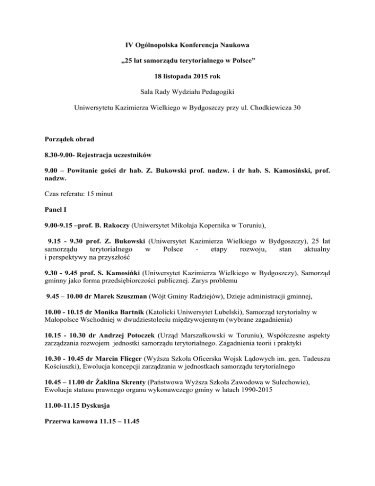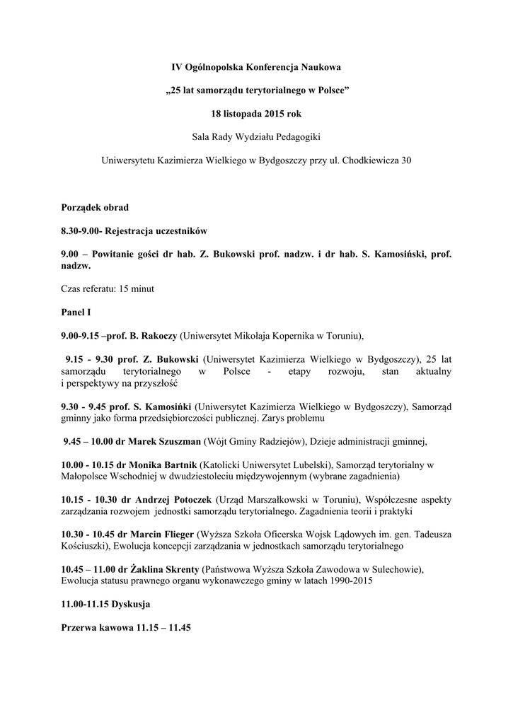 IV Ogólnopolska Konferencja Naukowa „25 lat samorządu terytorialnego w Polsce” 18 listopada 2015 rok Sala Rady Wydziału Pedagogiki Uniwersytetu Kazimierza Wielkiego w Bydgoszczy przy ul. Chodkiewicza 30 Porządek obrad 8.30-9.00- Rejestracja uczestników 9.00 – Powitanie gości dr hab. Z. Bukowski prof. nadzw. i dr hab. S. Kamosiński, prof. nadzw. Czas referatu: 15 minut Panel I 9.00-9.15 –prof. B. Rakoczy (Uniwersytet Mikołaja Kopernika w Toruniu), 9.15 - 9.30 prof. Z. Bukowski (Uniwersytet Kazimierza Wielkiego w Bydgoszczy), 25 lat samorządu terytorialnego w Polsce etapy rozwoju, stan aktualny i perspektywy na przyszłość 9.30 - 9.45 prof. S. Kamosińki (Uniwersytet Kazimierza Wielkiego w Bydgoszczy), Samorząd gminny jako forma przedsiębiorczości publicznej. Zarys problemu 9.45 – 10.00 dr Marek Szuszman (Wójt Gminy Radziejów), Dzieje administracji gminnej, 10.00 - 10.15 dr Monika Bartnik (Katolicki Uniwersytet Lubelski), Samorząd terytorialny w Małopolsce Wschodniej w dwudziestoleciu międzywojennym (wybrane zagadnienia) 10.15 - 10.30 dr Andrzej Potoczek (Urząd Marszałkowski w Toruniu), Współczesne aspekty zarządzania rozwojem jednostki samorządu terytorialnego. Zagadnienia teorii i praktyki 10.30 - 10.45 dr Marcin Flieger (Wyższa Szkoła Oficerska Wojsk Lądowych im. gen. Tadeusza Kościuszki), Ewolucja koncepcji zarządzania w jednostkach samorządu terytorialnego 10.45 – 11.00 dr Żaklina Skrenty (Państwowa Wyższa Szkoła Zawodowa w Sulechowie), Ewolucja statusu prawnego organu wykonawczego gminy w latach 1990-2015 11.00-11.15 Dyskusja Przerwa kawowa 11.15 – 11.45 Panel II 11.45-12.00 Monika Kilan (Urząd Statystyczny w Bydgoszczy), Rola wynikowych informacji statystycznych w obrazowaniu zmian społeczno-gospodarczych 12.00-12.15 Robert Buciak (Główny Urząd Statystyczny), Możliwości badania statystycznego budżetów partycypacyjnych w Polsce 12.15-12.30 Karolina Goś-Wójcicka (Główny Urząd Statystyczny), Partycypacja społeczna na poziomie lokalnym – konstruowanie nowych wskaźników statystycznych 12.30 – 12.45 dr Wojciech Lis (Katolicki Uniwersytet Lubelski), Środki nadzoru nad działalnością jednostek samorządu terytorialnego” 12.45-13.00 mgr Jacek Ronowicz (Uniwersytet im. Adama Mickiewicza w Poznaniu), Ewolucja zarządzenia zastępczego wojewody jako aktu nadzoru nad działalnością jednostek samorządu terytorialnego w latach 1990-2015 12.45-13.00 – Dyskusja 13.30 – 14.30 Przerwa ul. Chodkiewicza 30 obiadowa, Restauracja Uniwersytecka „U Niny” Panel III 14.30 – 14.45 mgr inż. Tadeusz Jakub Chruściel (Społeczna Akademia Nauk w Łodzi), Znaczenie form organizacyjno-prawnych operatorów usług komunalnych w ekonomicznym rozwoju jednostek samorządowych 14.45 – 15.00 mgr Tomasz Kowalczyk (Uniwersytet Mikołaja Kopernika), Ewolucja systemu wyborczego w wyborach Wójta, Burmistrza albo Prezydenta Miasta 15.00-15.15 mgr Jacek Wojciechowski (Uniwersytet Mikołaja Kopernika), Ewolucja kryminalizacji zachowań przeciwko wyborom samorządowym w pozakodeksowym prawie karnym 15.15-15.30 Marek Barszcz, (student Uniwersytetu Kazimierza Wielkiego w Bydgoszczy), Umowy cywilnoprawne w polityce zatrudnienia gmin 15.30 – 15.45 Dyskusja, Podsumowanie obrad 16.00 Kolacja (bufet szwedzki)