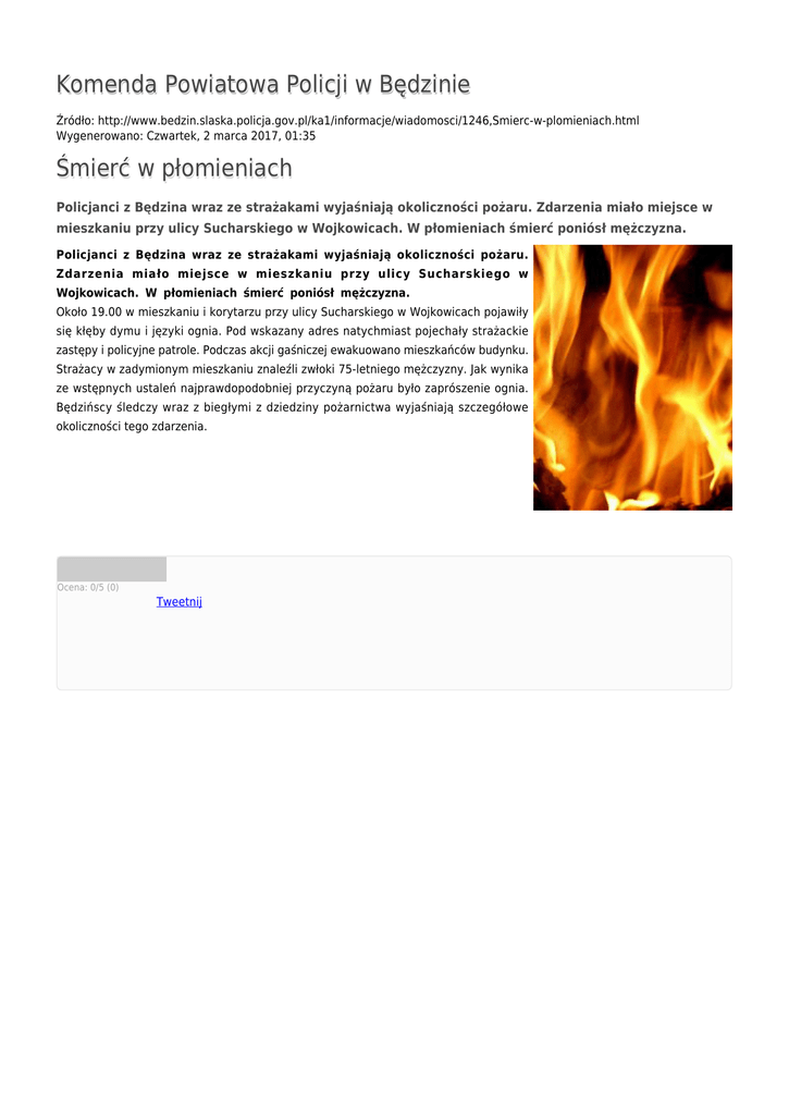 Komenda Powiatowa Policji w Będzinie Źródło: http://www.bedzin.slaska.policja.gov.pl/ka1/informacje/wiadomosci/1246,Smierc-w-plomieniach.html Wygenerowano: Czwartek, 2 marca 2017, 01:35 Śmierć w płomieniach Policjanci z Będzina wraz ze strażakami wyjaśniają okoliczności pożaru. Zdarzenia miało miejsce w mieszkaniu przy ulicy Sucharskiego w Wojkowicach. W płomieniach śmierć poniósł mężczyzna. Policjanci z Będzina wraz ze strażakami wyjaśniają okoliczności pożaru. Zdarzenia miało miejsce w mieszkaniu przy ulicy Sucharskiego w Wojkowicach. W płomieniach śmierć poniósł mężczyzna. Około 19.00 w mieszkaniu i korytarzu przy ulicy Sucharskiego w Wojkowicach pojawiły się kłęby dymu i języki ognia. Pod wskazany adres natychmiast pojechały strażackie zastępy i policyjne patrole. Podczas akcji gaśniczej ewakuowano mieszkańców budynku. Strażacy w zadymionym mieszkaniu znaleźli zwłoki 75-letniego mężczyzny. Jak wynika ze wstępnych ustaleń najprawdopodobniej przyczyną pożaru było zaprószenie ognia. Będzińscy śledczy wraz z biegłymi z dziedziny pożarnictwa wyjaśniają szczegółowe okoliczności tego zdarzenia. Ocena: 0/5 (0) Tweetnij